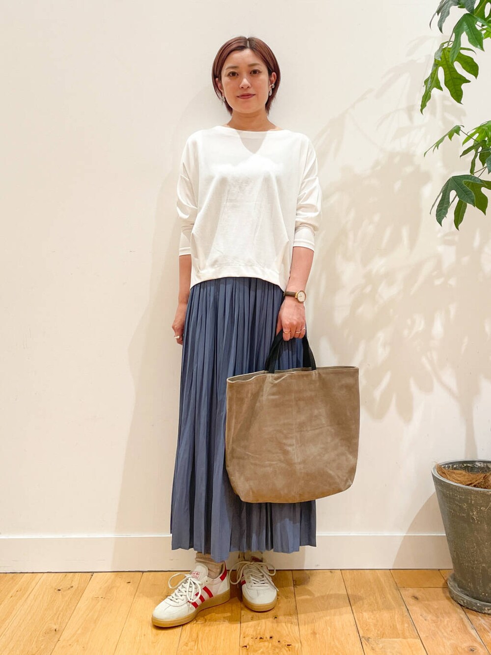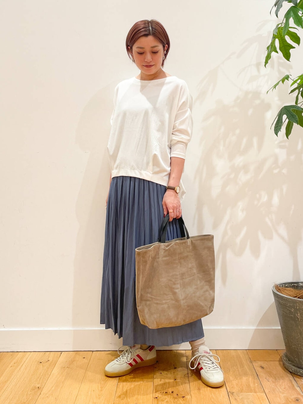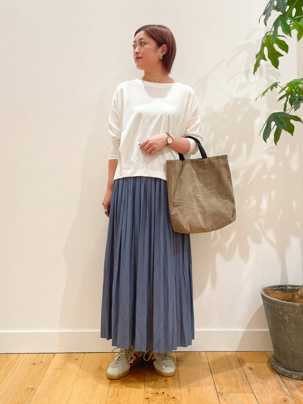 テロっとしたランダムプリーツのスカートと合わせて少しキレイめなコーディネートに。
