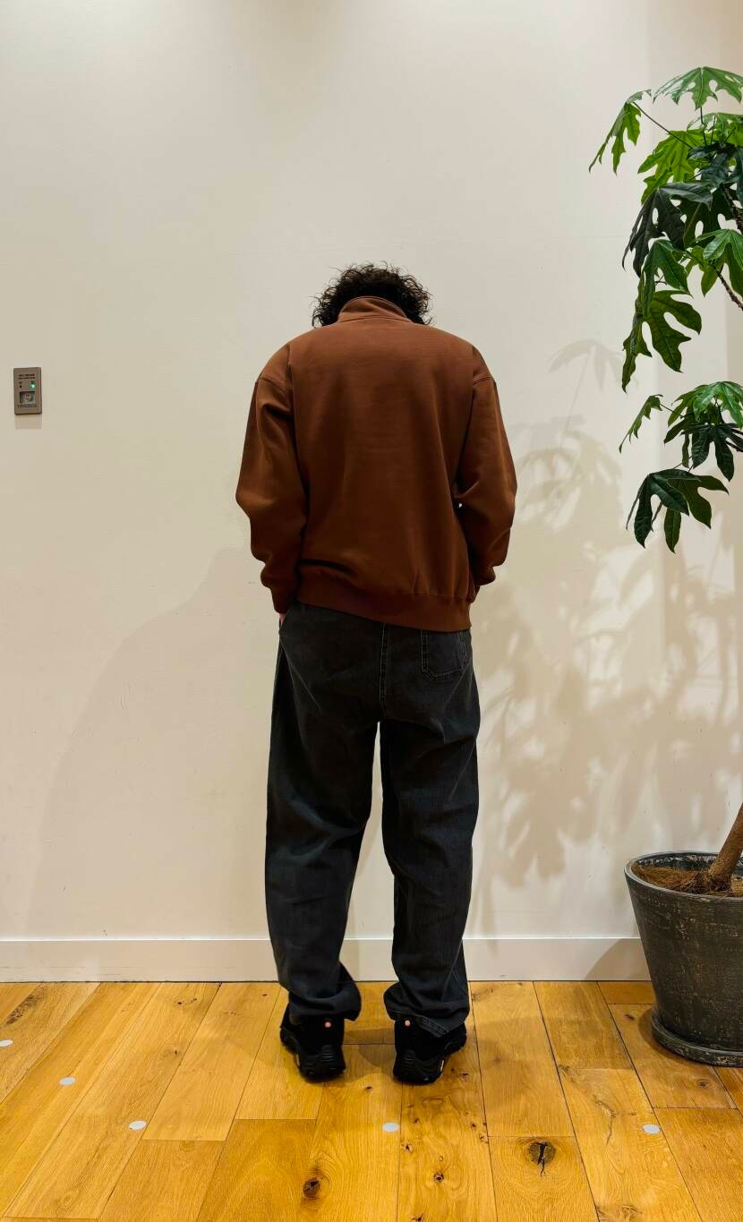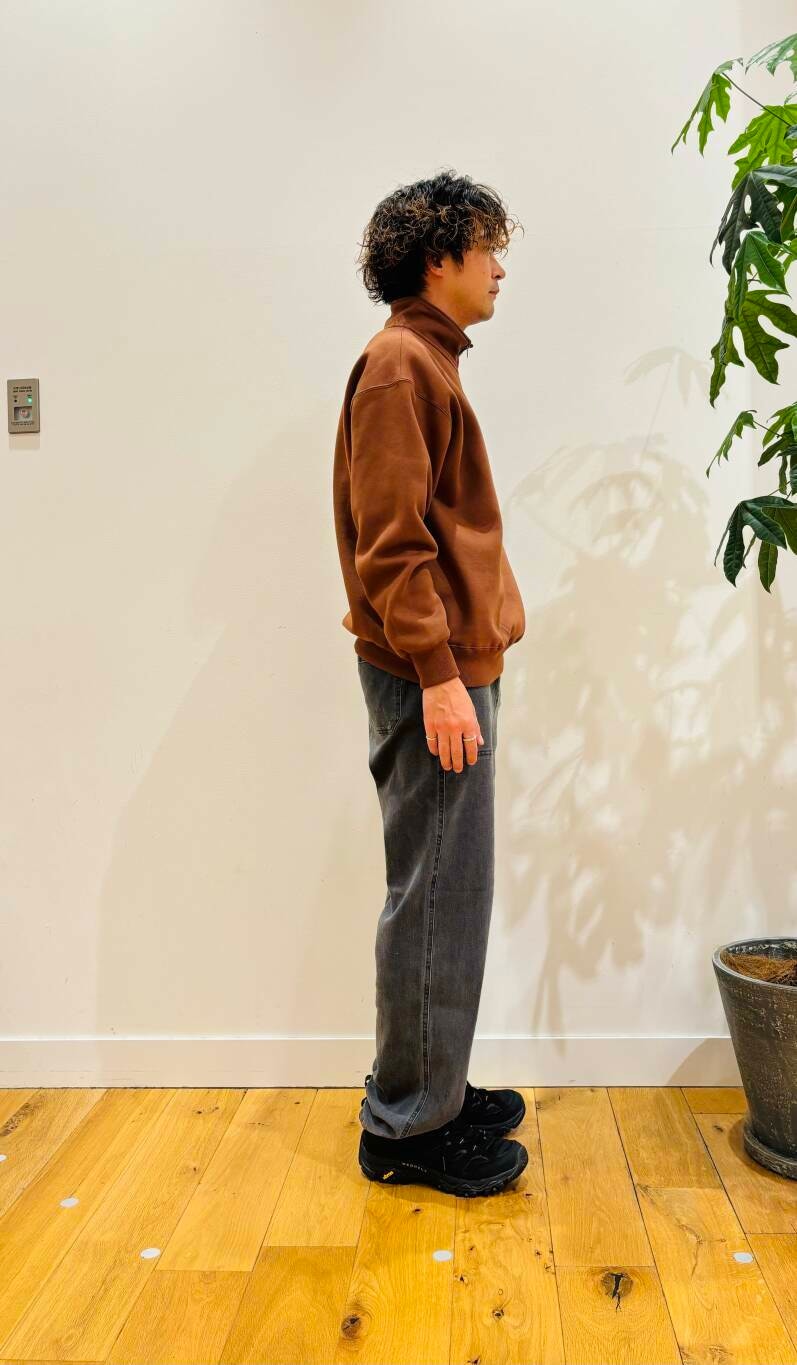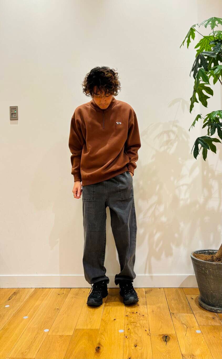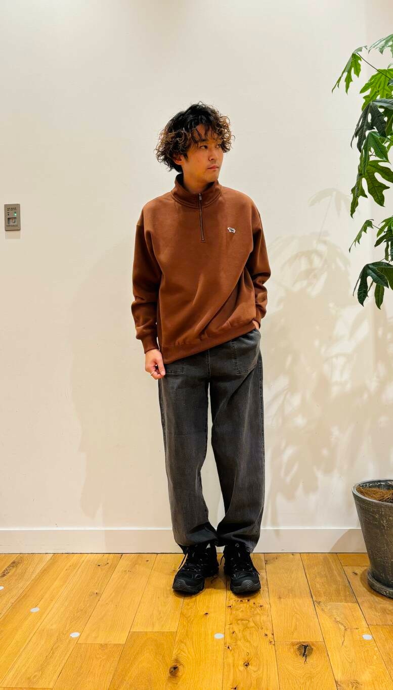 今回は、ワンポイントのアクセントもあり着やすさのあるハーフジップのアイテムでコーディネートを組んでみました。