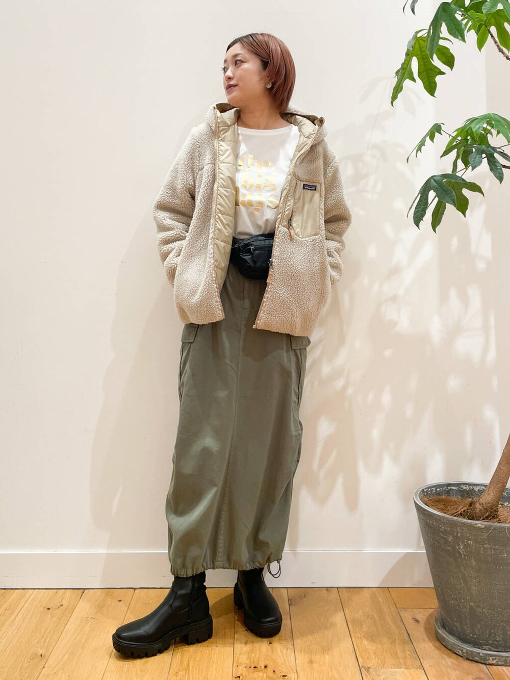 カジュアルだけど大人っぽいシルエットのカーゴスカートにシンプルなロゴTを合わせました。