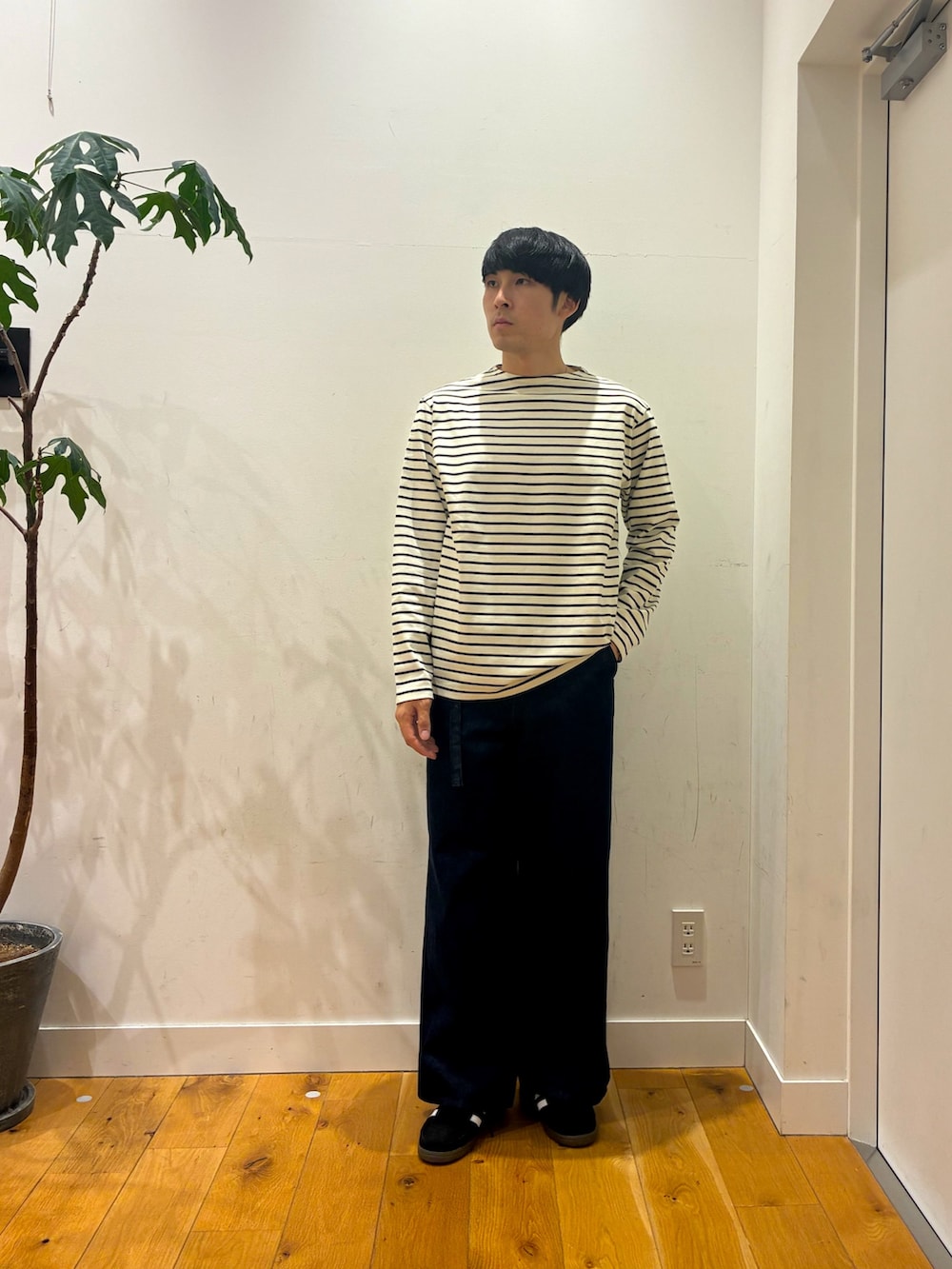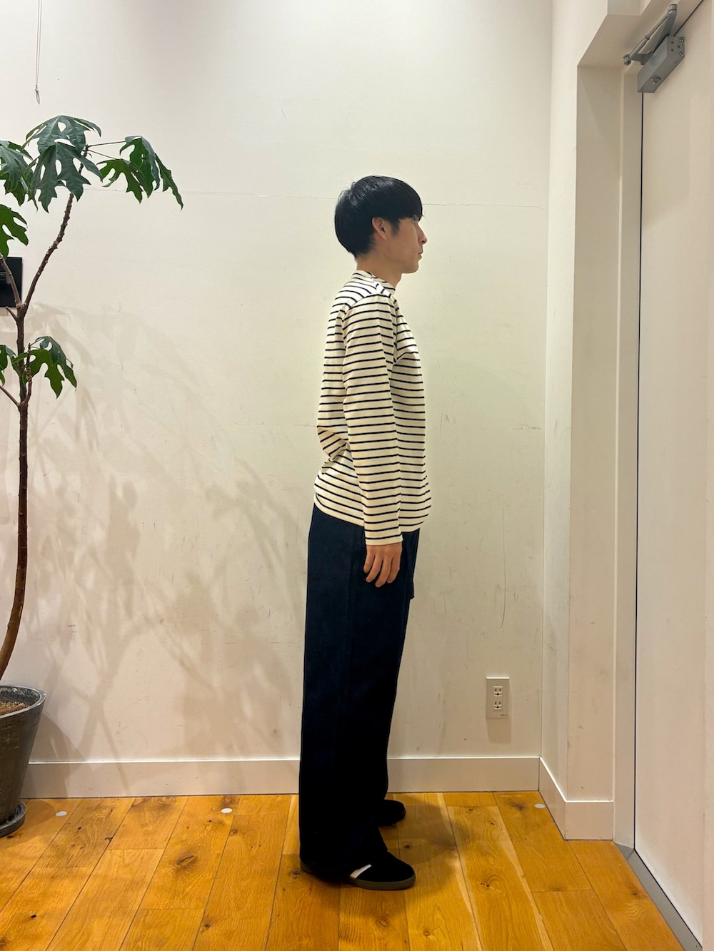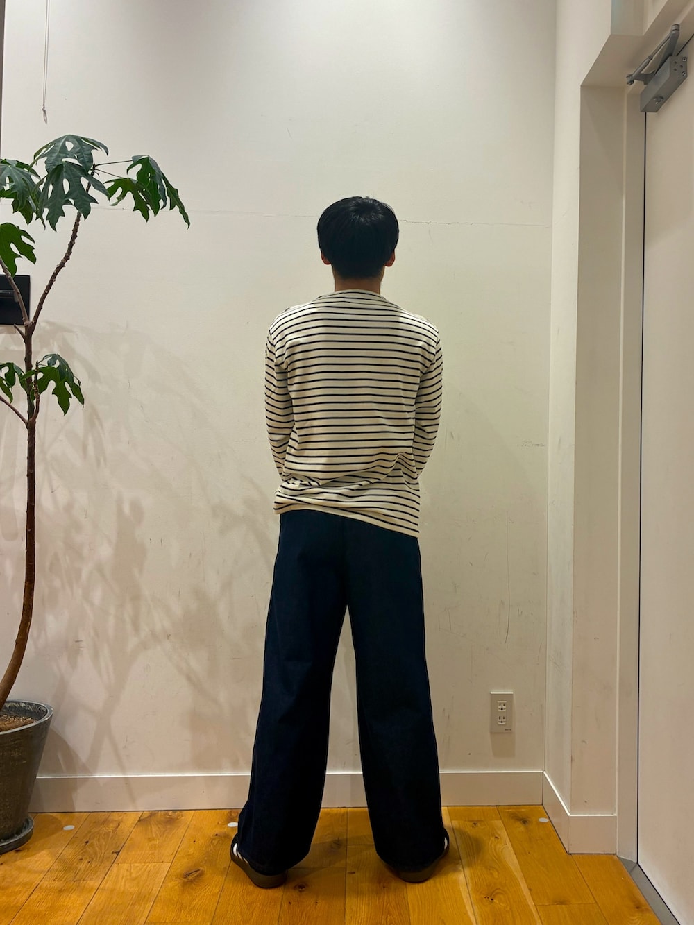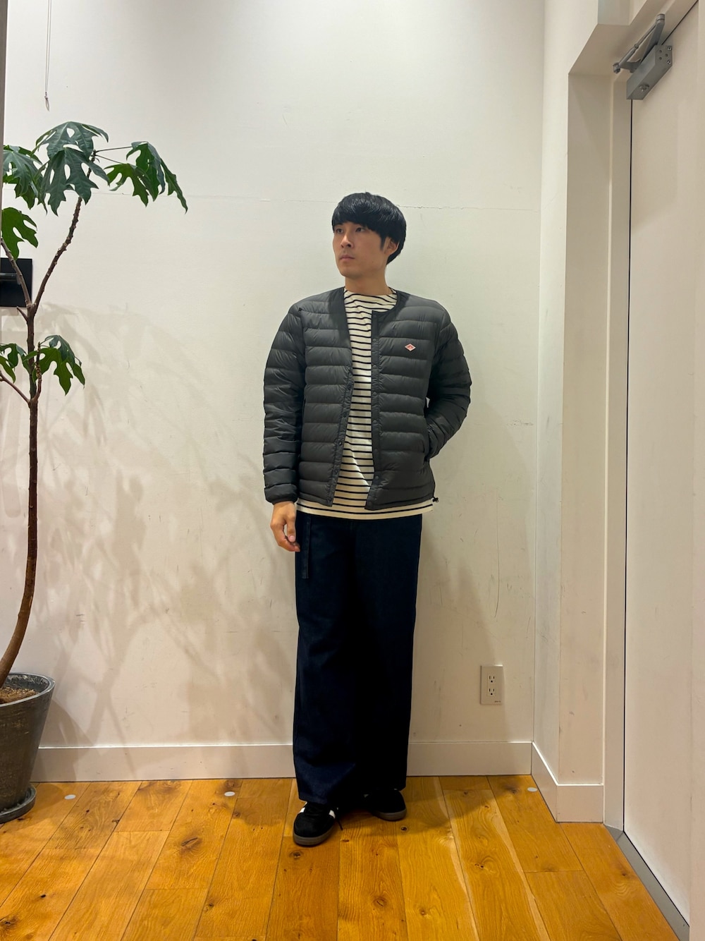 今回は秋、冬コーデになっています!暗めのジーンズにボーダーロンTで落ち着いた雰囲気を出してその上にダントンのノーカラーダウンを着て見ました!とても軽くて暖かくワンポイントのロゴがいいです!又、ボーダーロンTはオーガニックコットンを使用している為、肌触りがとてもいいです!