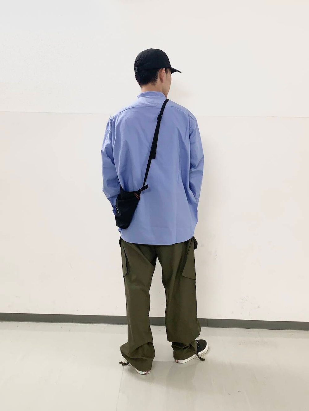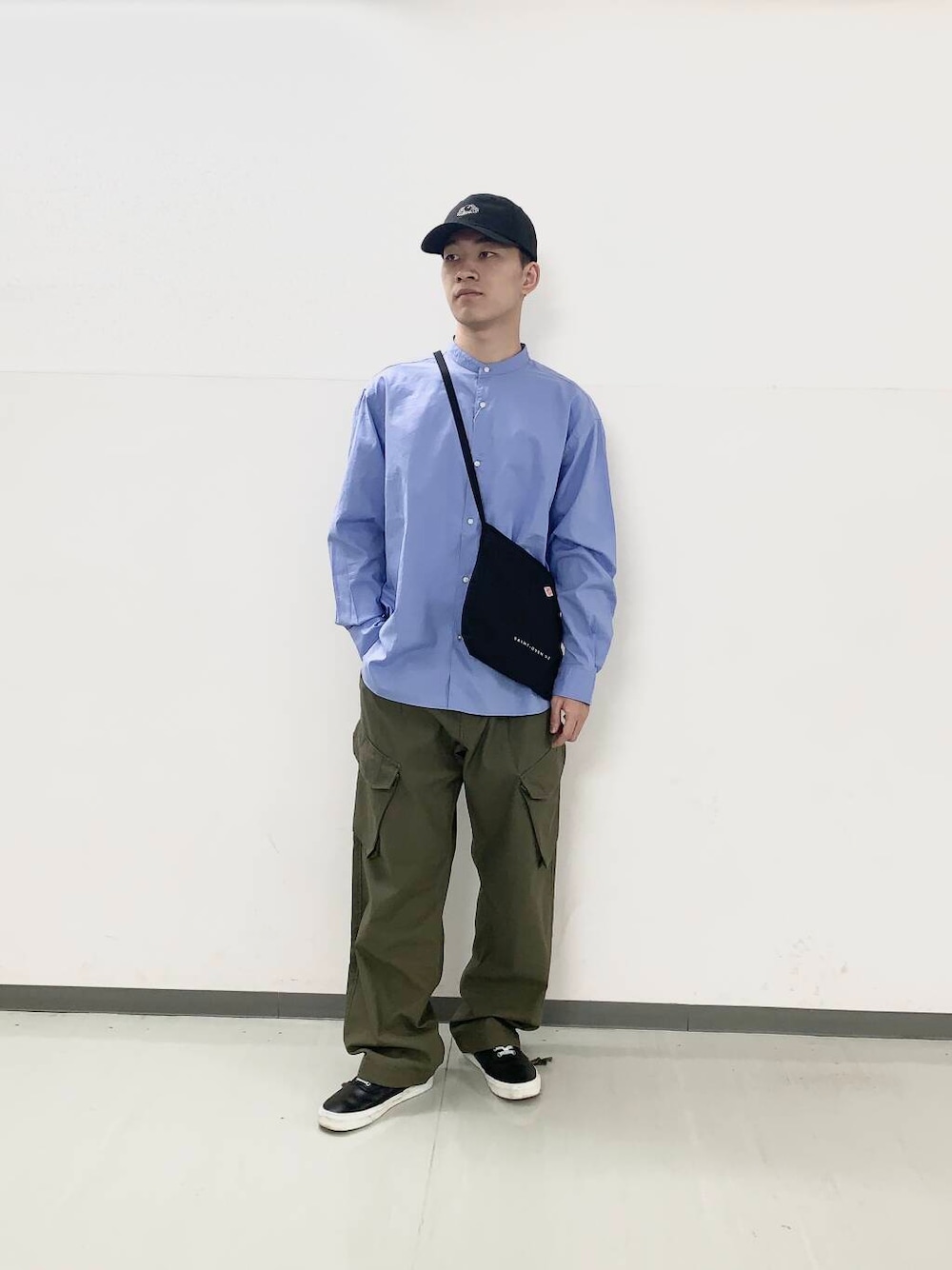今回はバンドカラーシャツとカーゴパンツでコーデを組んでみました。