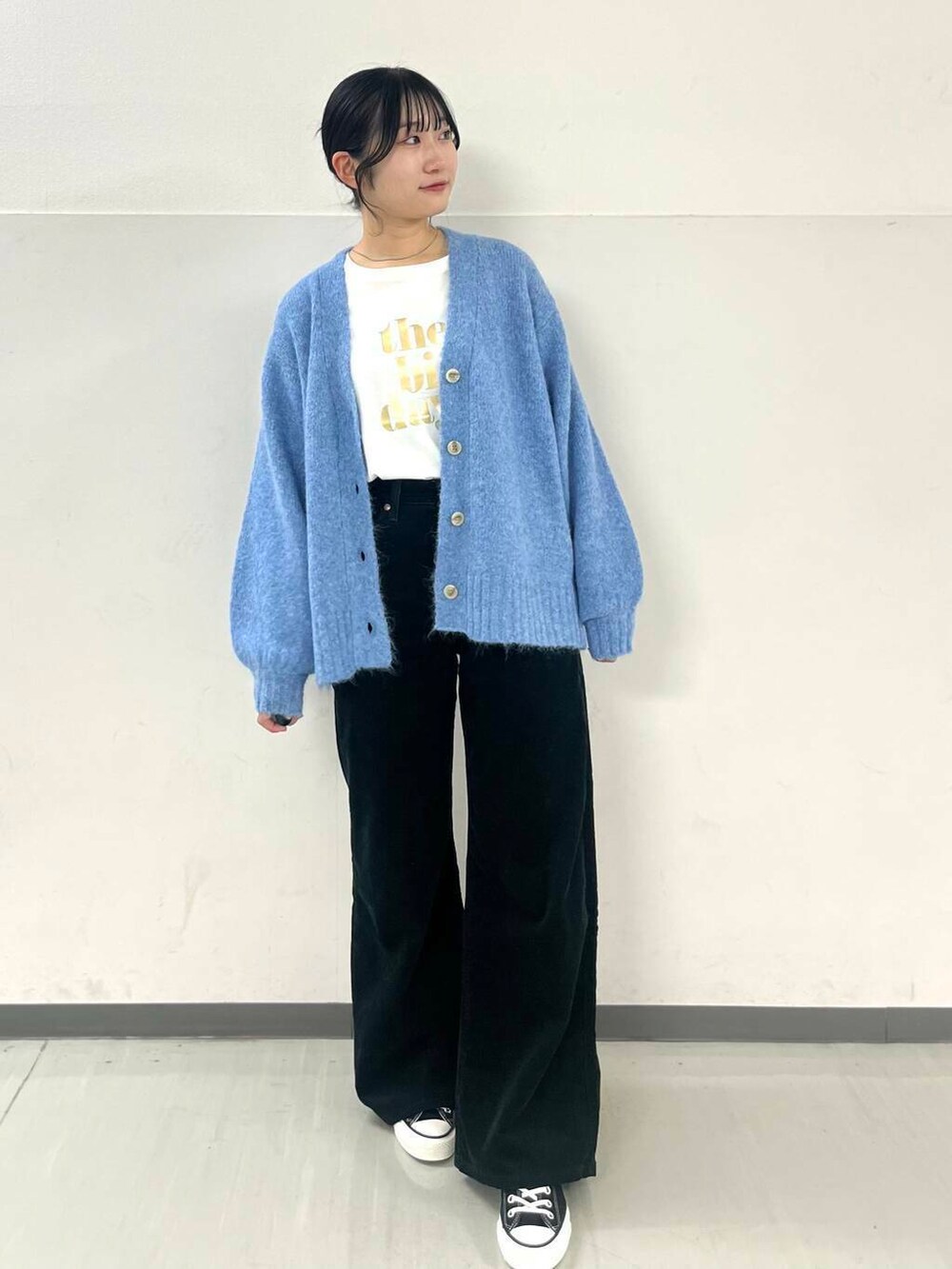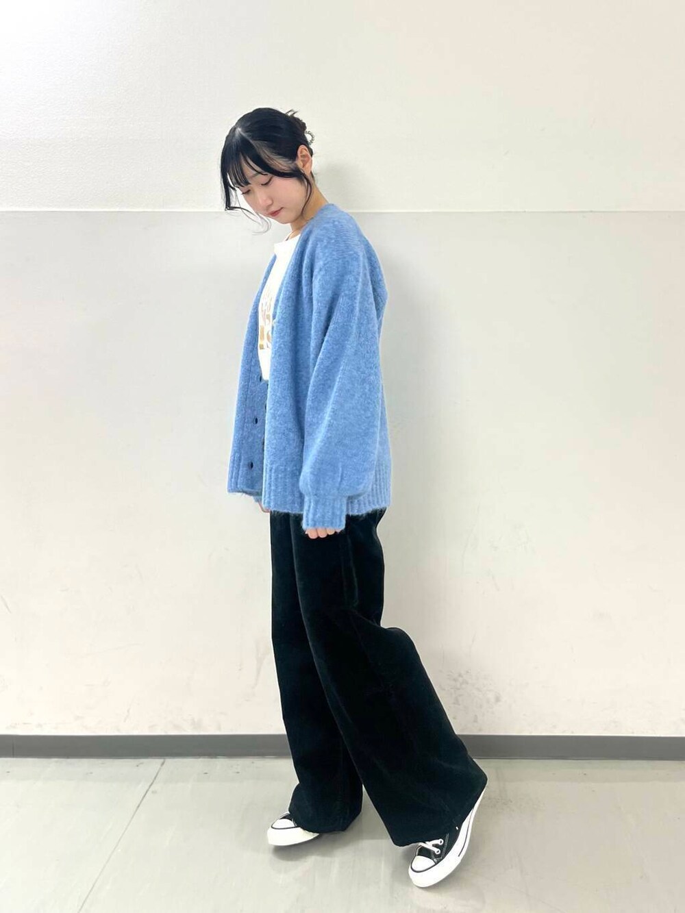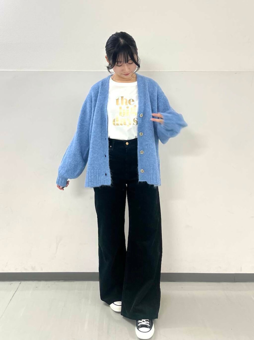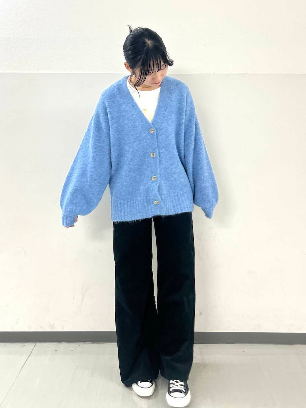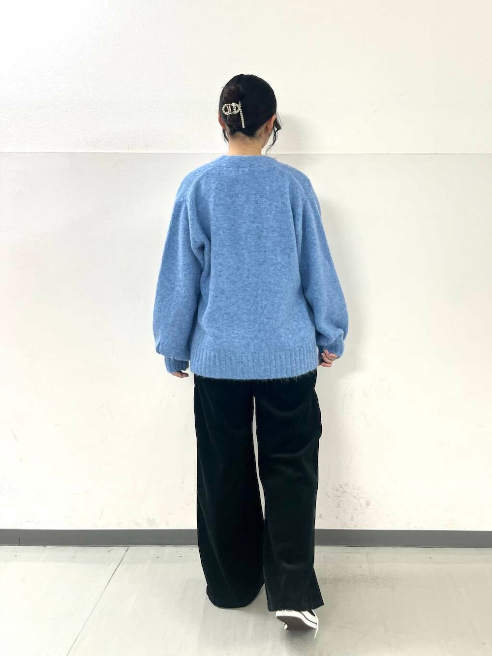 明るめのブルーのお色味にざっくりとしたシルエットのカーディガンは、前を閉めても開けて着てもバランスよく収まります🩵!