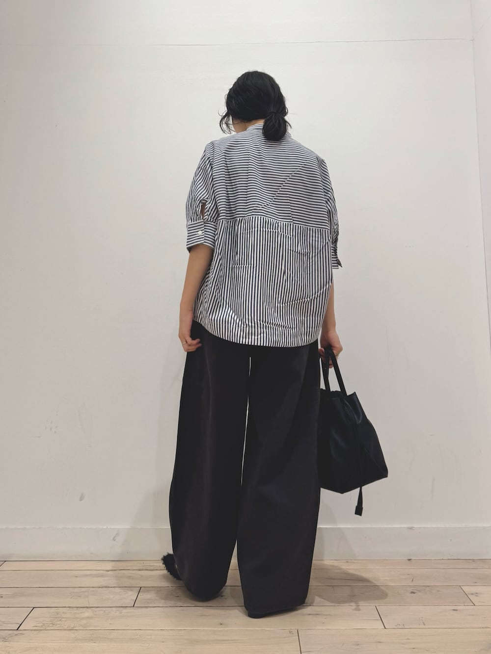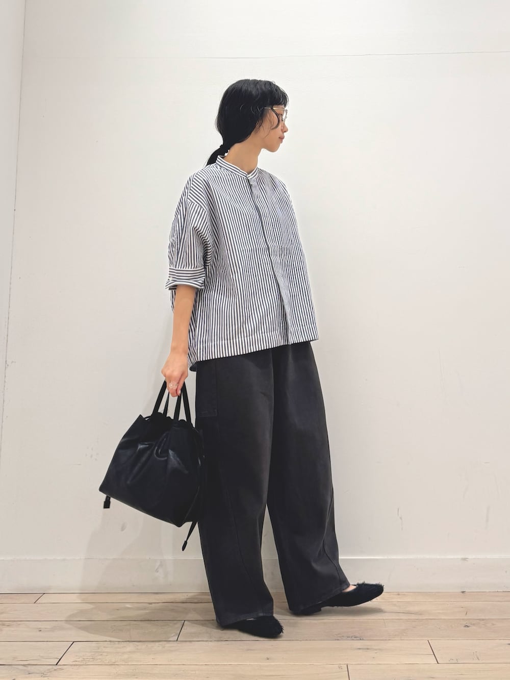 首元のギボシボタンがポイントのシャツです。ストライプ柄でスッキリ見えしつつ、コクーンシルエットで肌離れがよく、動きやすいです◎
