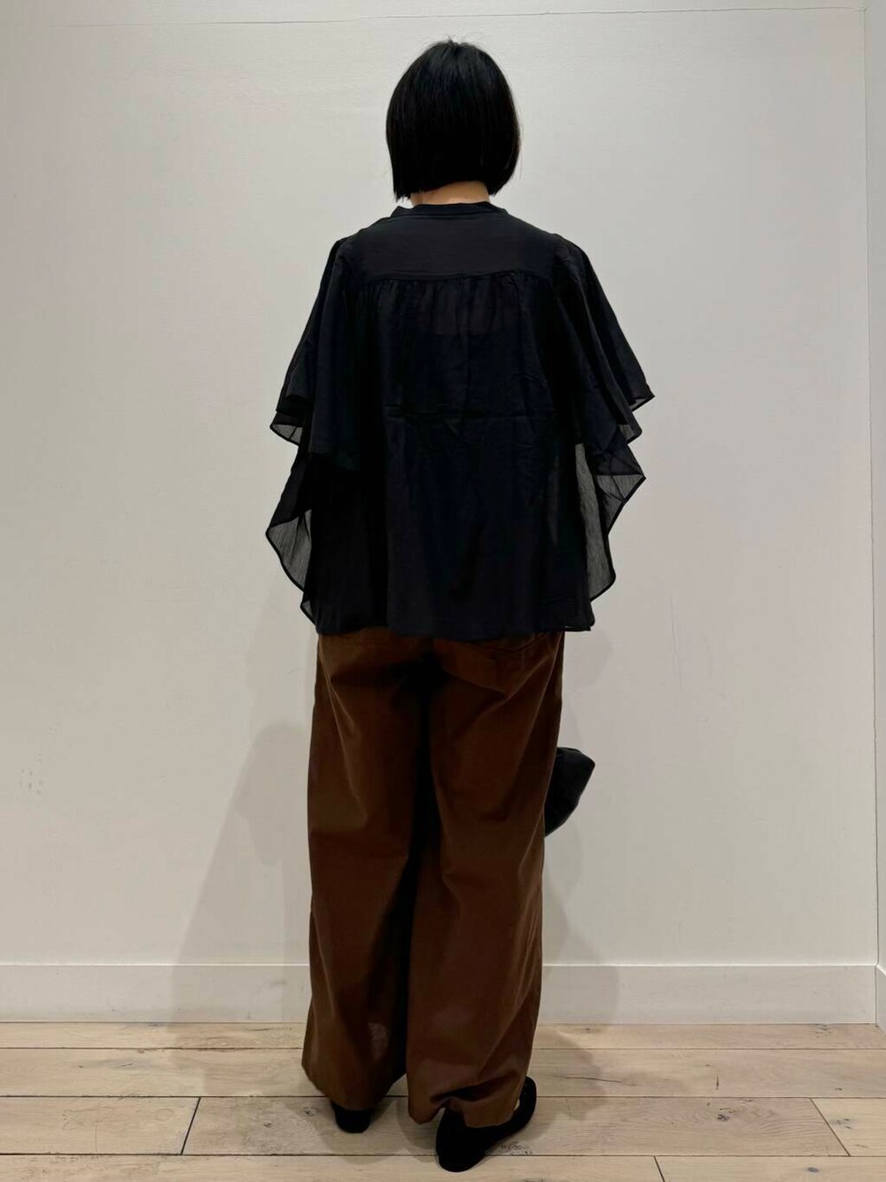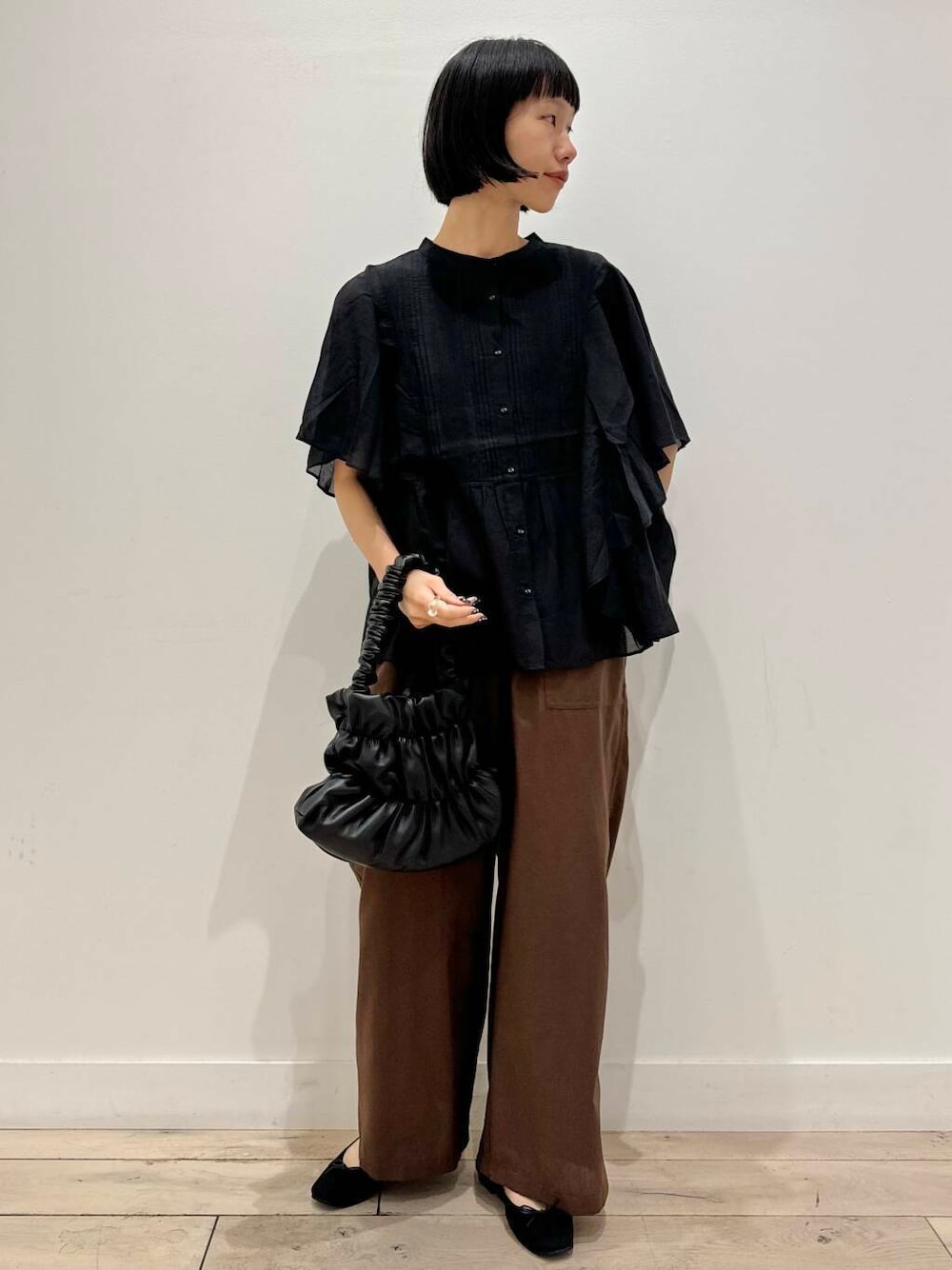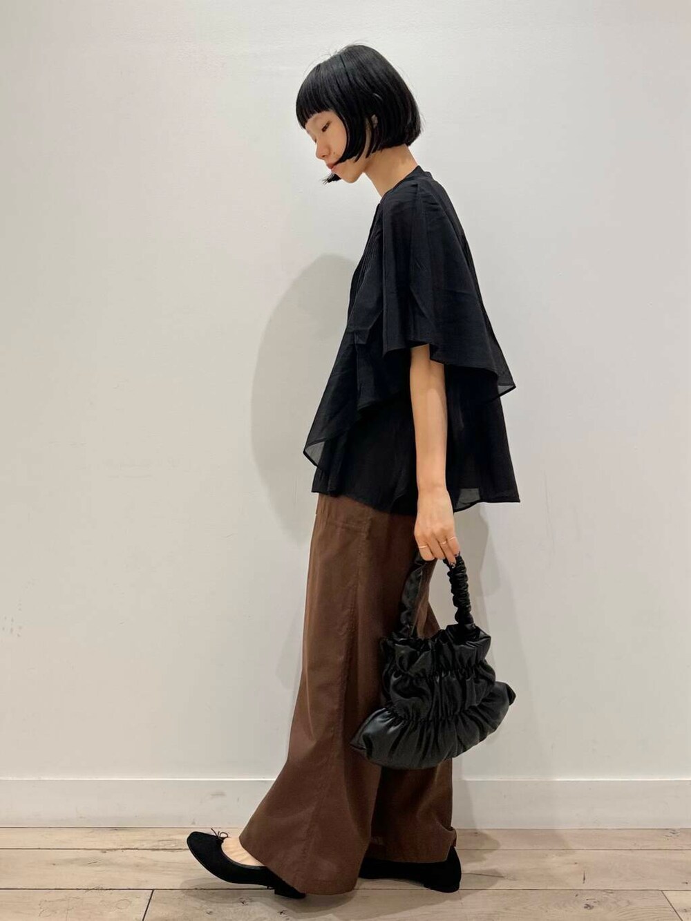 秋感出したくてボトム以外は黒でまとめました。フレアブラウスに透け感あるので、重たく見えないです^ ^