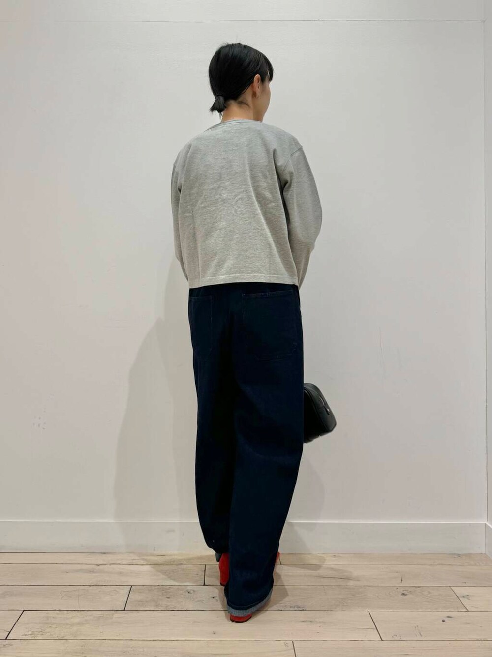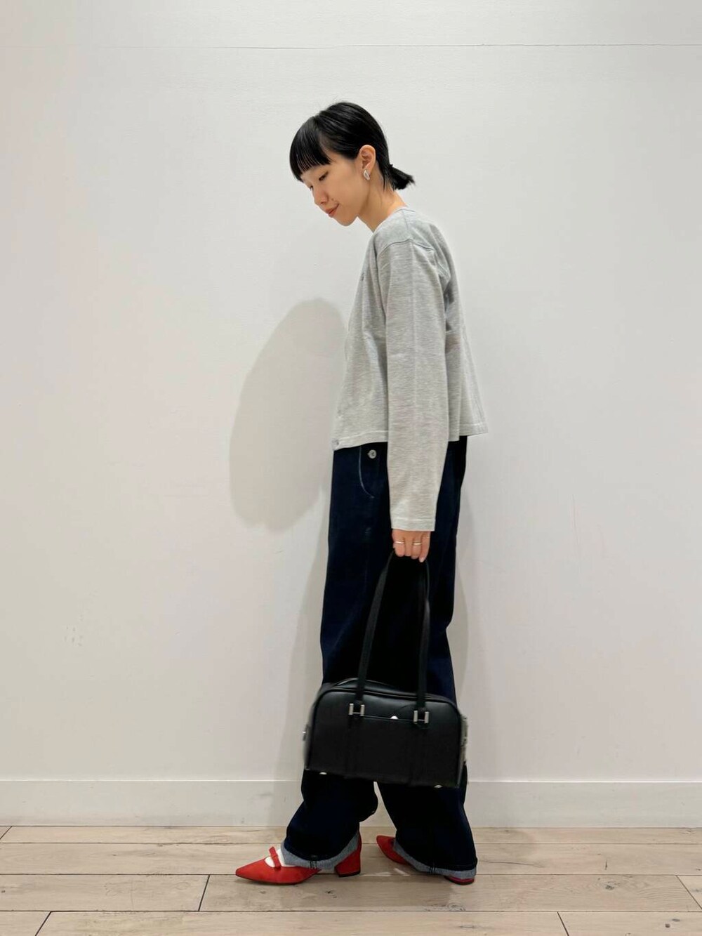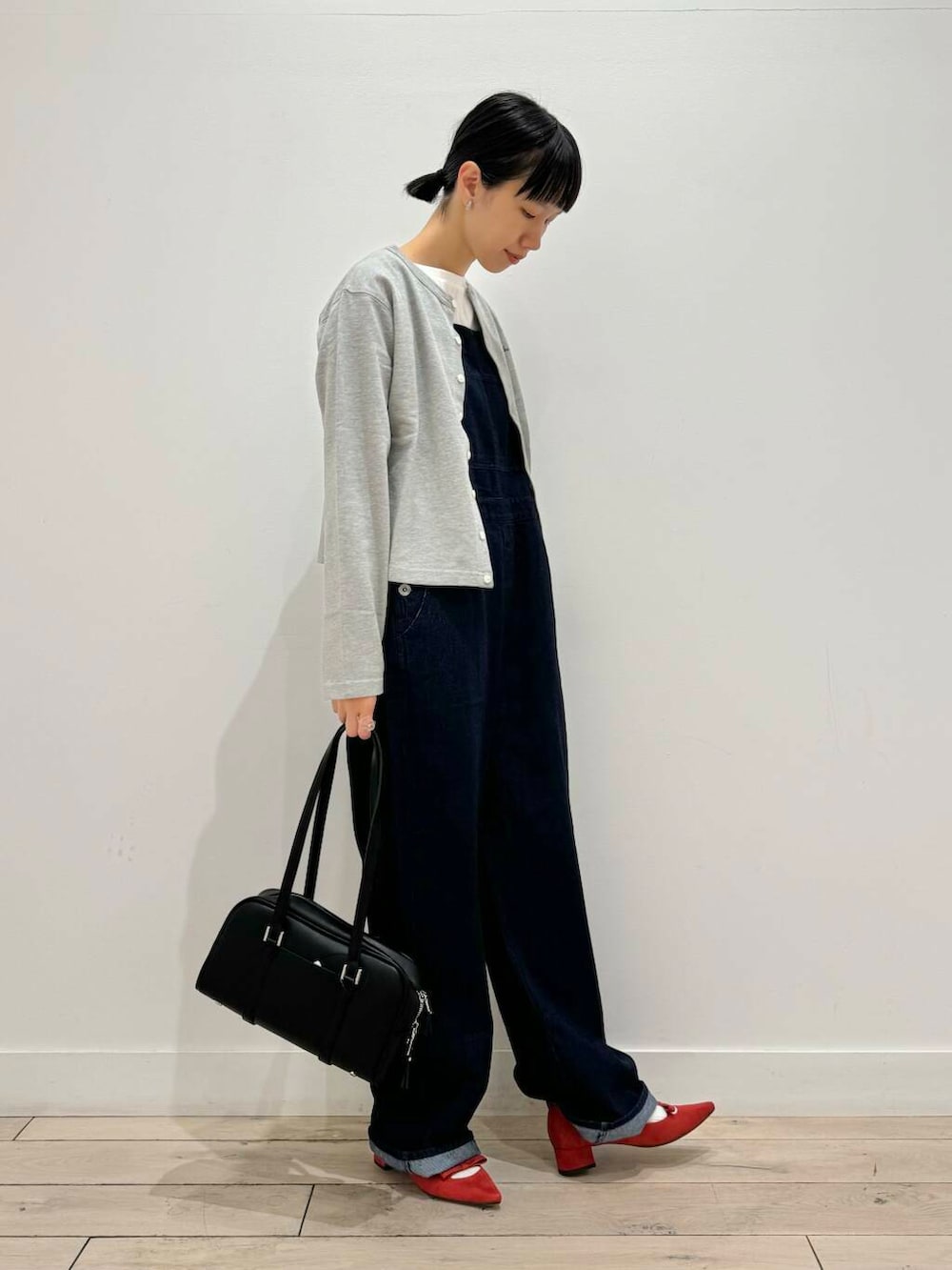 シンプルなデニムサロペットコーデに赤のリボンパンプスでポイントを入れました🎀