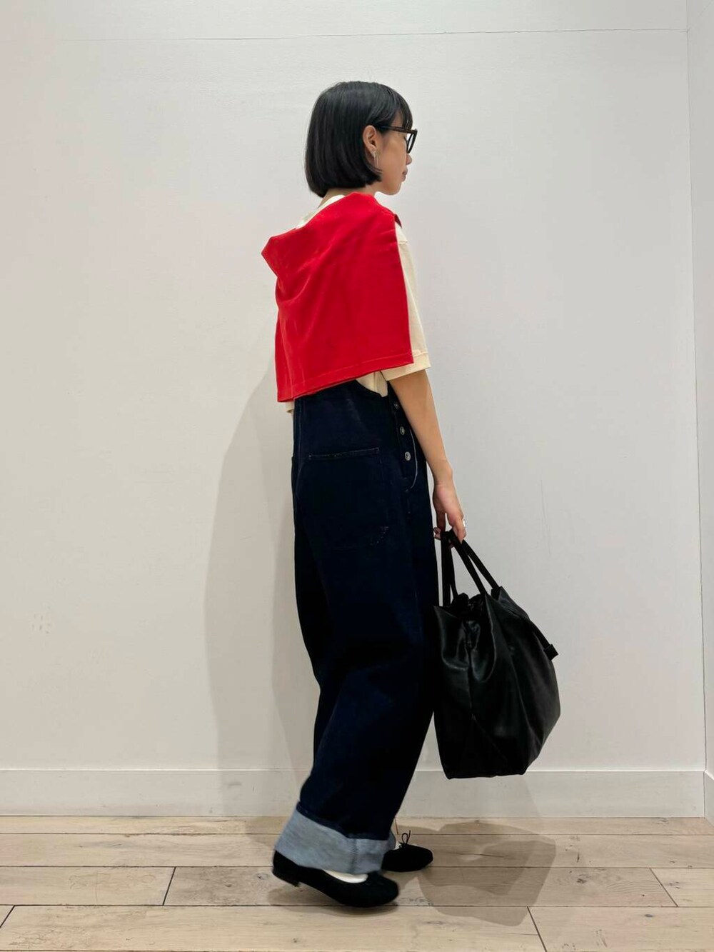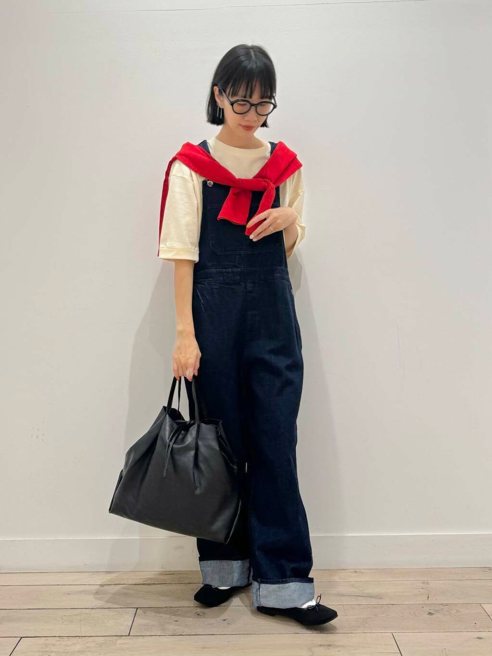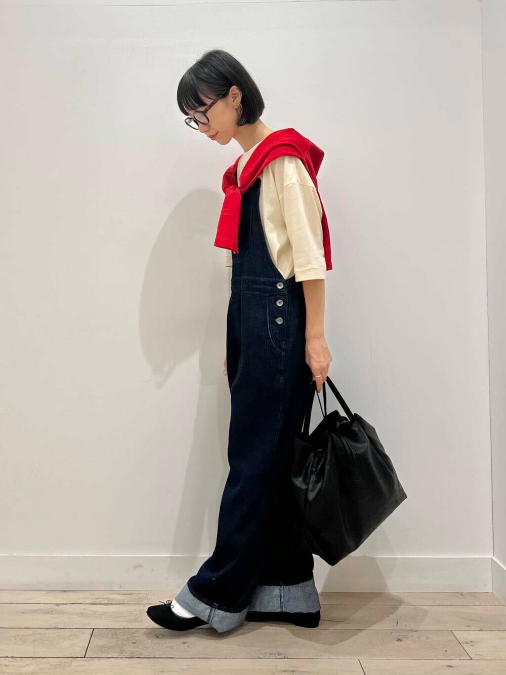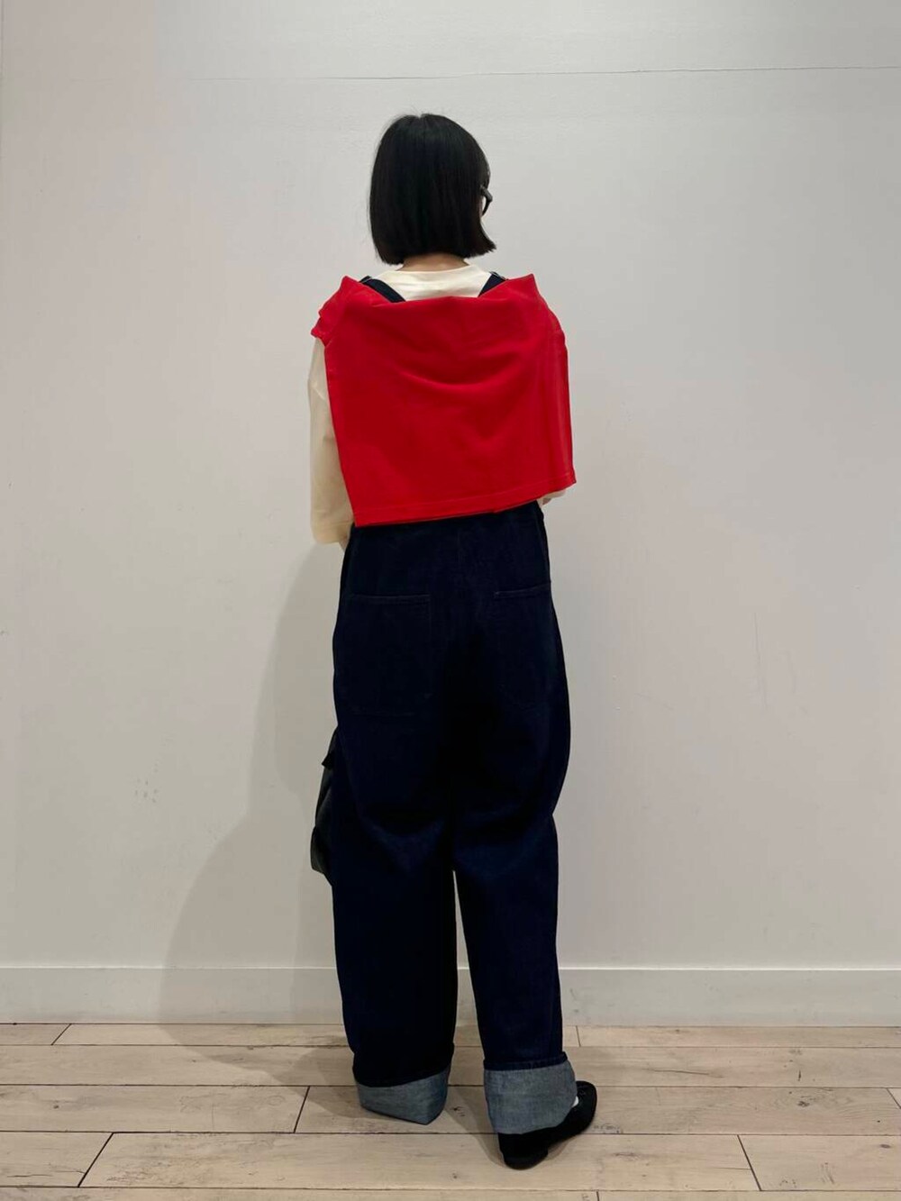 デニムサロペットに赤カーディガンで季節感出しました!肩にかけてても、羽織ってもかわいい組み合わせです◎