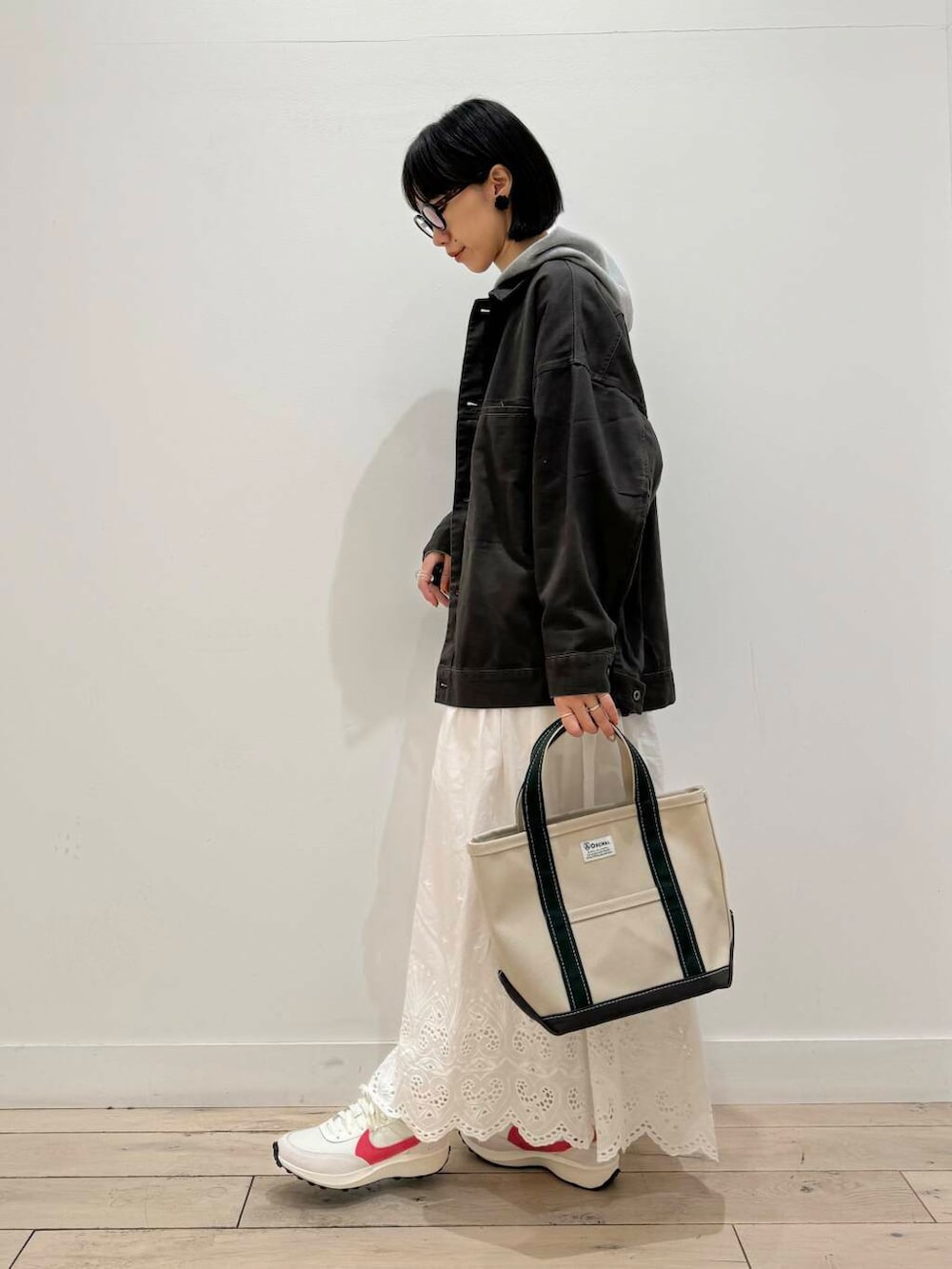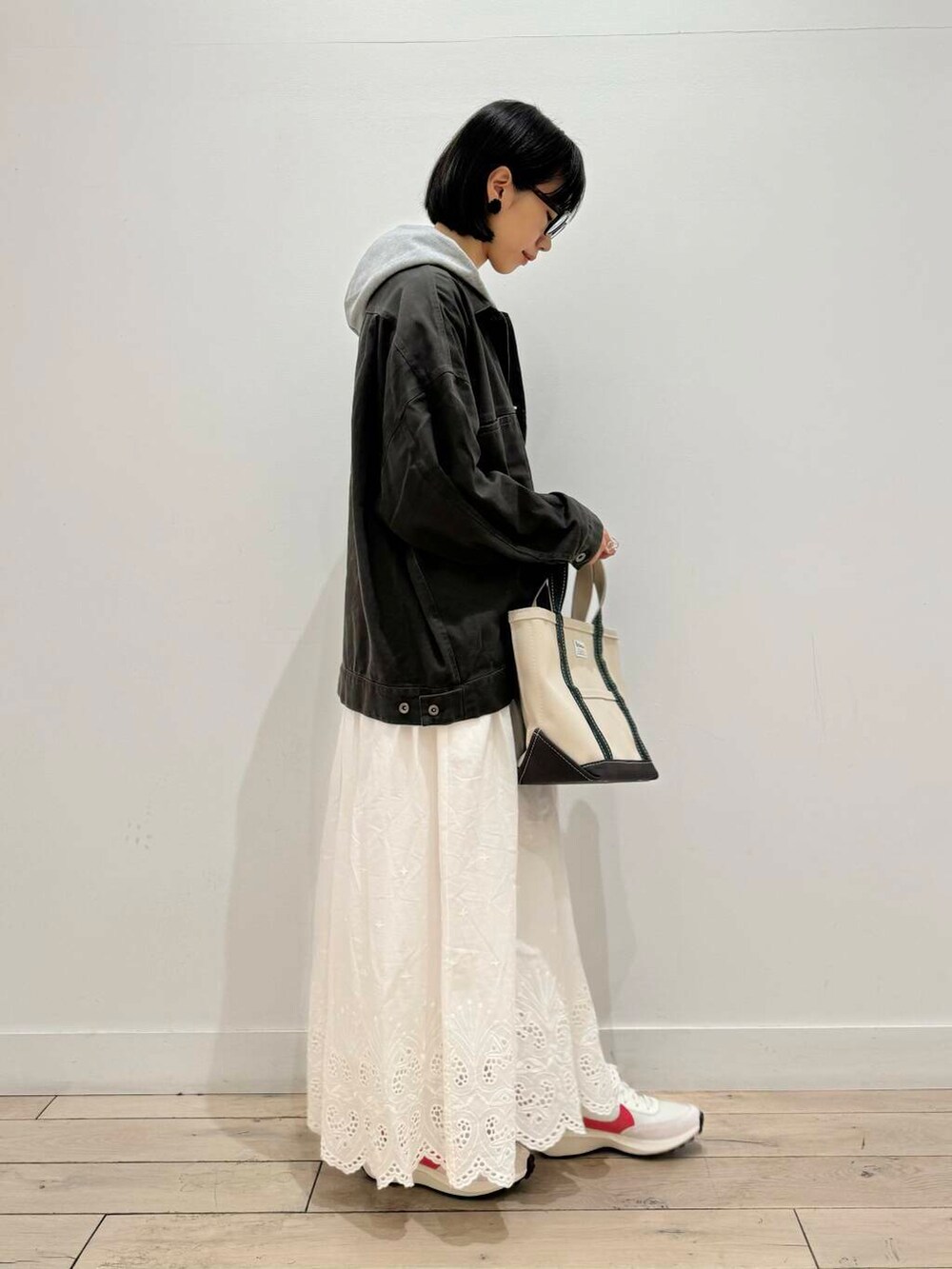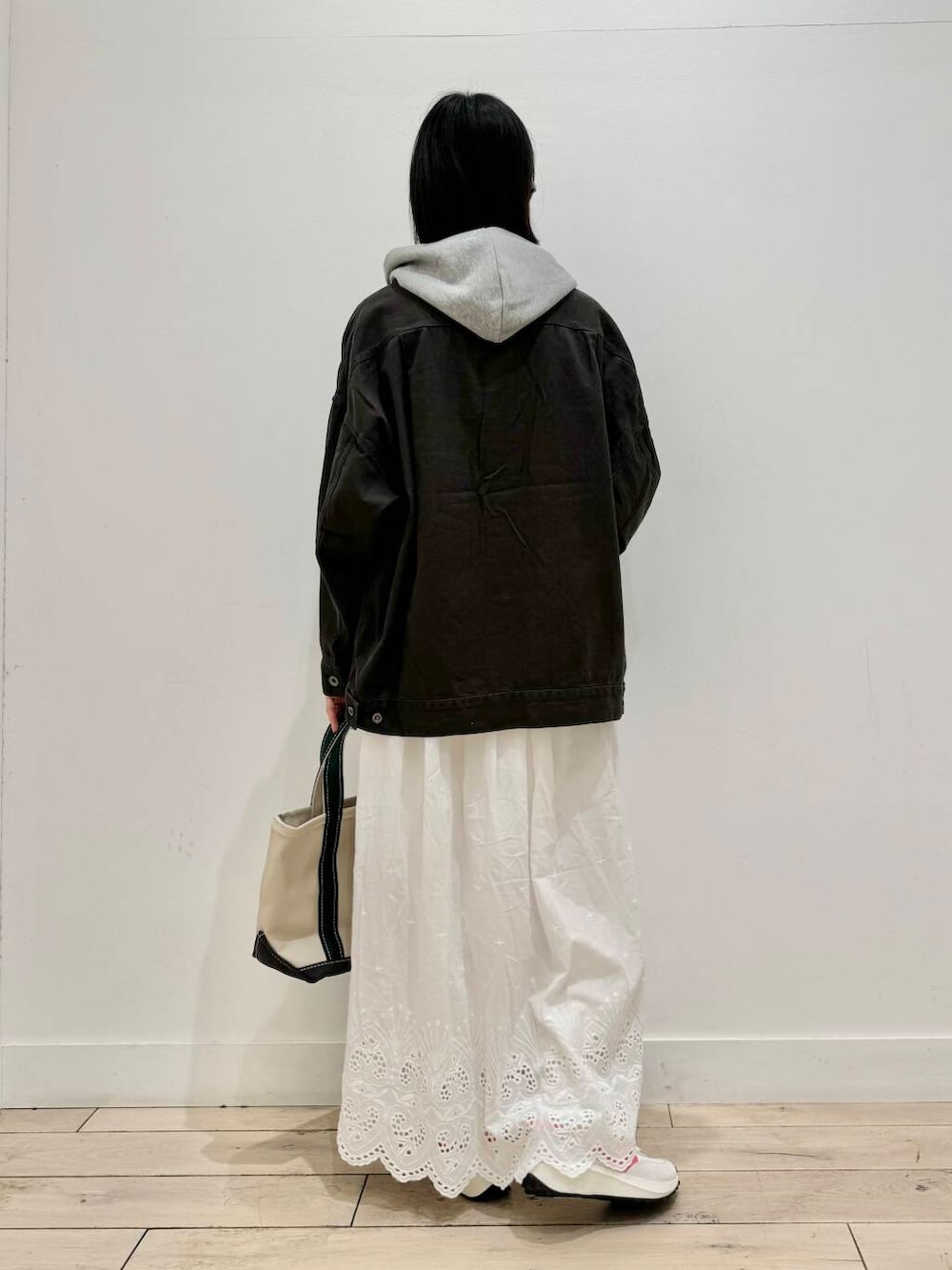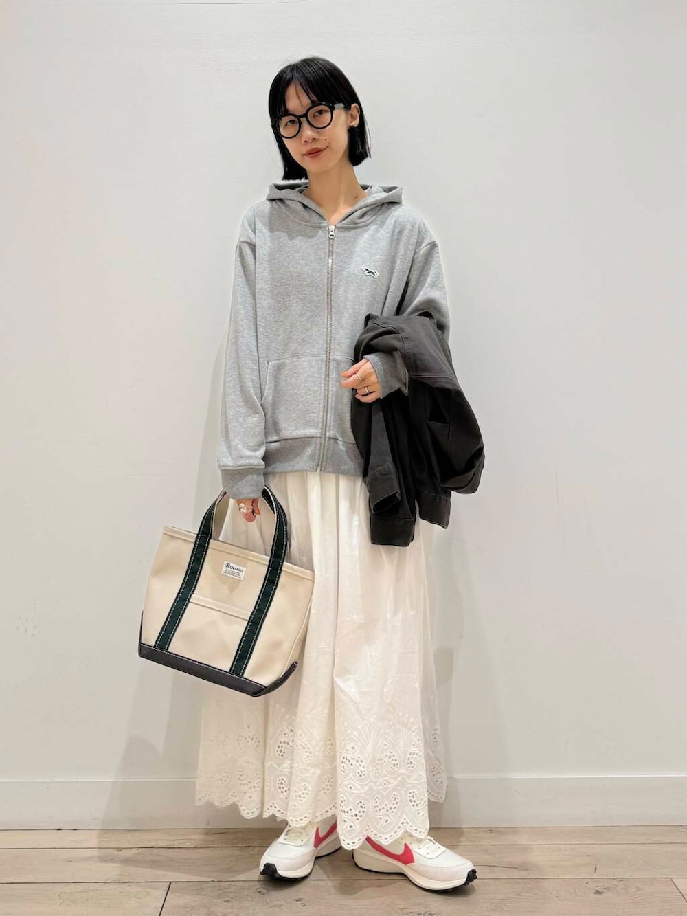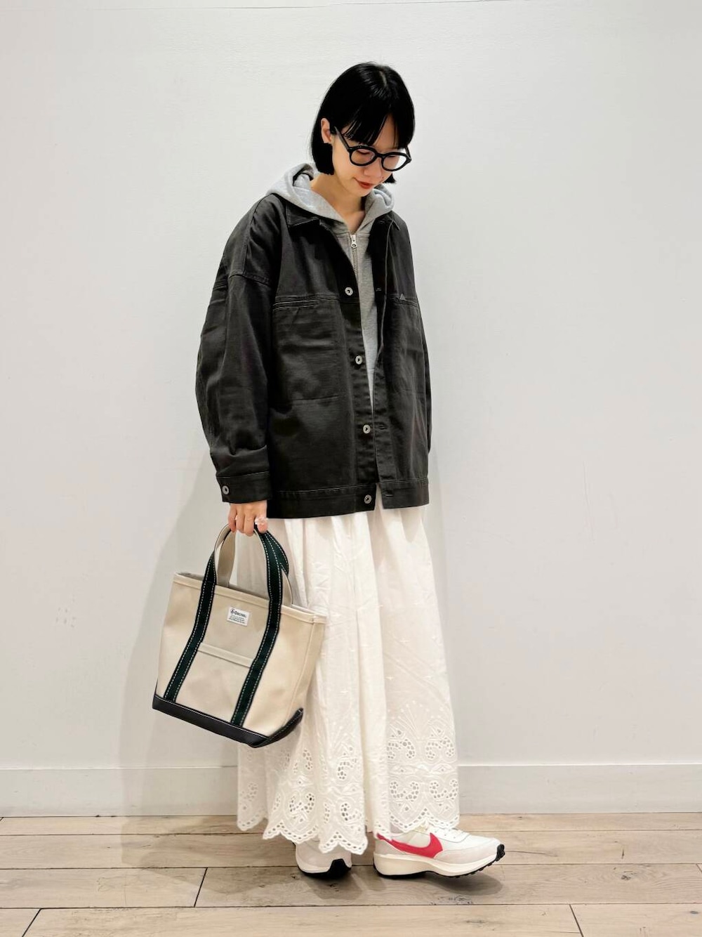 白だと甘めな印象なので、パーカーにドルマンジャケット、スニーカーでカジュアルに組みました^ ^