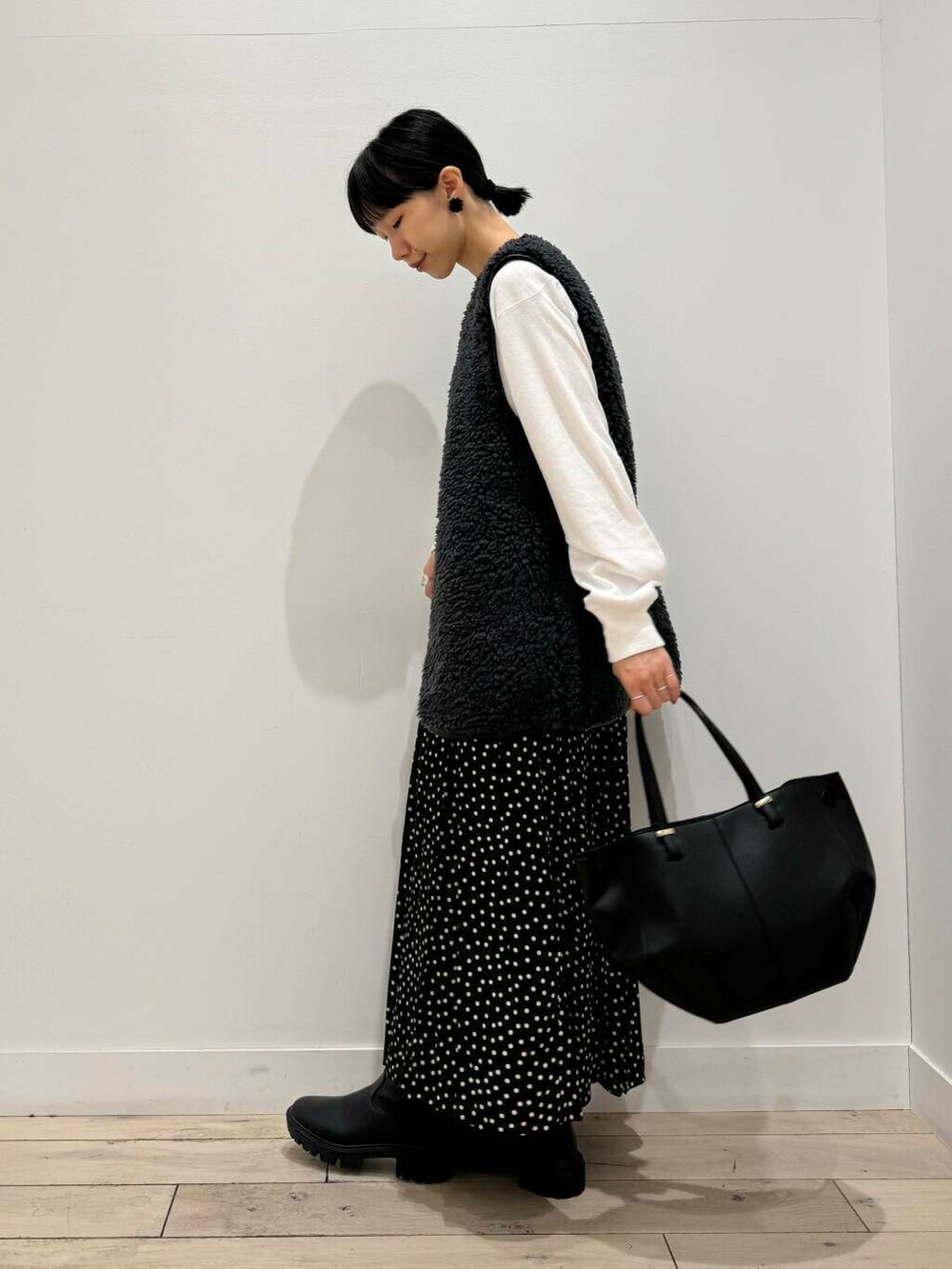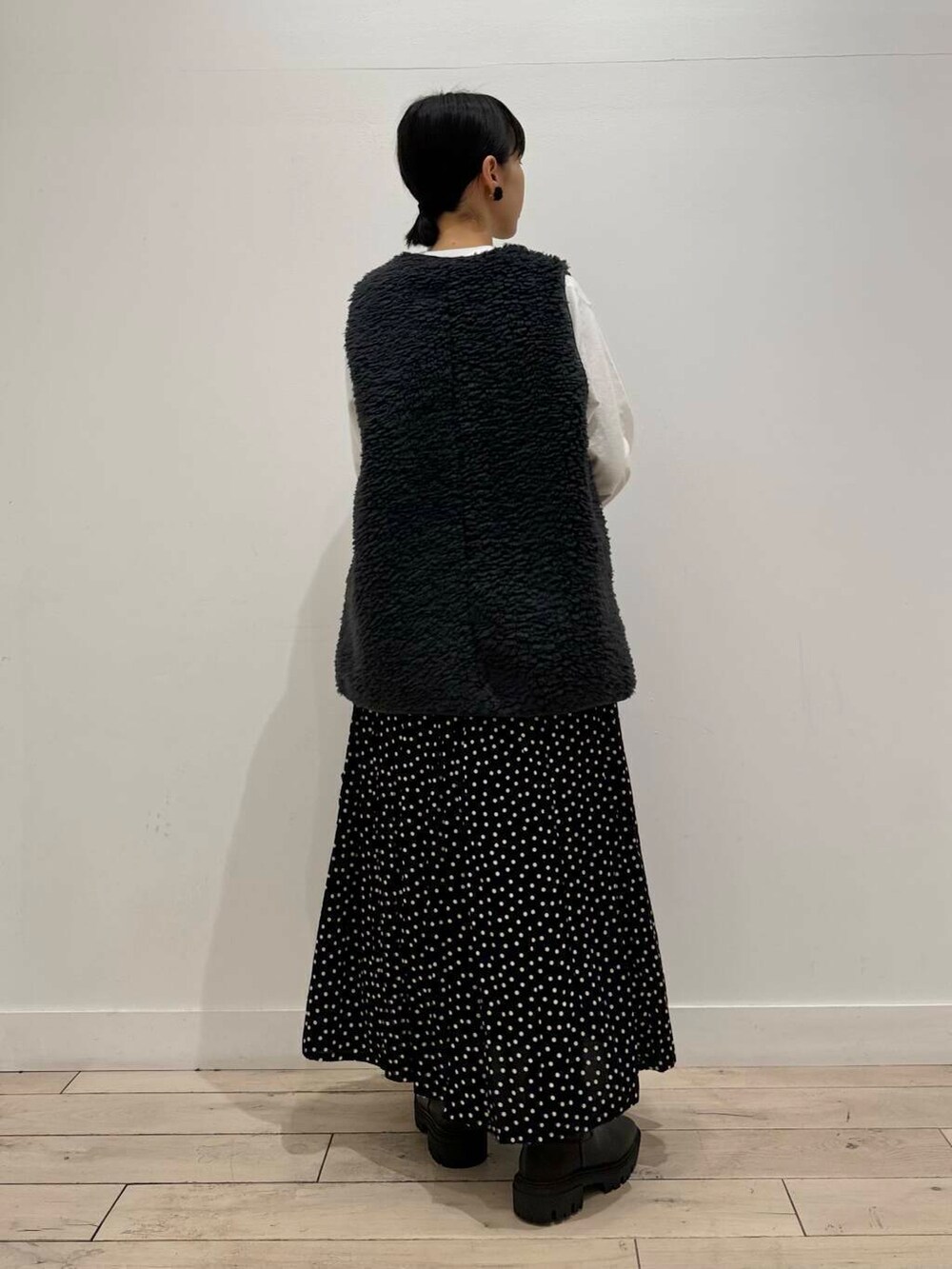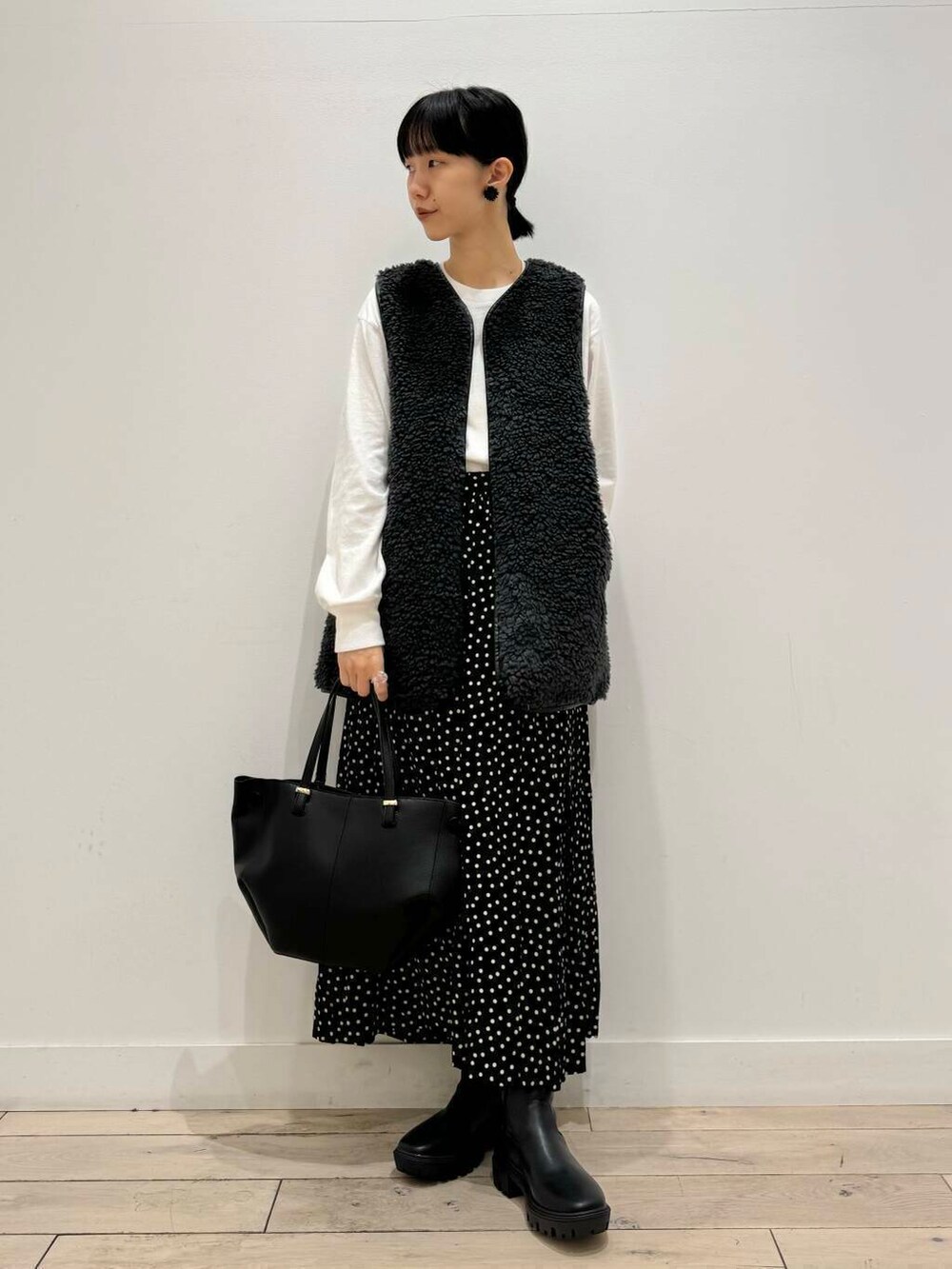 少し長めのベストは縦のラインを出してくれるので、ギャザースカートと合わせてもすっきりです◎