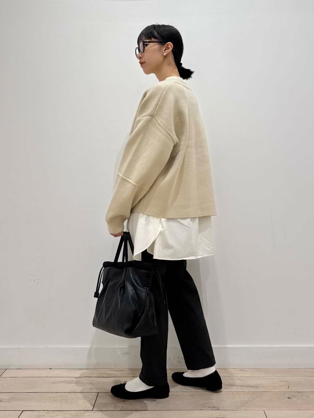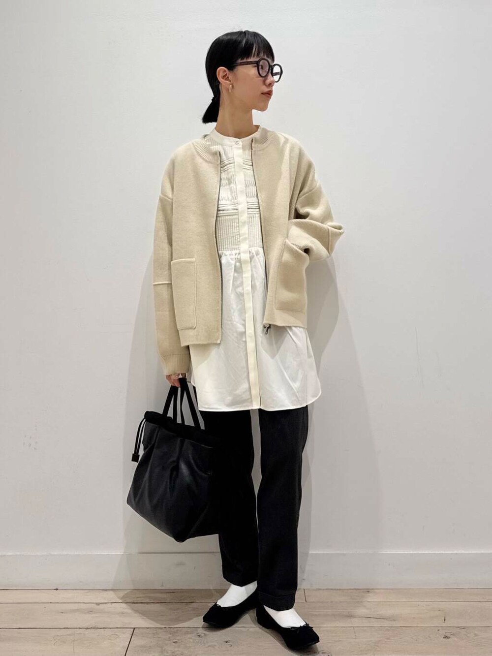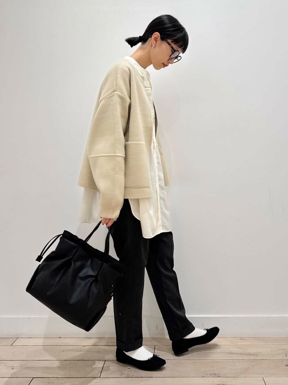 ピンタックチュニックシャツ、絶対テーパードパンツと合わせたらかわいいオフィスカジュアルになるなと思い組みました^ ^