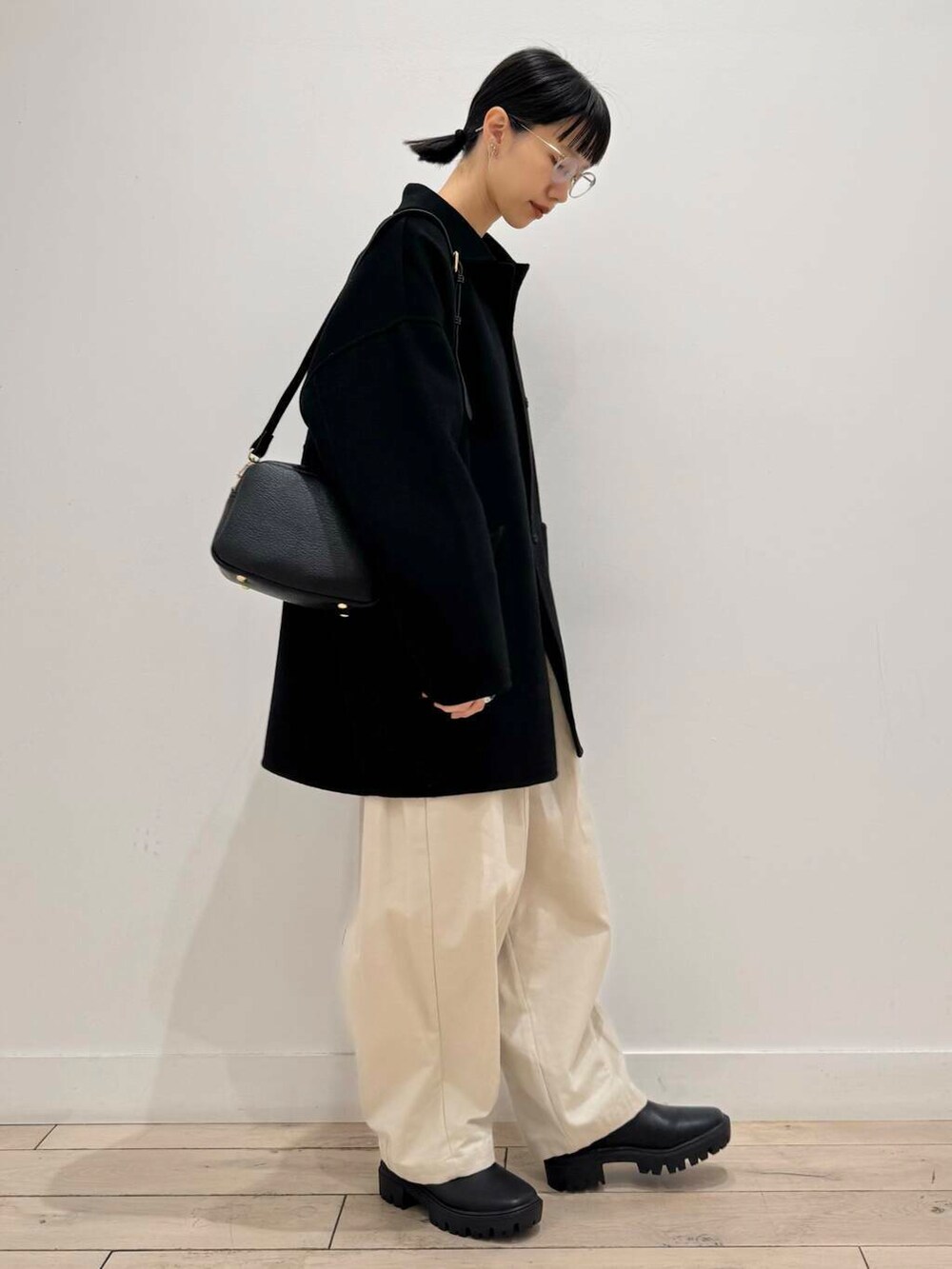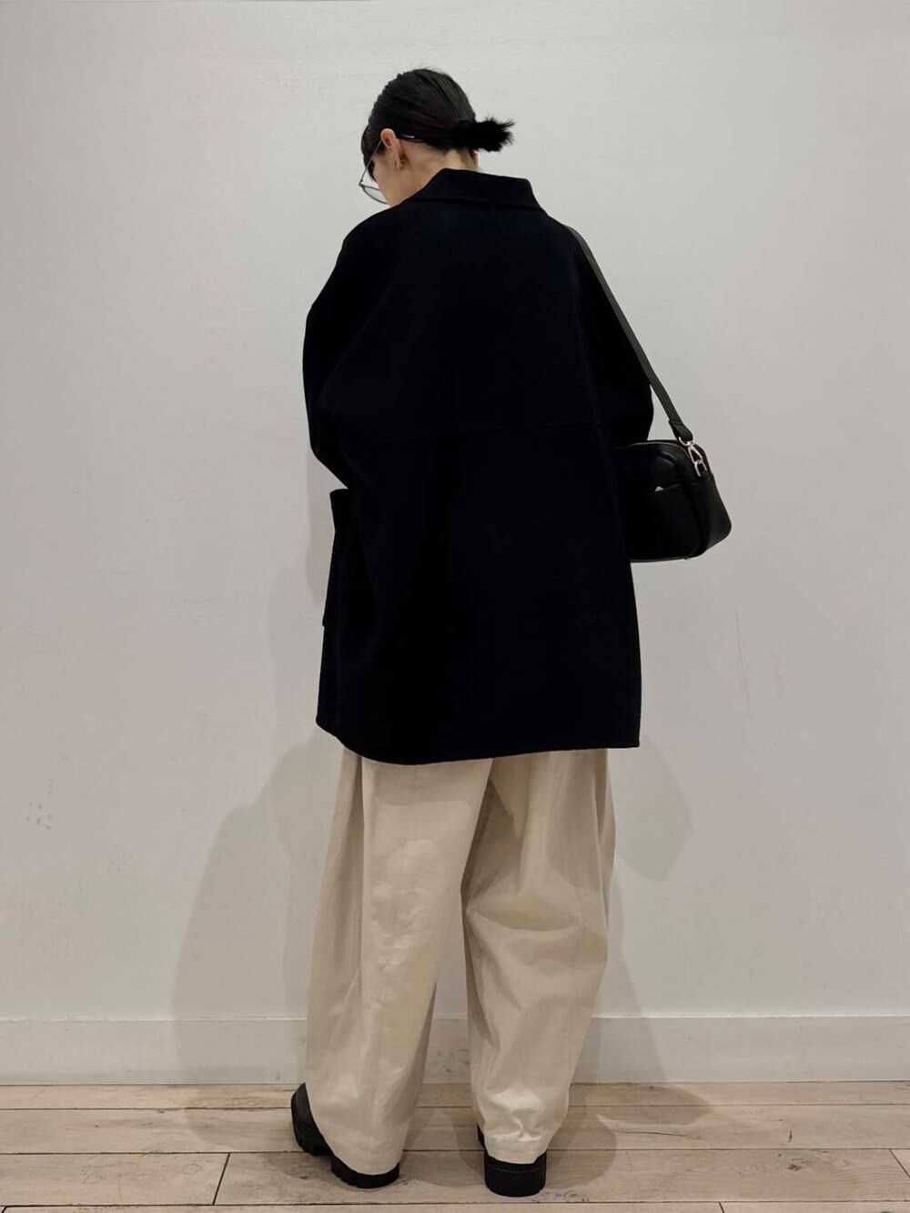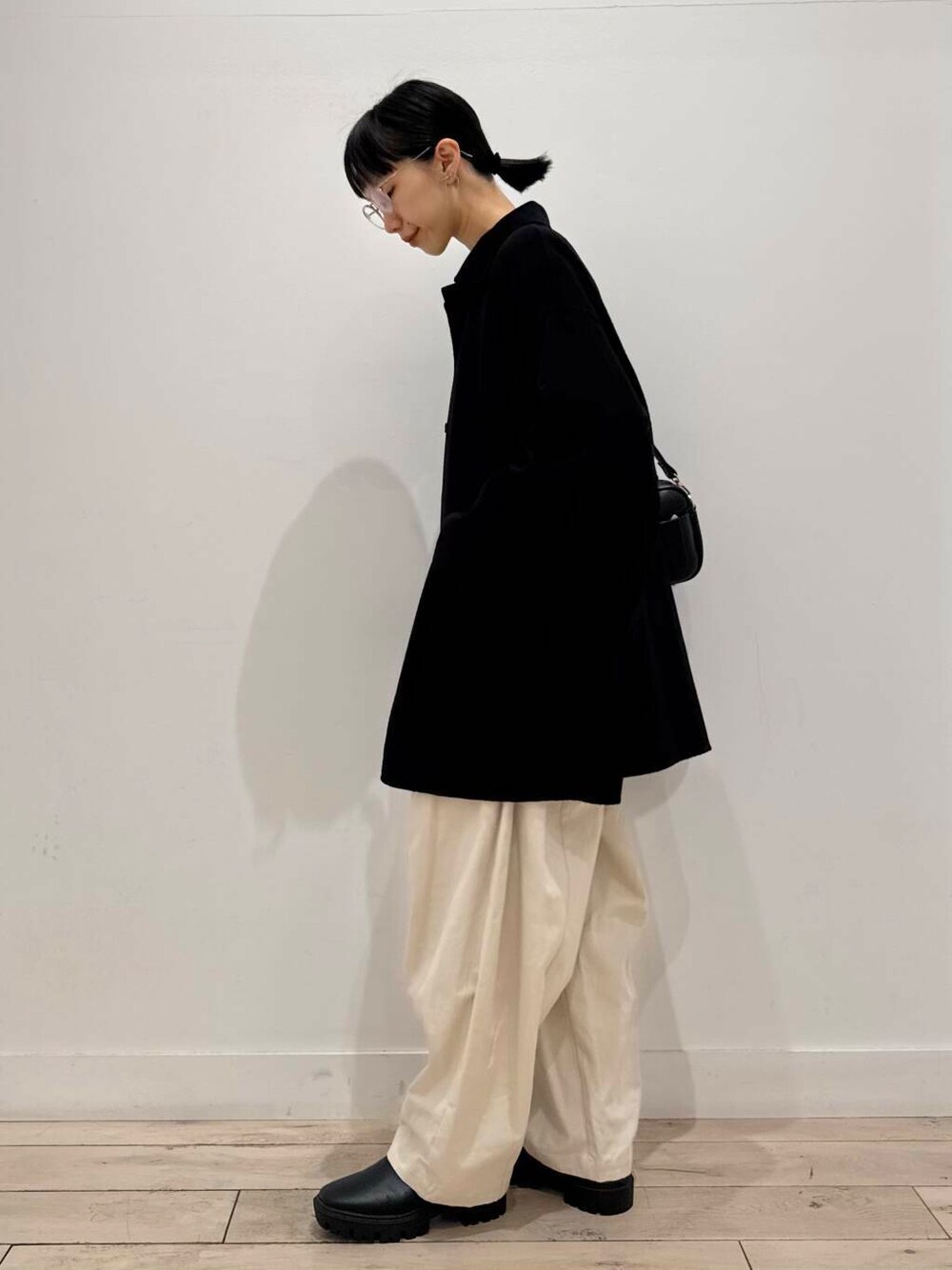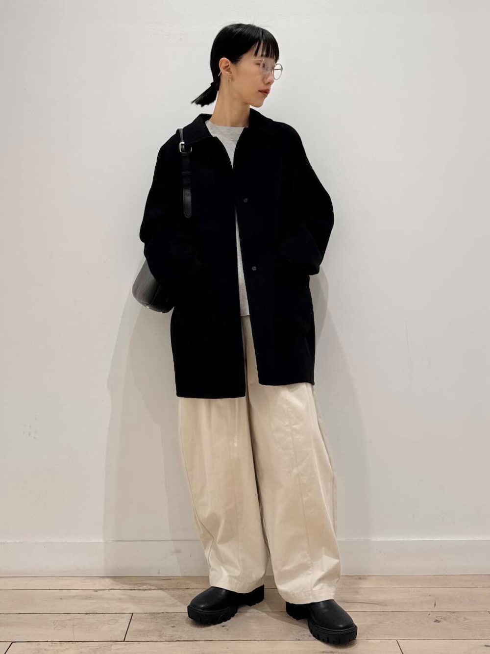 淡色で組み、コートや小物を黒にして締めました!コートはスッキリした印象ですがサイズ感にゆとりがあります◎