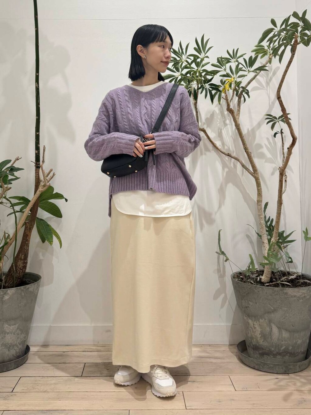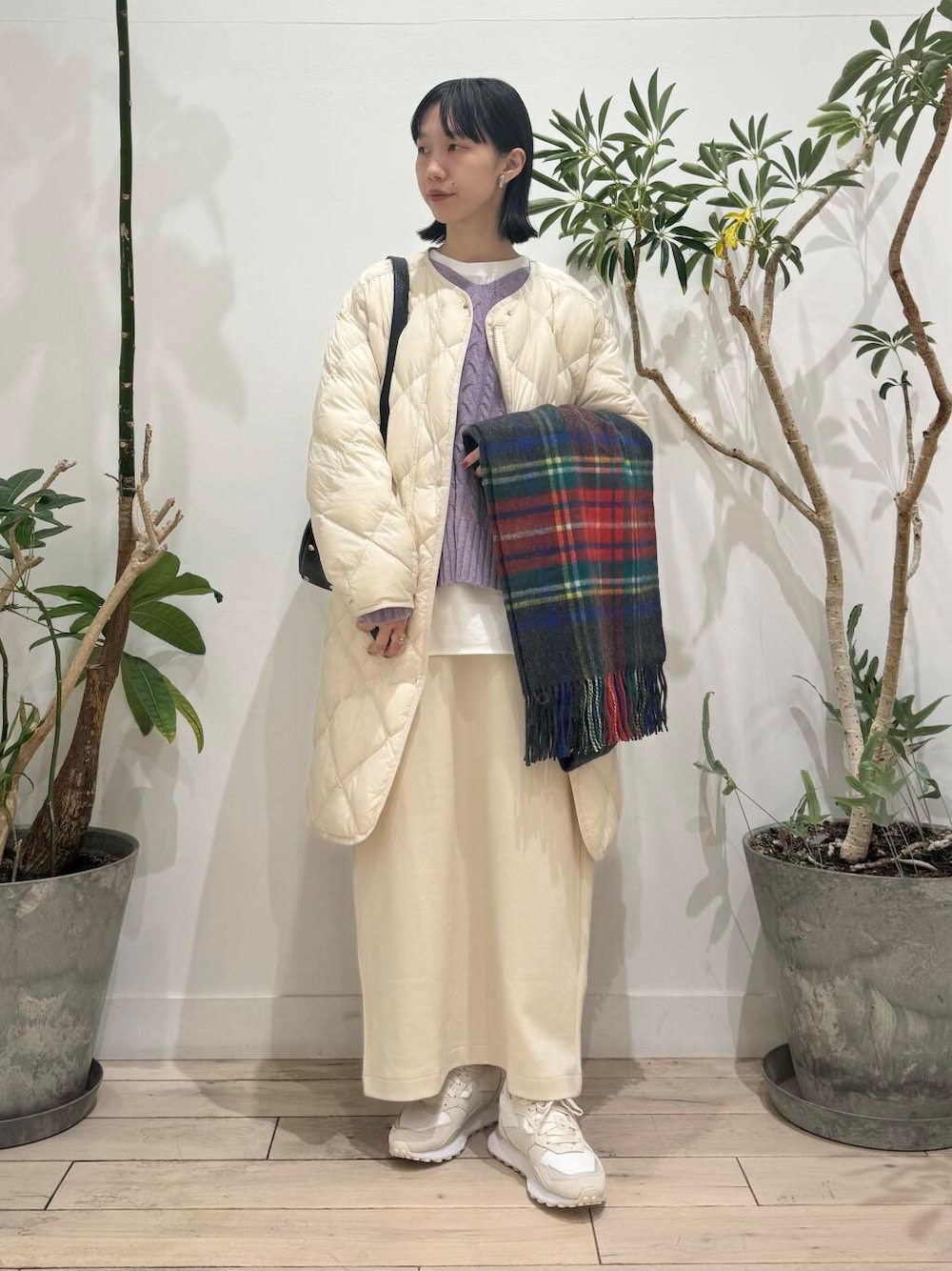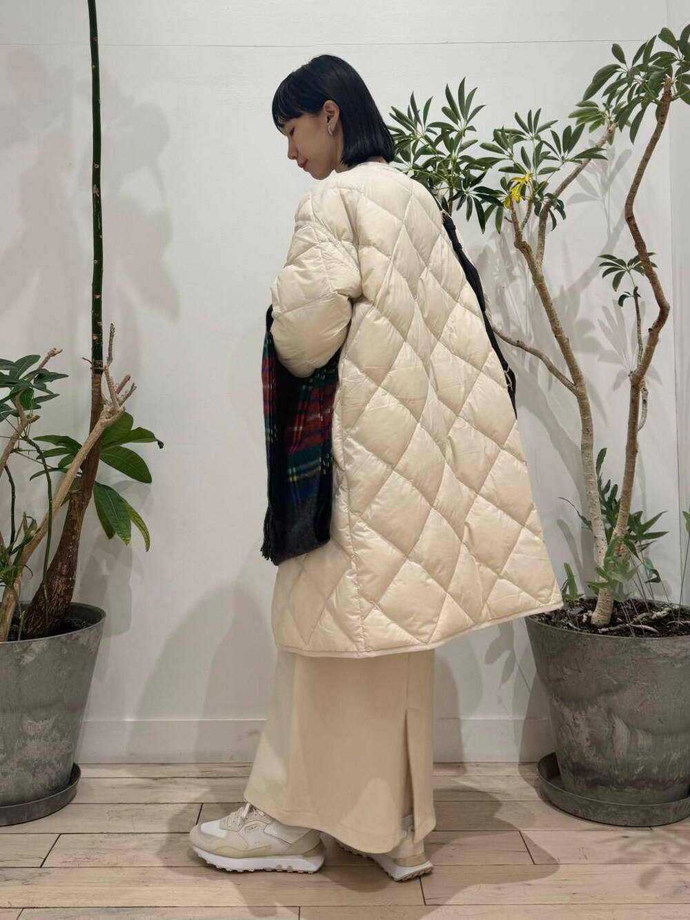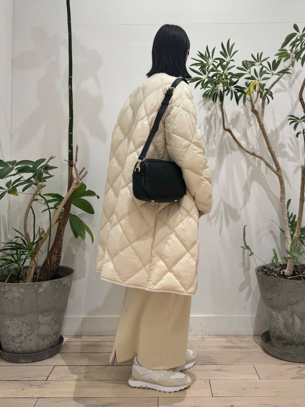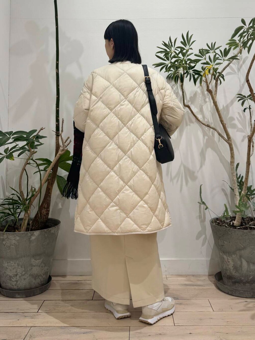 キルトダウンは腕部分が細く見えますが、カットソーにニットを重ねたスタイルでもまだ余裕があります◎
