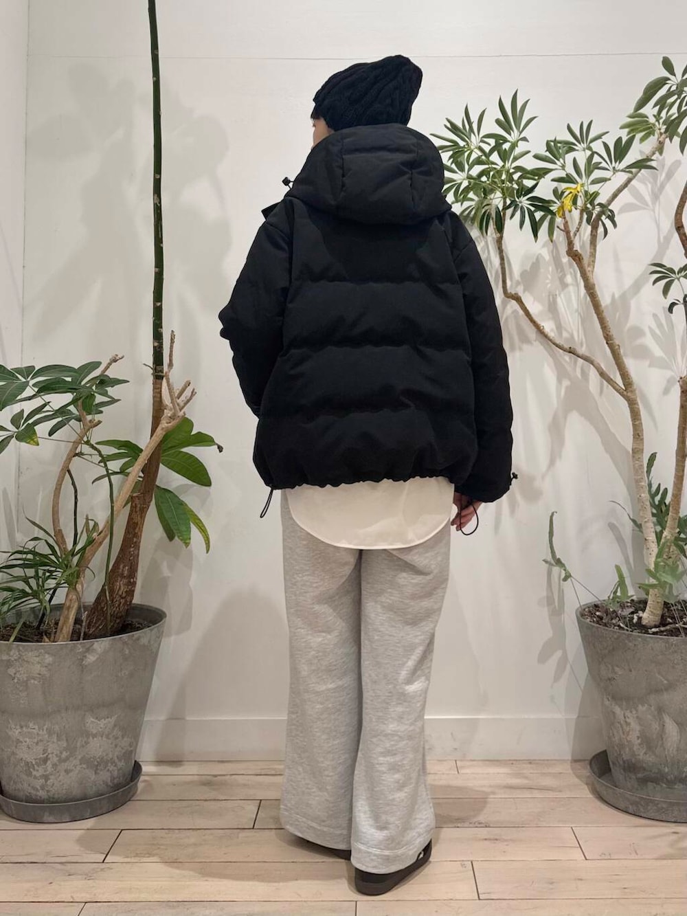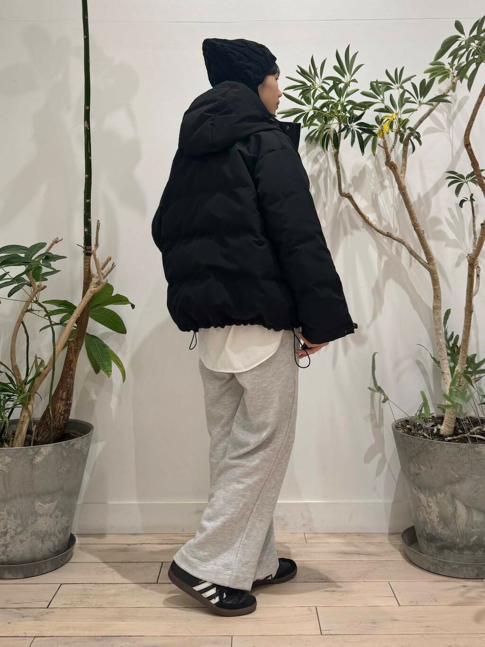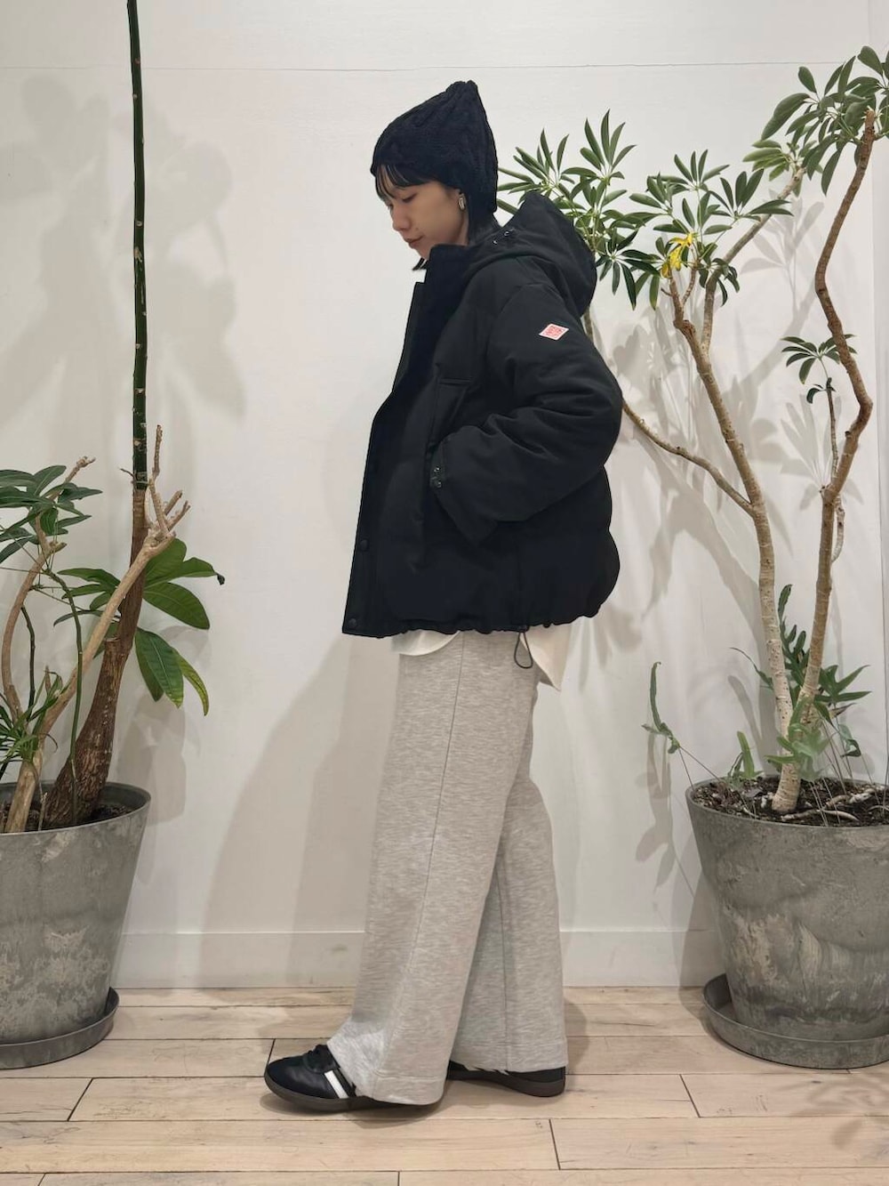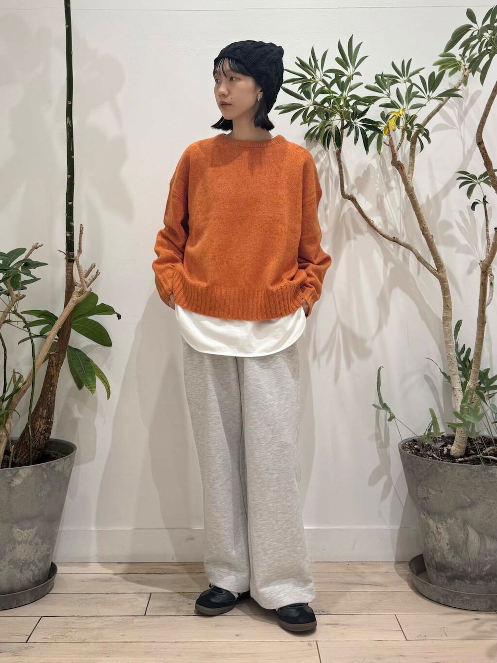 スウェットパンツでもカラーニットをレイヤードで着ると部屋着感なくコーディネートできます!