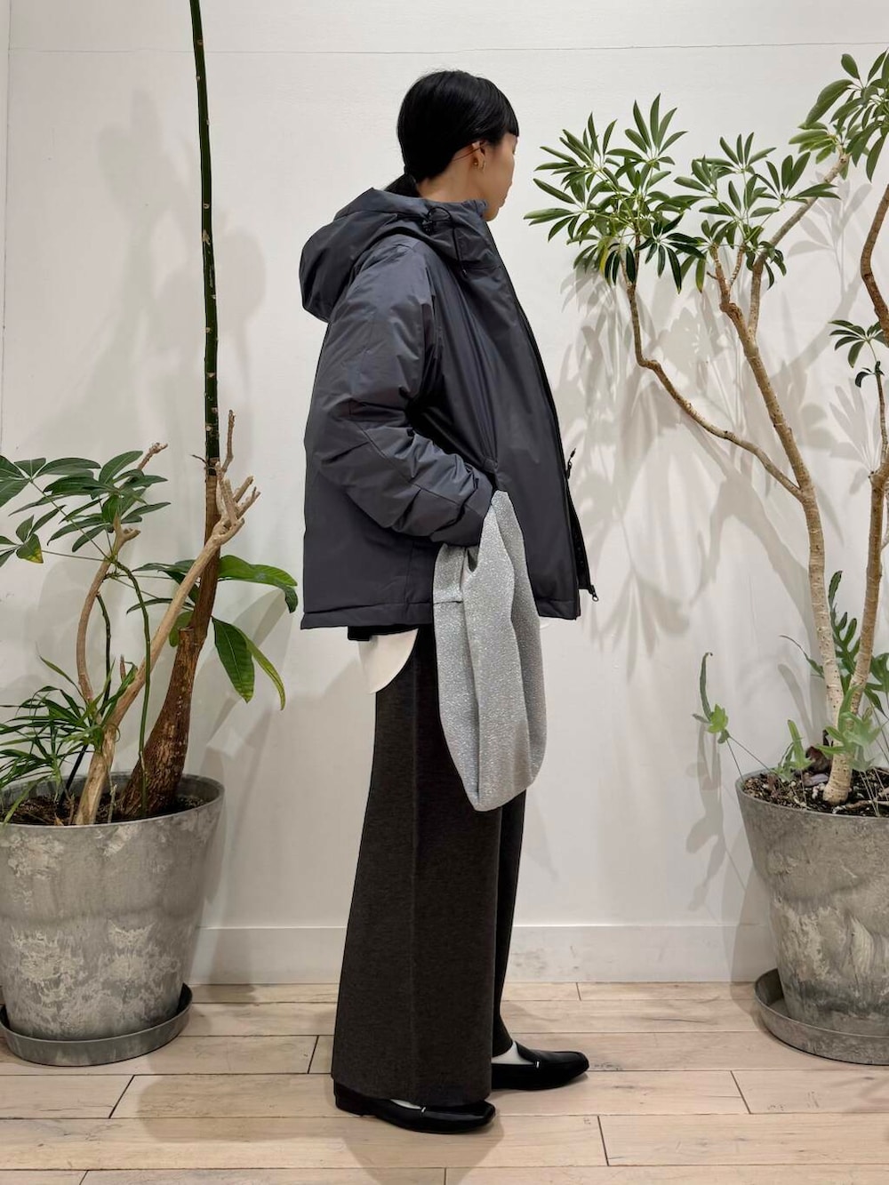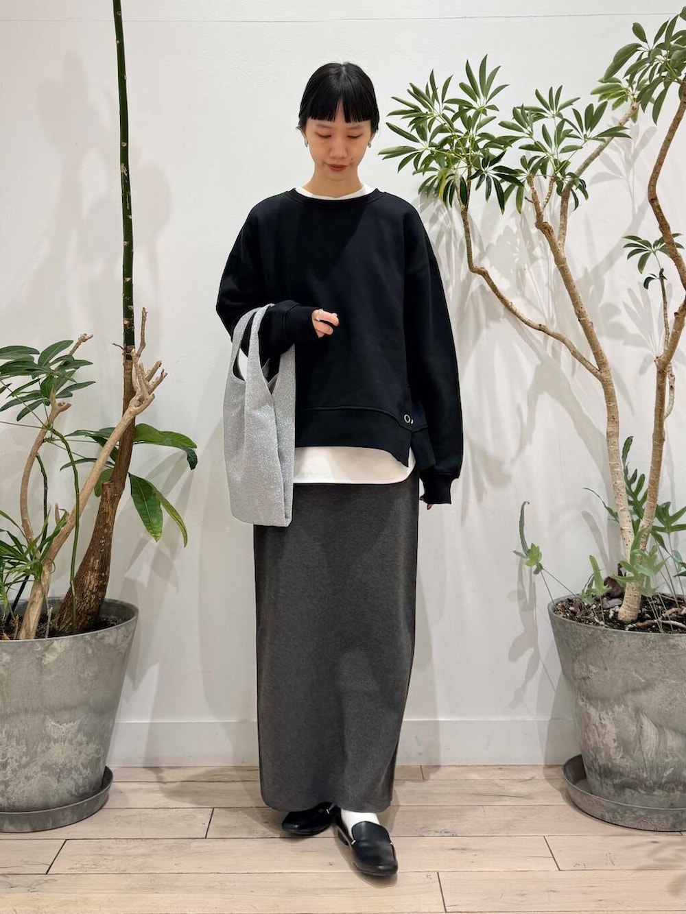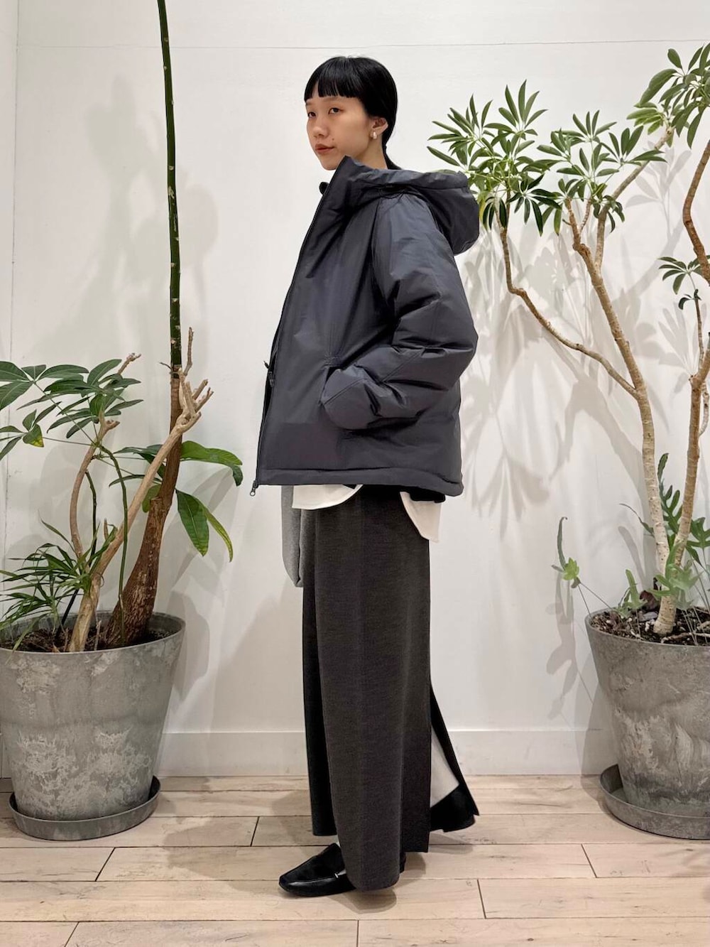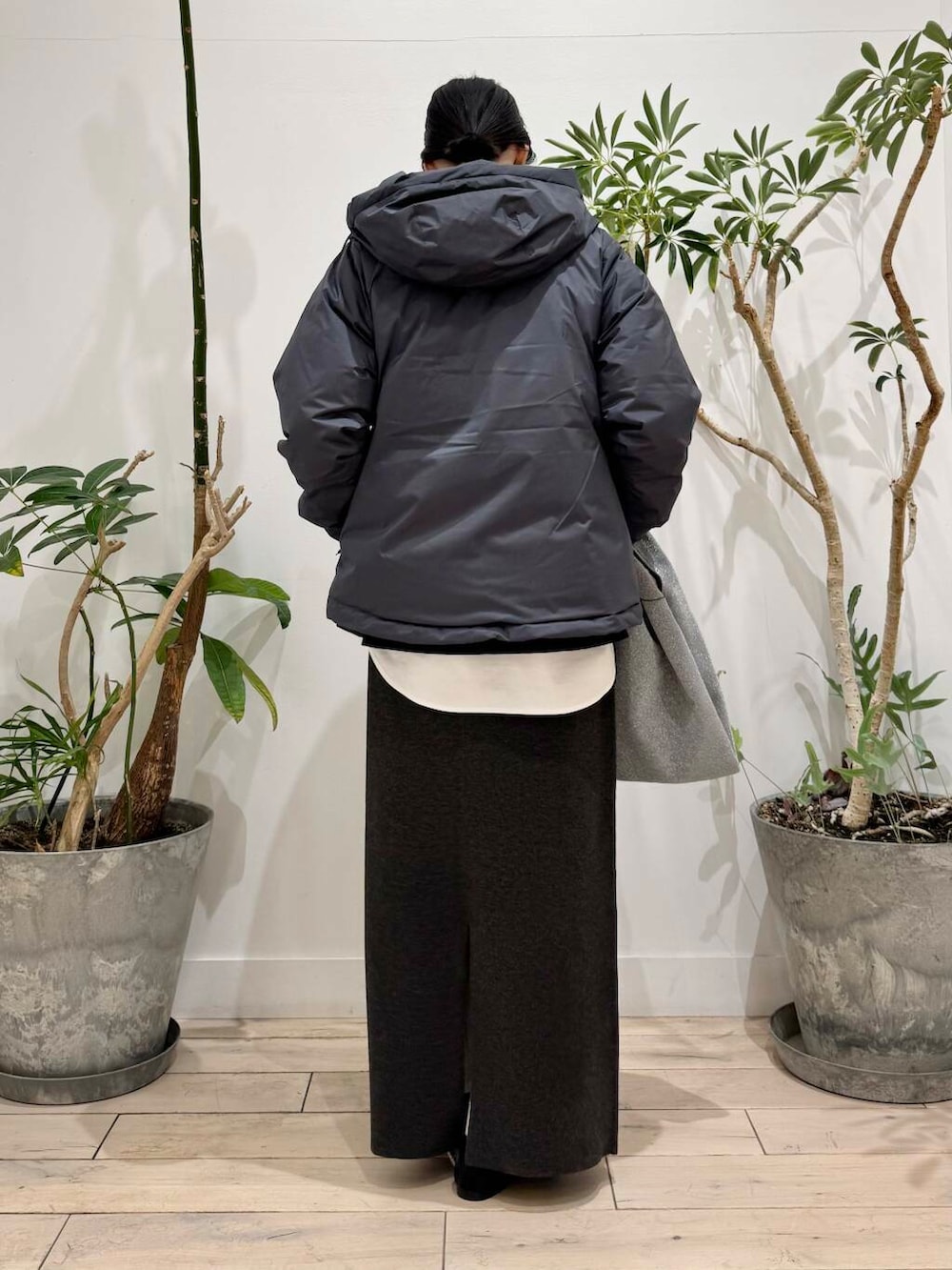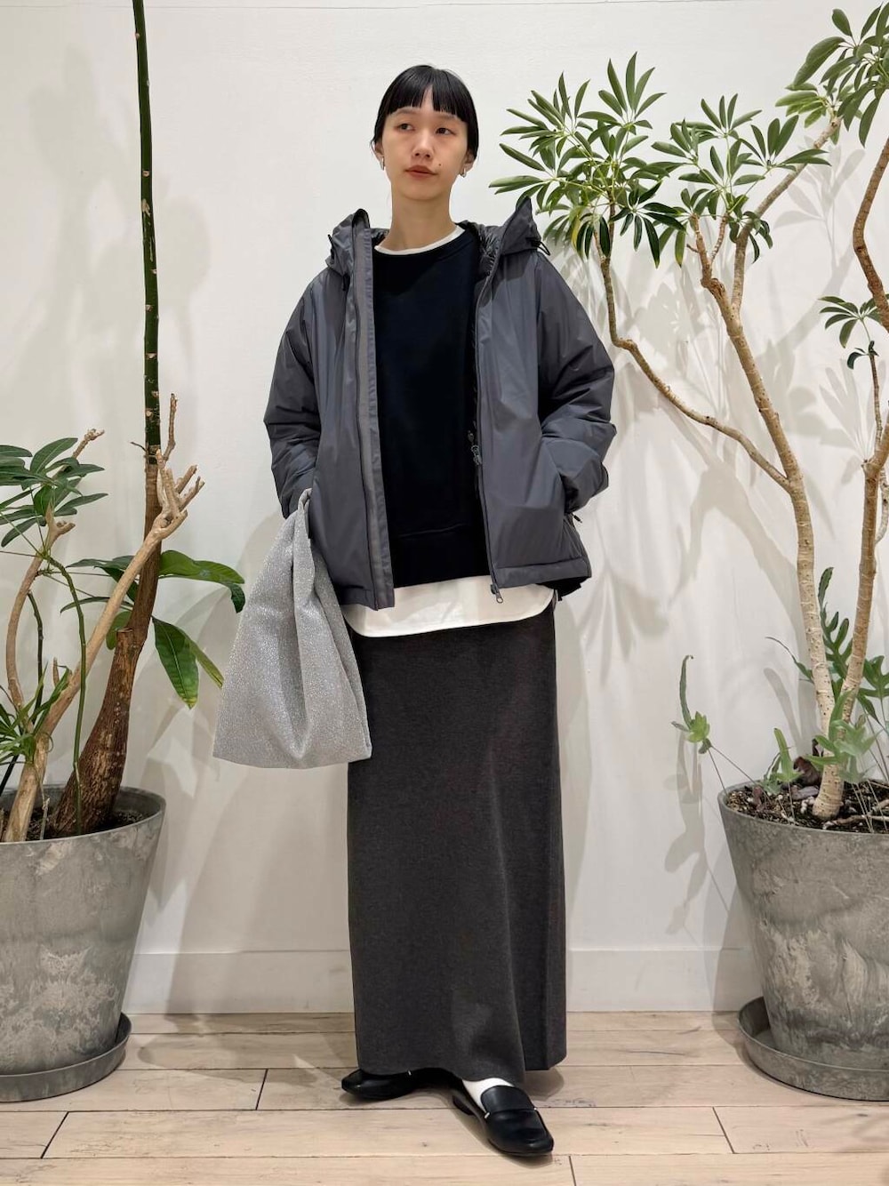 ダウンとスウェットでカジュアルですが、スカートをニットスカートにしてキレイめ要素も入れました◎