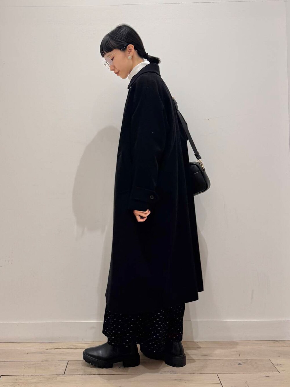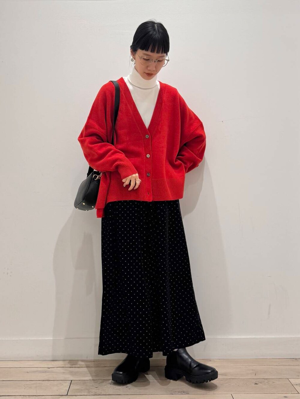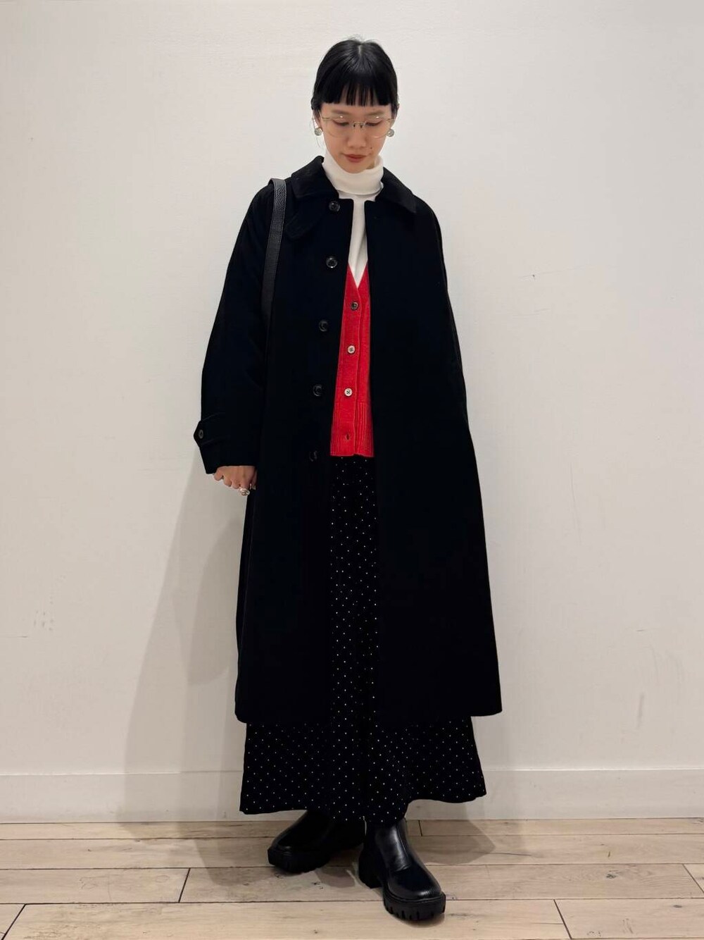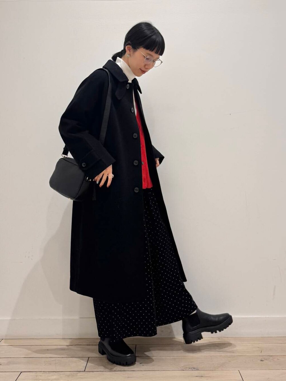 アウターを着れる時はさりげなく見える赤がポイント、脱いだら主役なコーデです♪