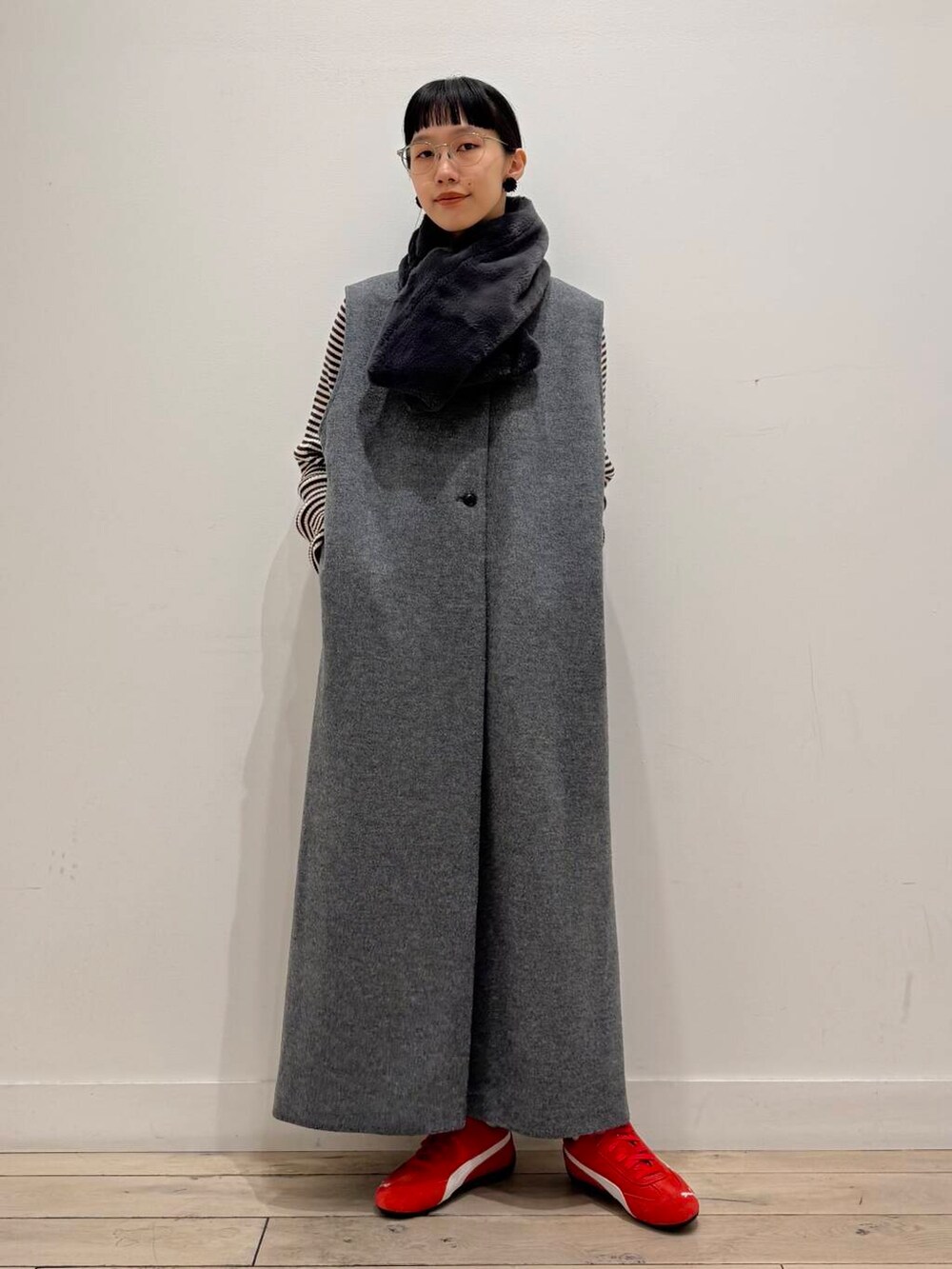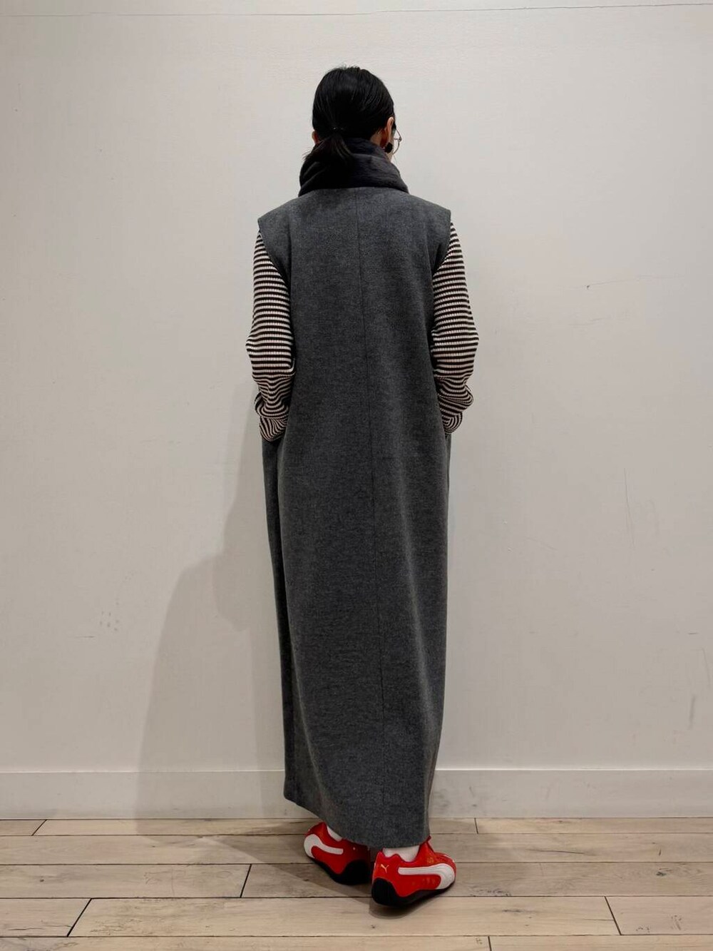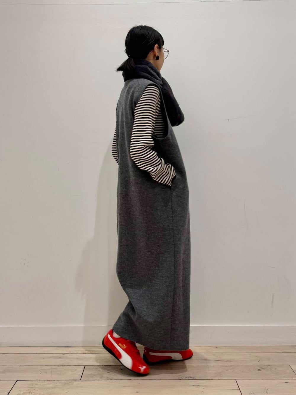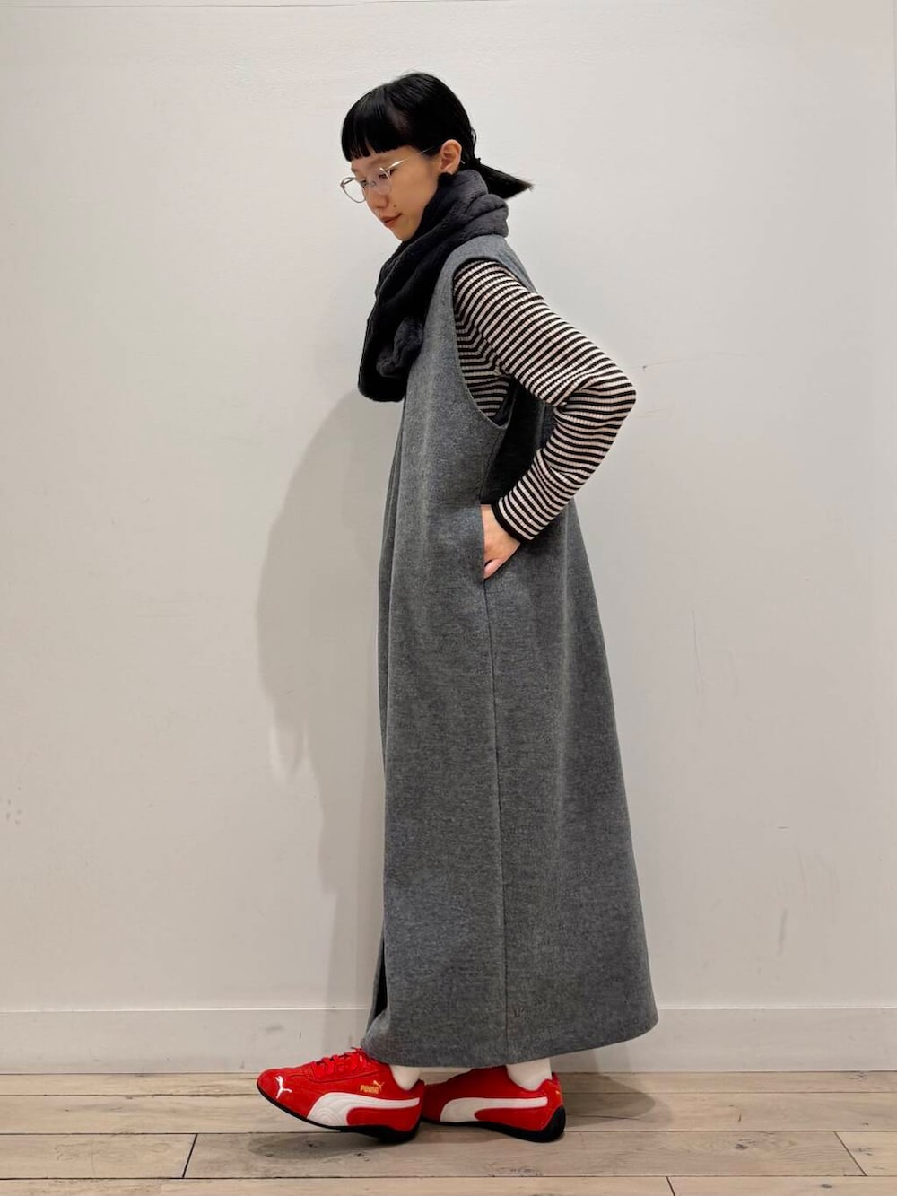 コーデは立川店に入荷しているPUMAのSPEEDCAT OGを差し色にウールのジャンパースカートで楽ちんコーデにしました!