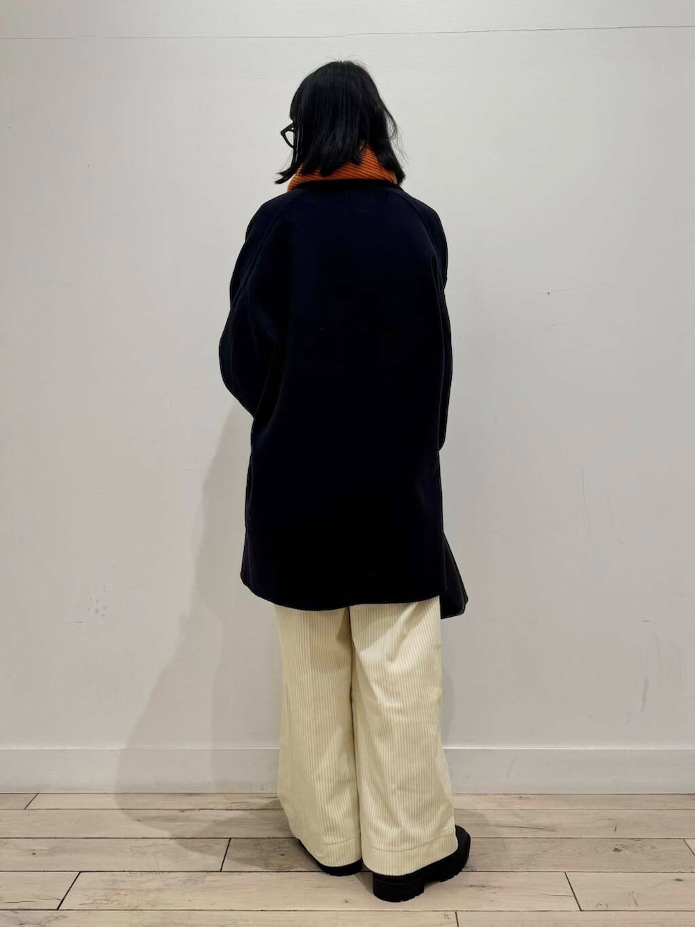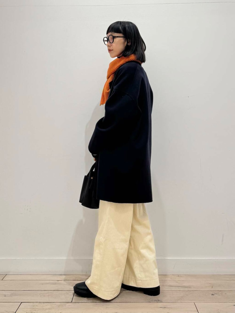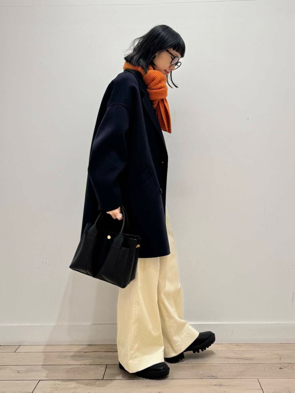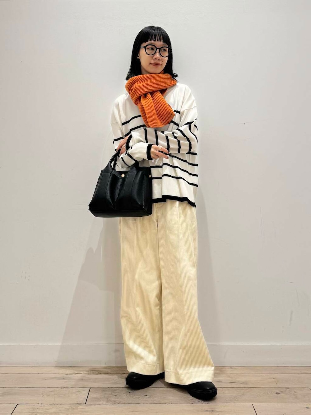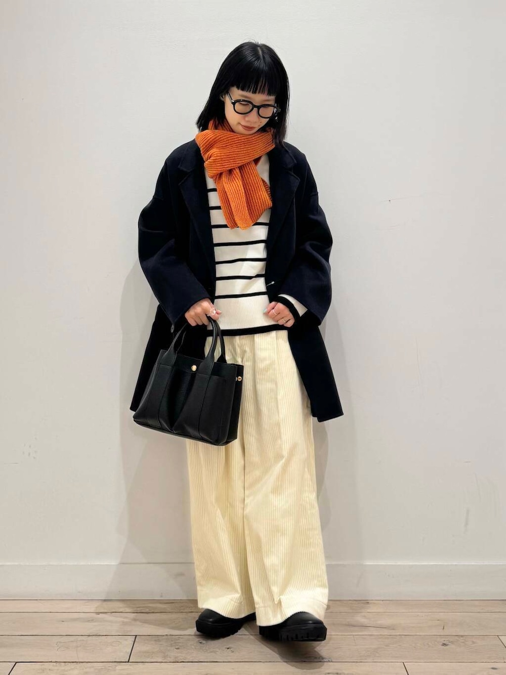 ホワイト×ネイビー×ブラックでまとめてオレンジのストールで差し色にしました🍊