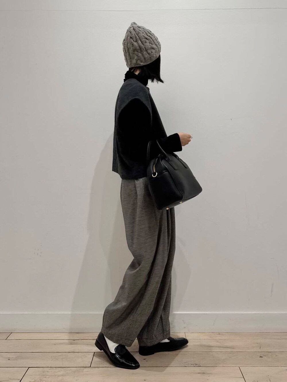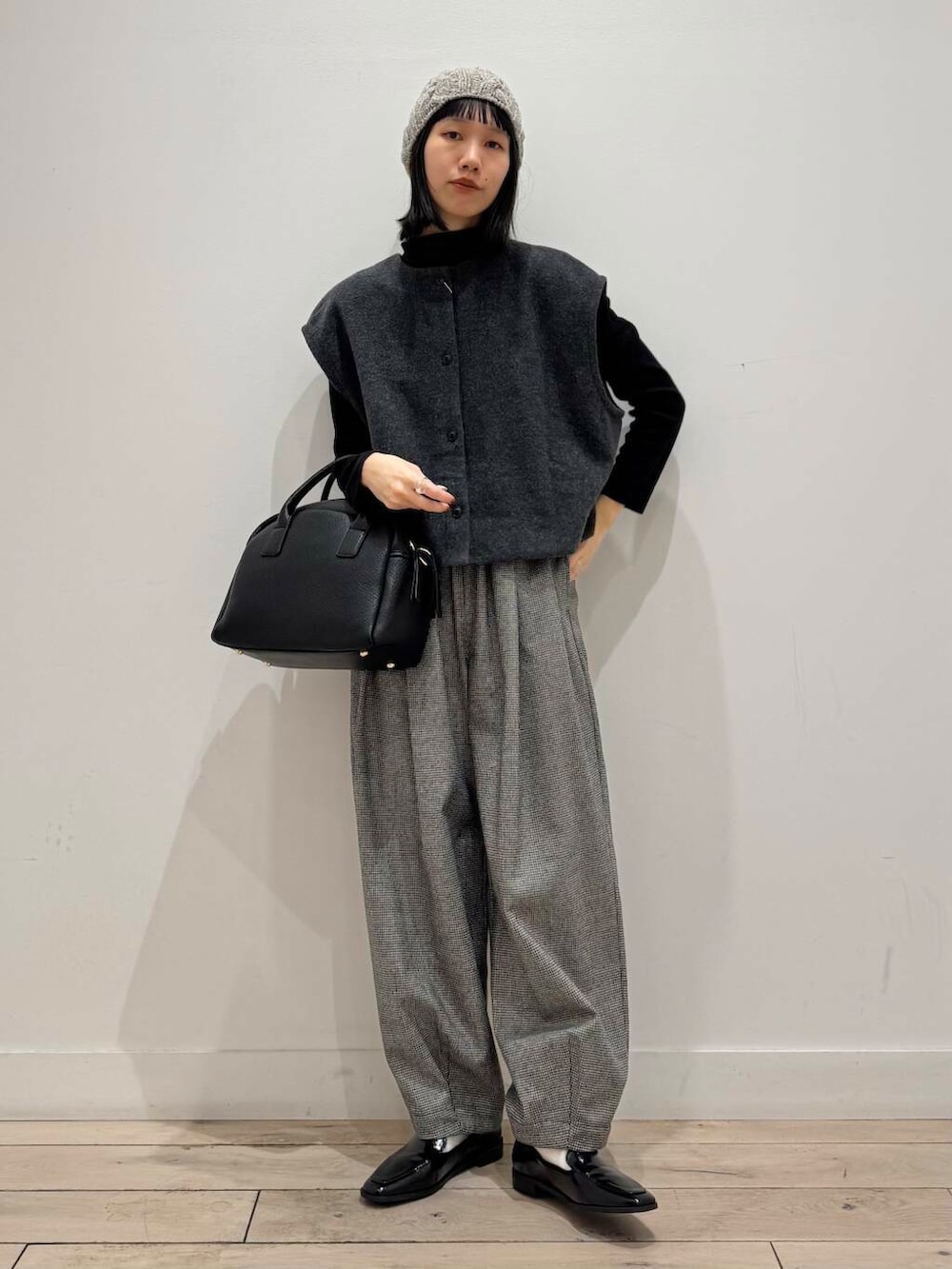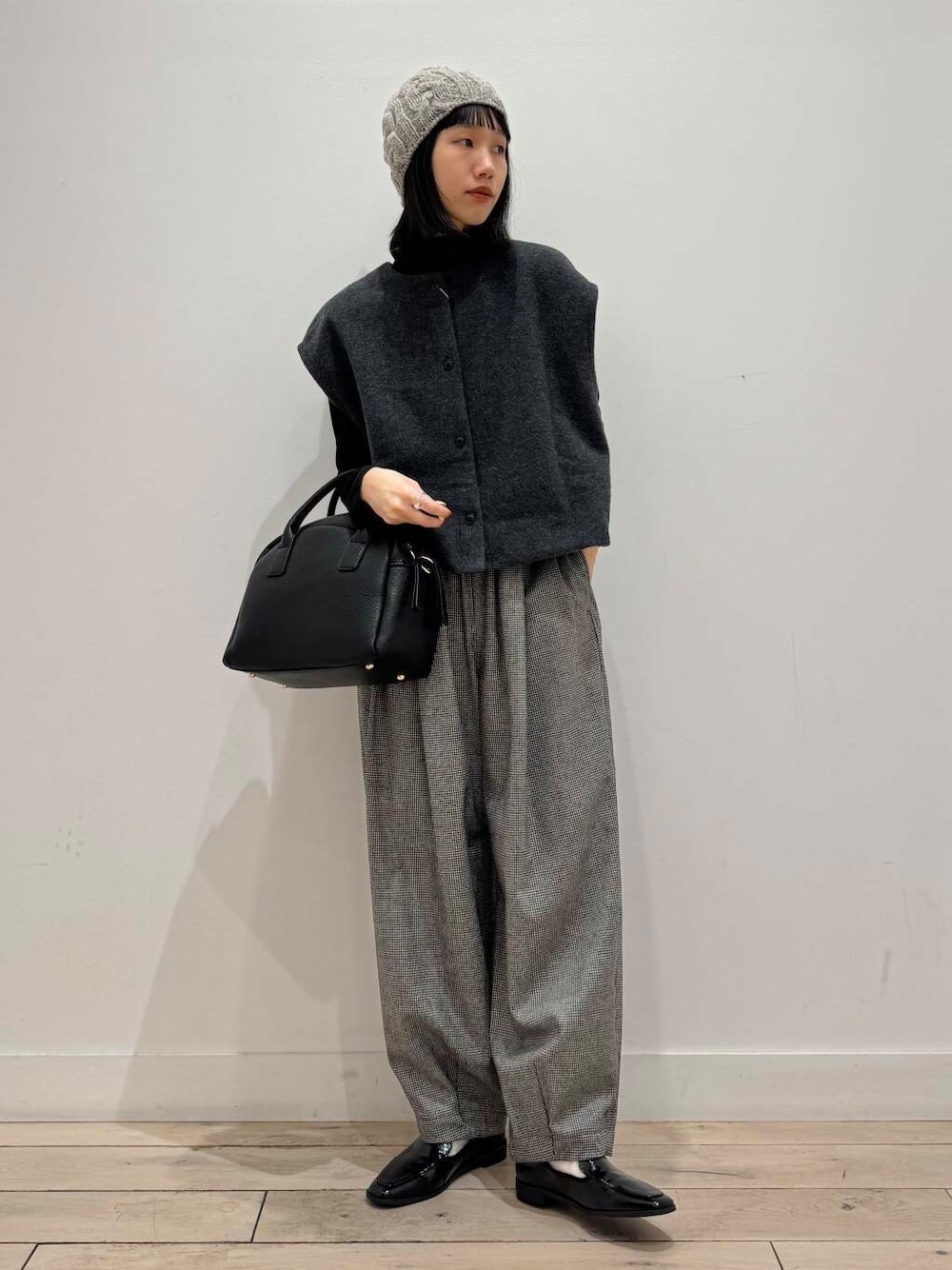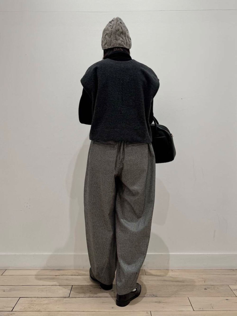 ウールパンツは裾の方にもタックが入っていて、ゆるっとしてるのですがきちんと感もあり、ジャンル問わず着回ししやすいです!