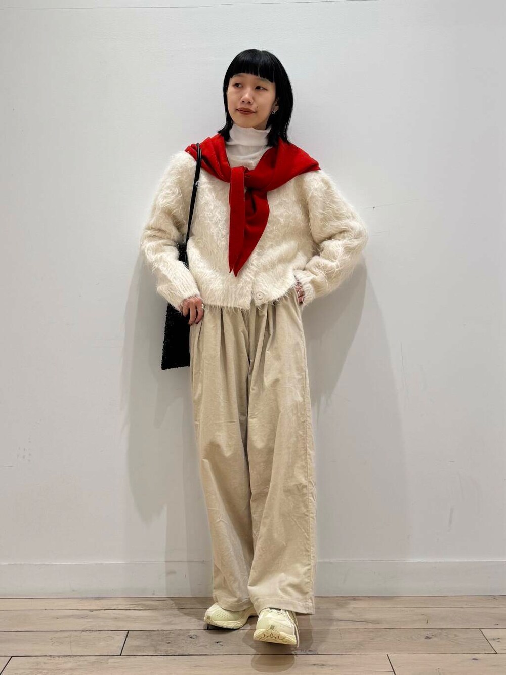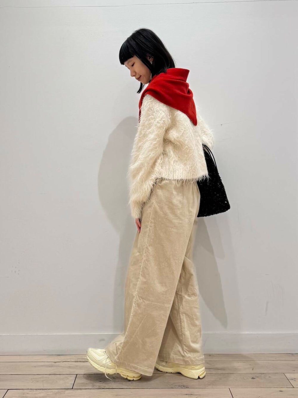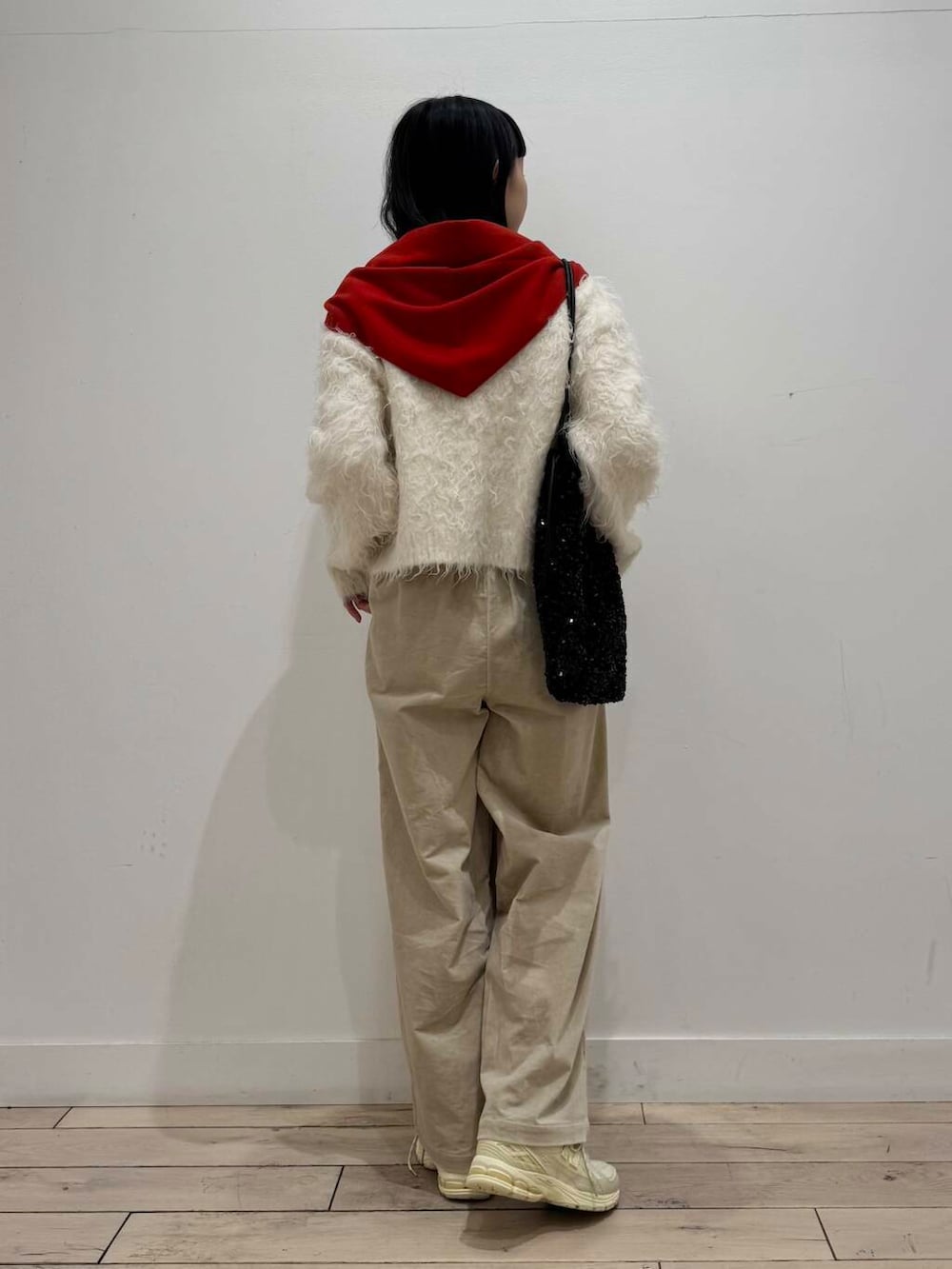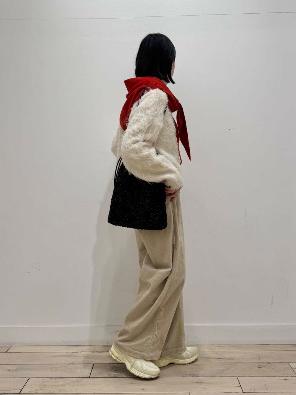 スパンコールバッグと赤のニットストールでさらにホリデー感もいれました。