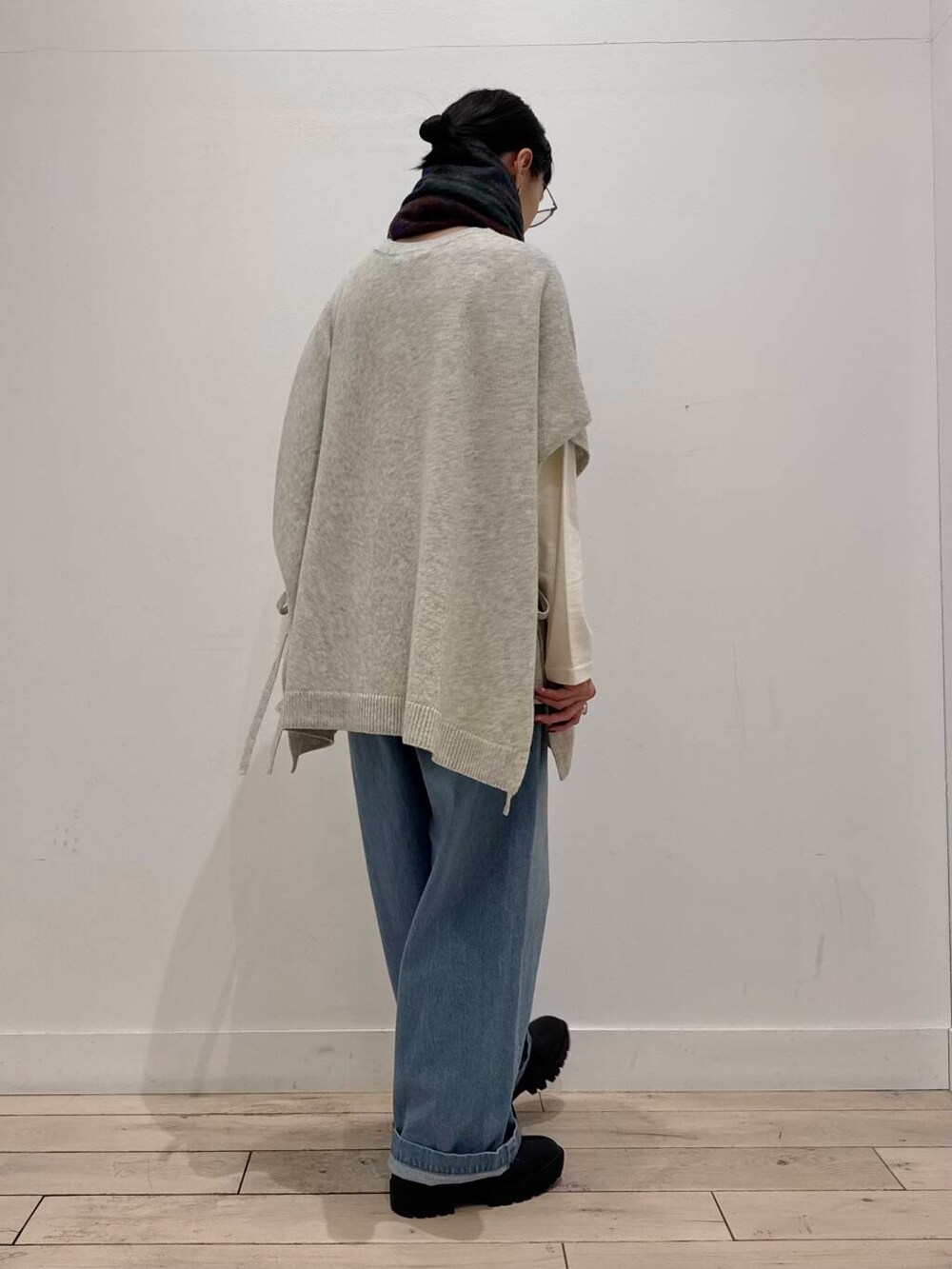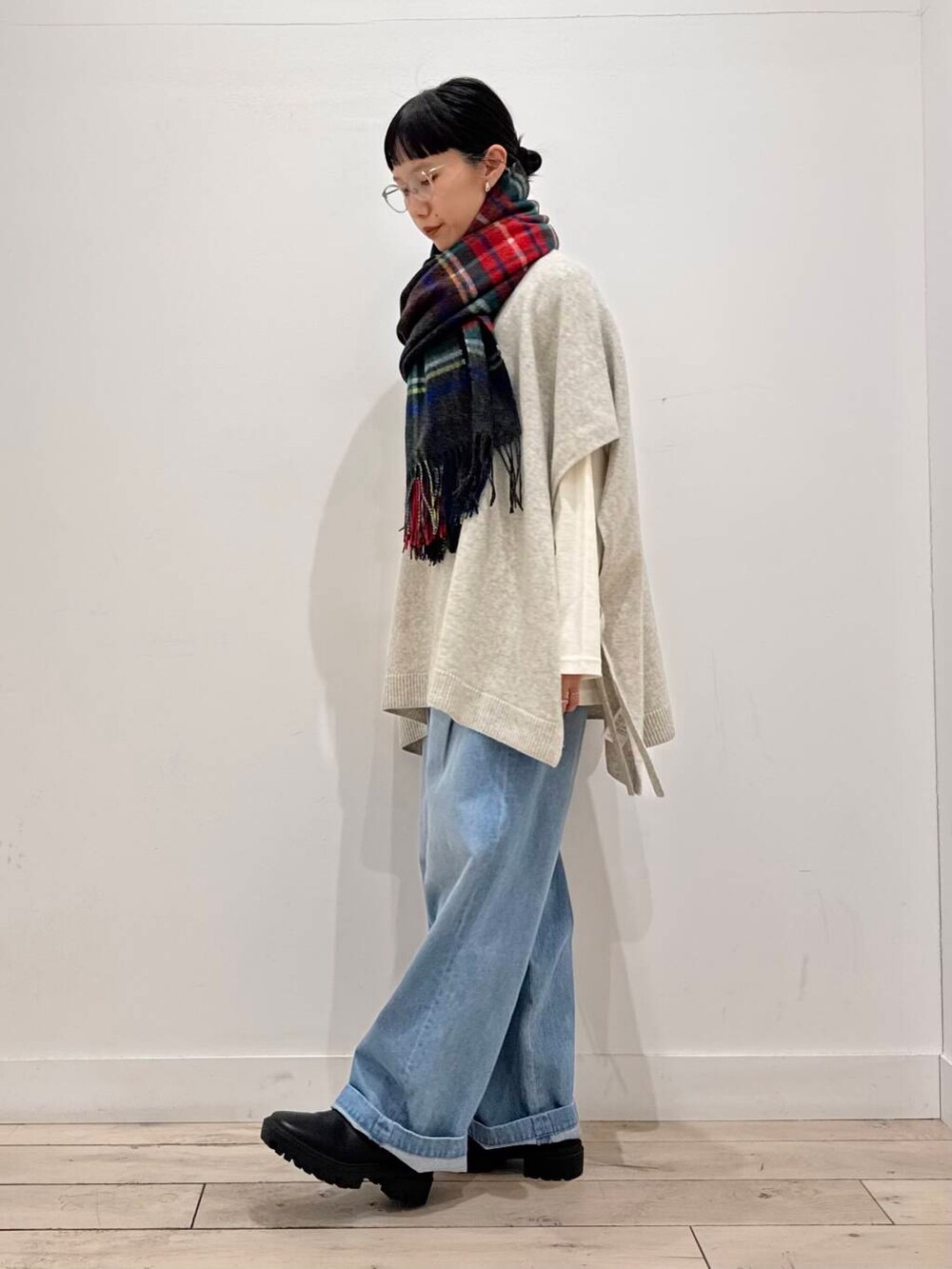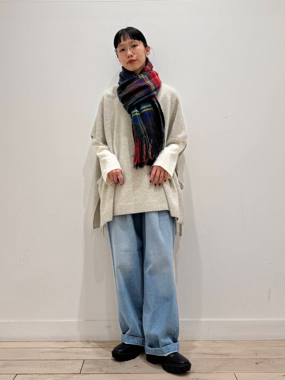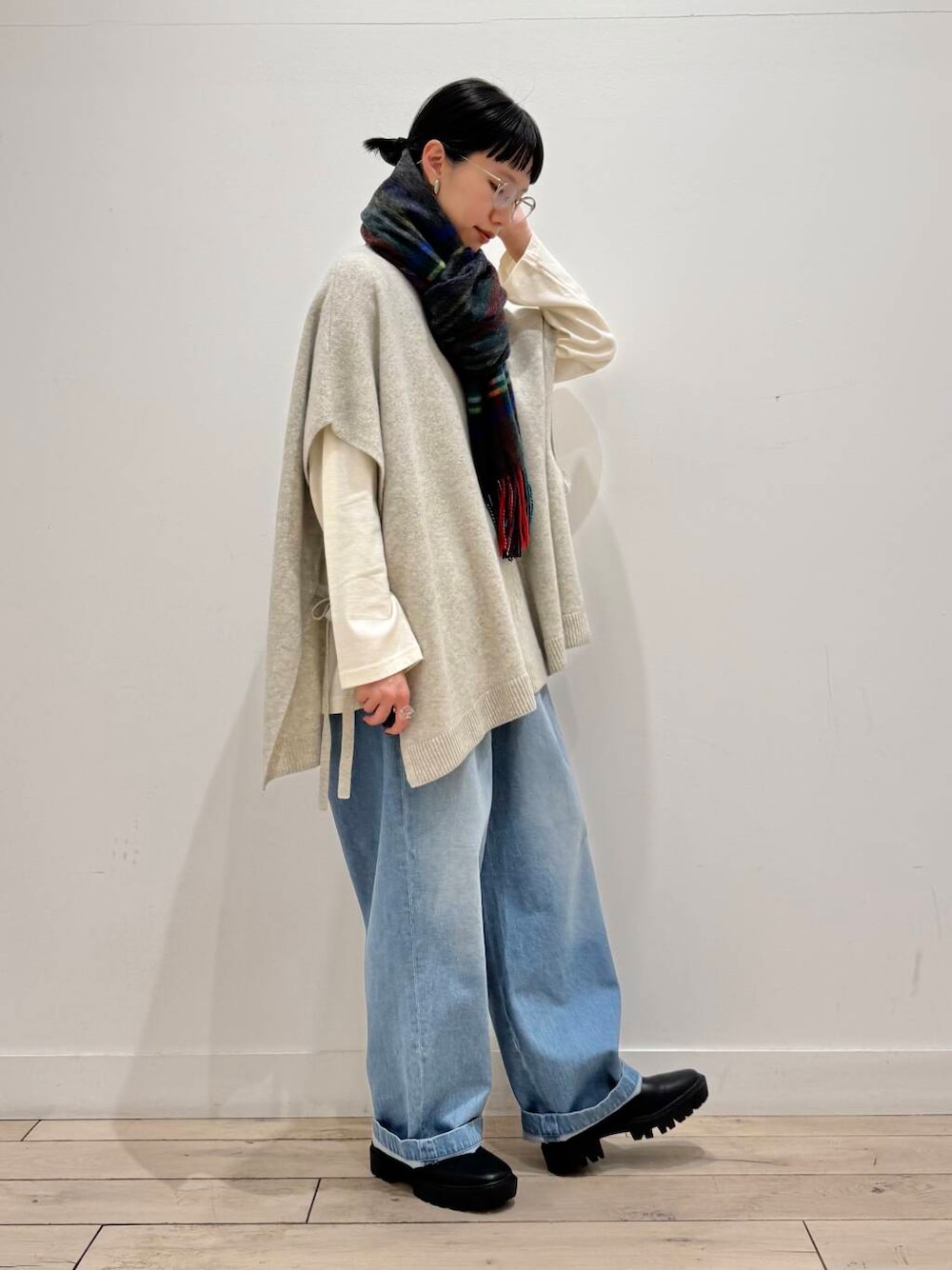 ワイドニットベストがゆるっとしているので、ストールはカチッとシンプルに巻きました🧣髪もアップにして小顔効果に!^ ^