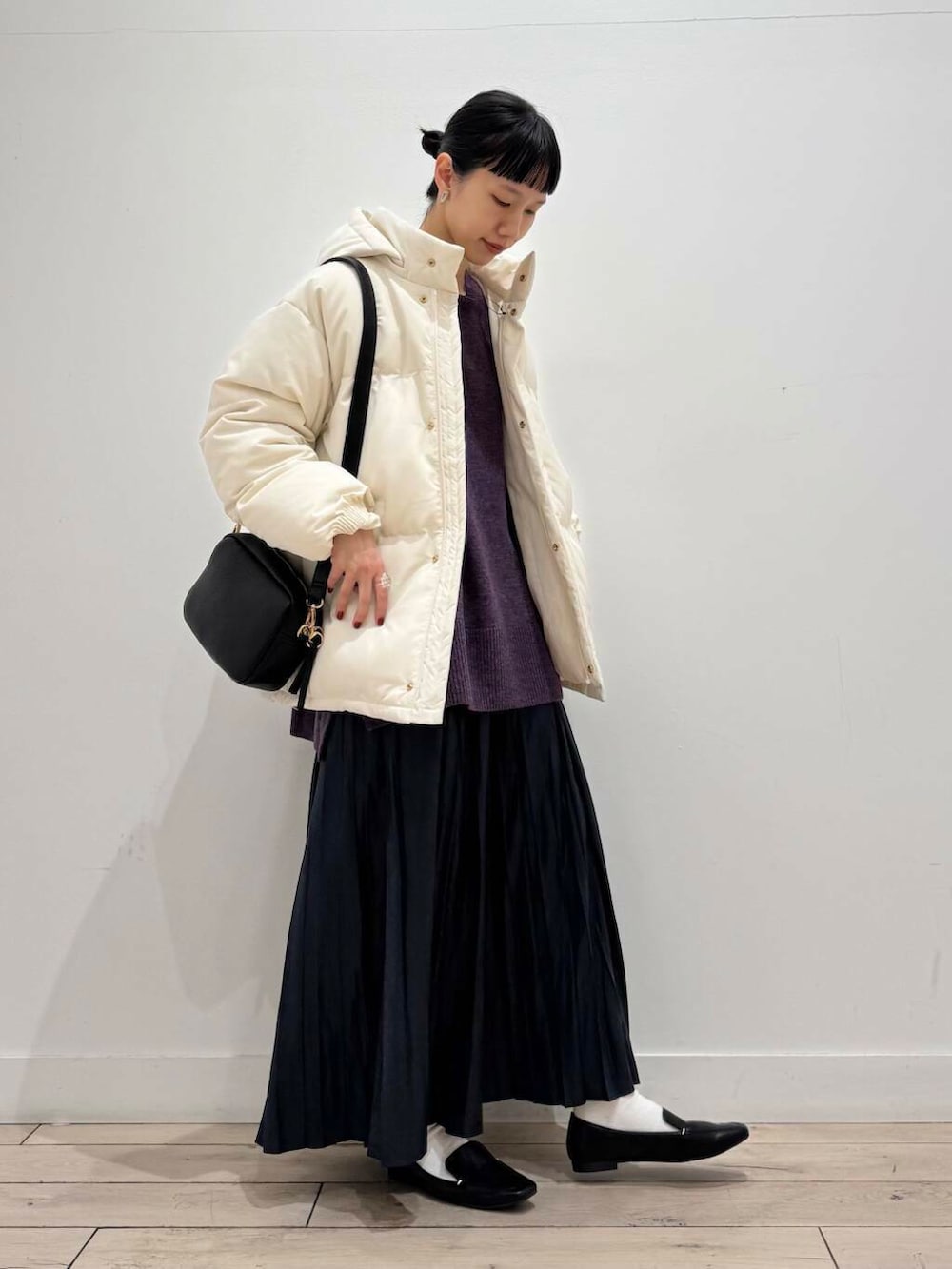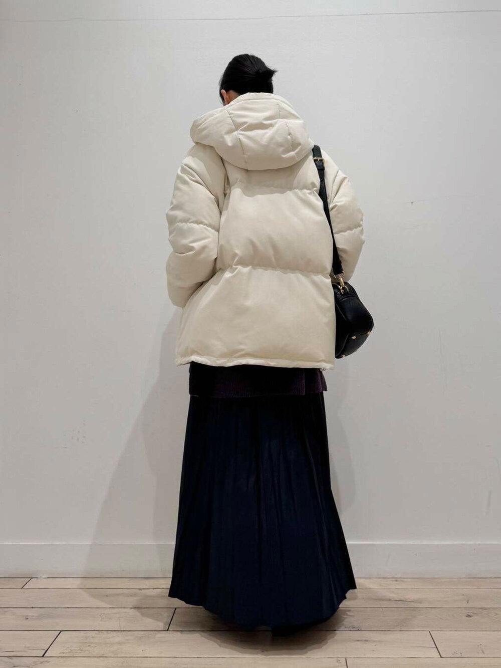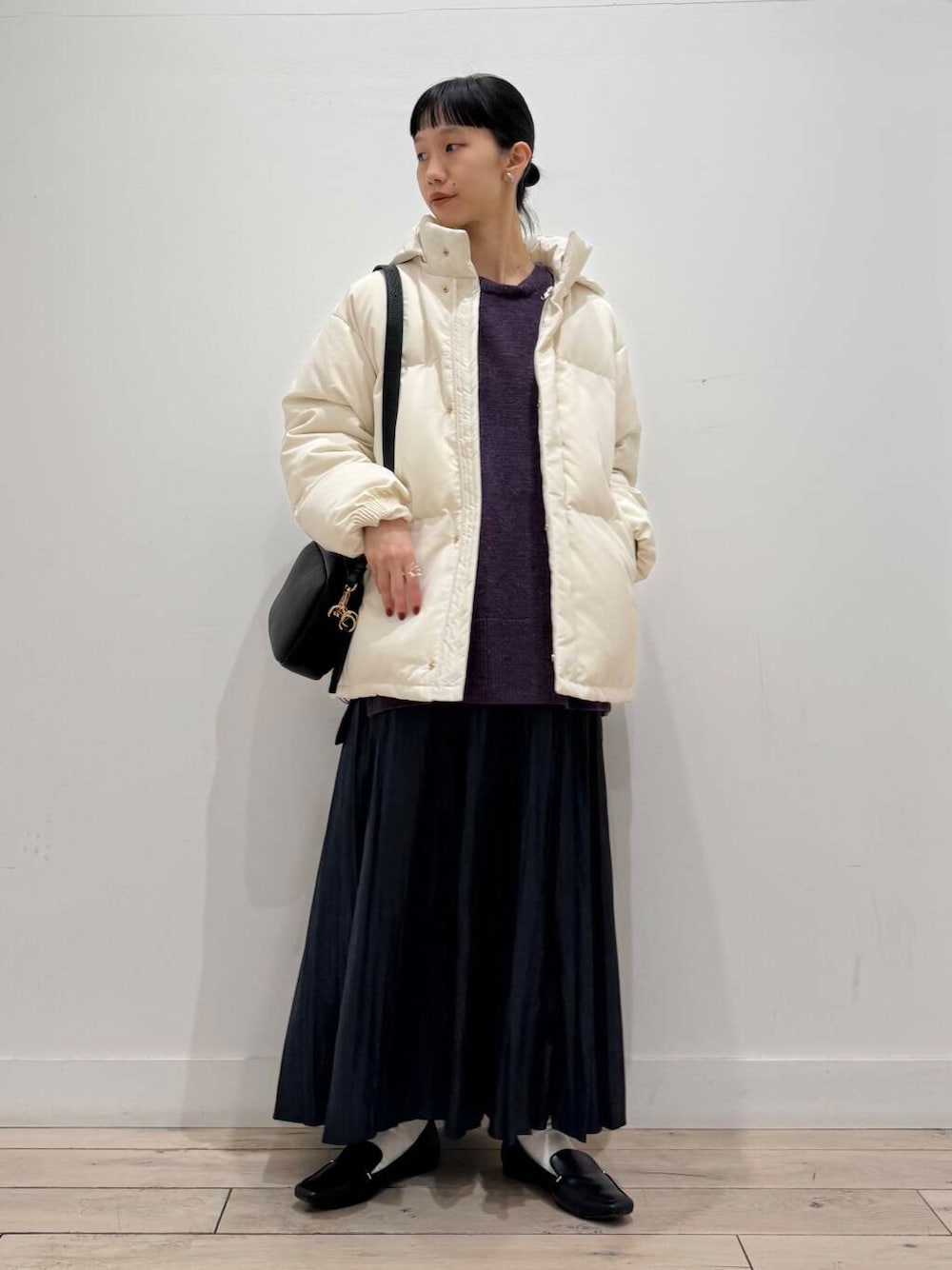 丈が短いダウンだと中のニットが出過ぎてしまいますが、こちらはミドル丈で長さがあるので、ニットのリブ部分がチラッと見えて前を閉めている時も差し色感があってかわいいです◎