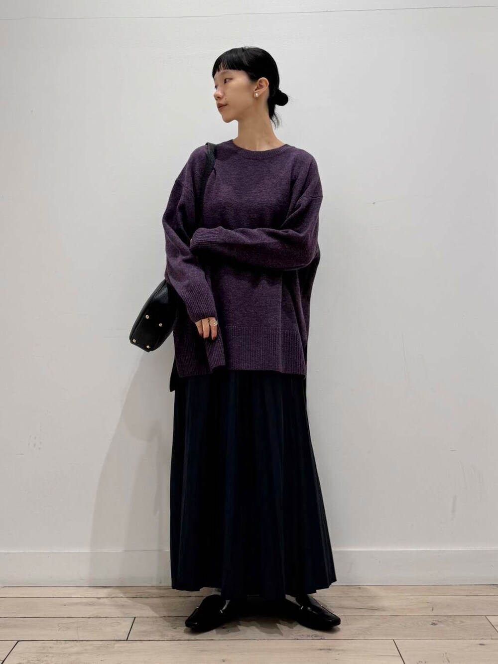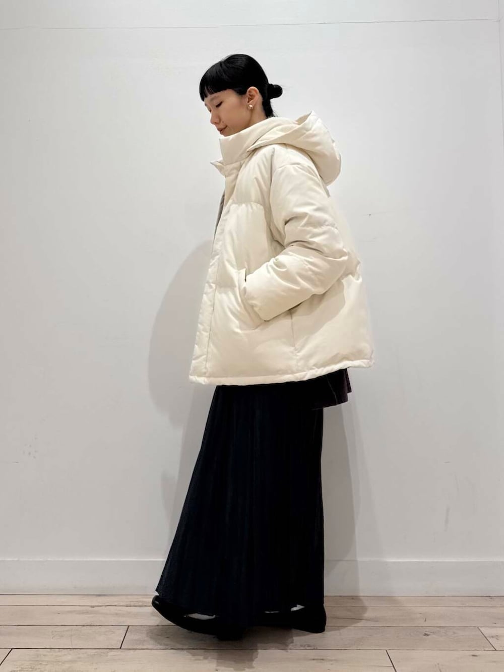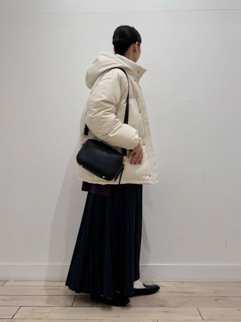 丈が短いダウンだと中のニットが出過ぎてしまいますが、こちらはミドル丈で長さがあるので、ニットのリブ部分がチラッと見えて前を閉めている時も差し色感があってかわいいです◎