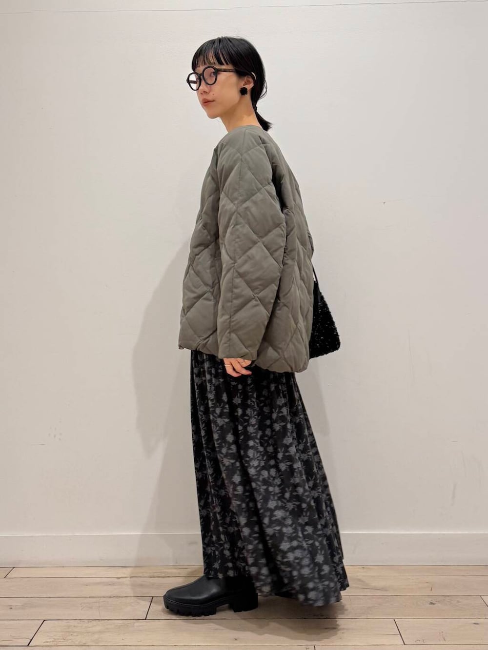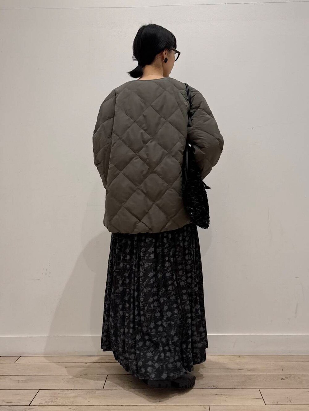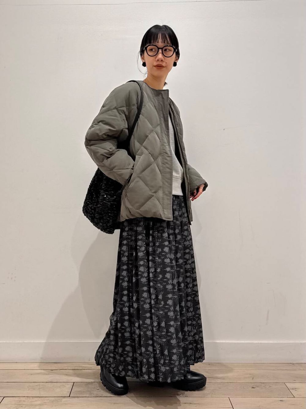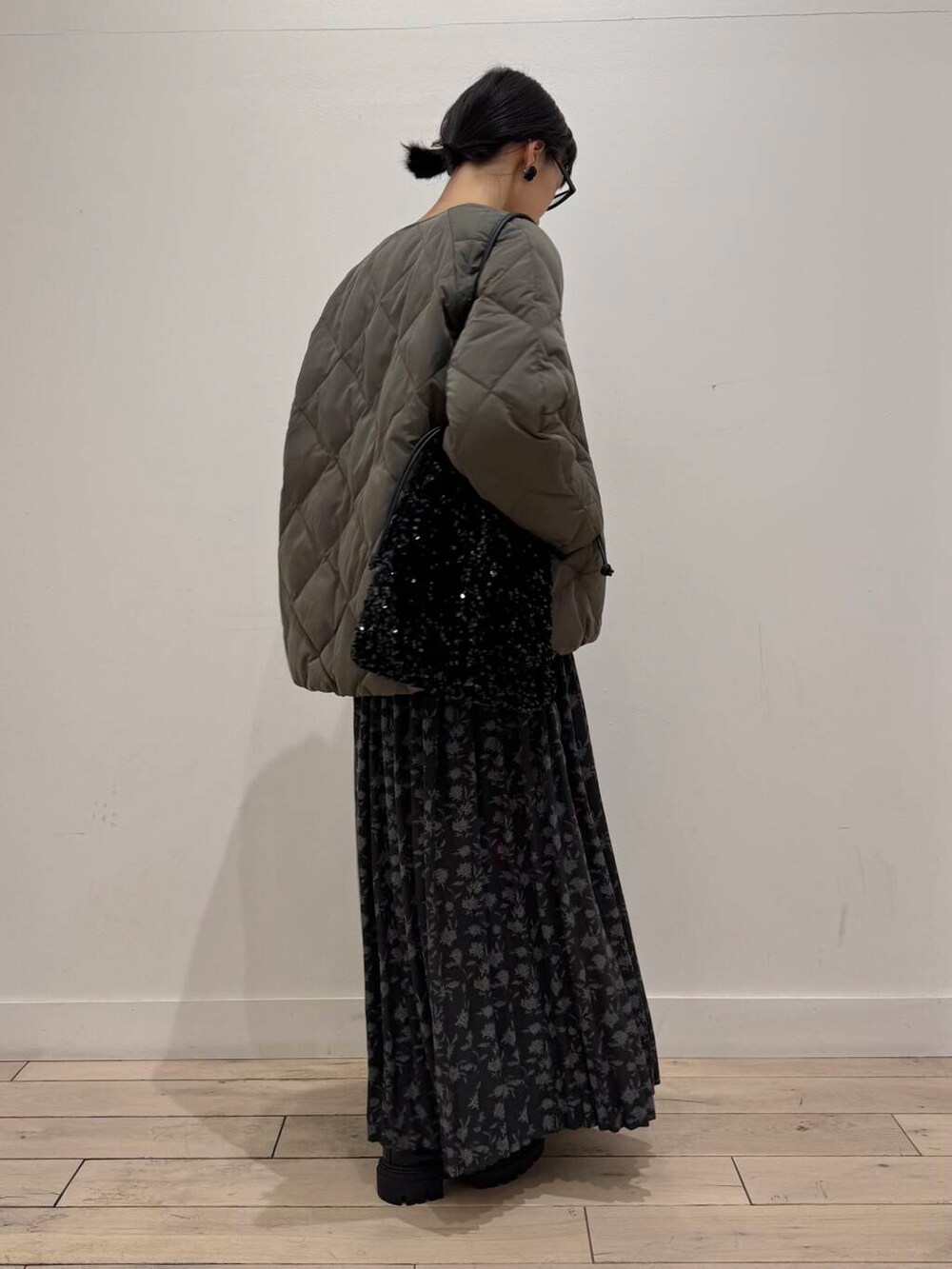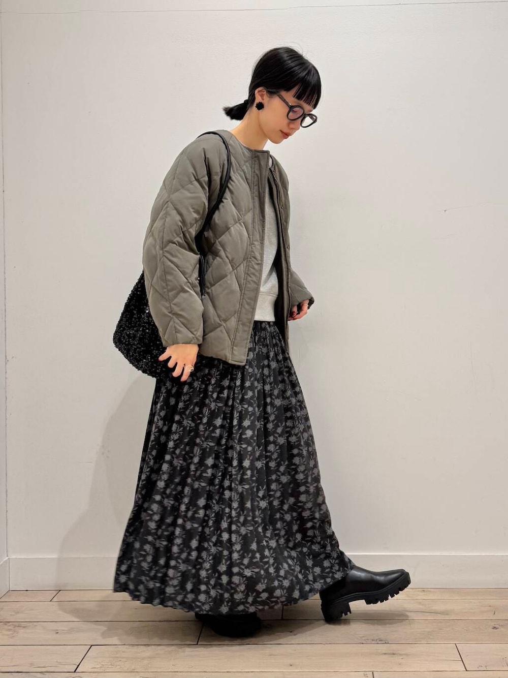 スカートはプリーツとフラワープリントでかわいらしいですが、色味がシックなのでシンプルに着用できます◎