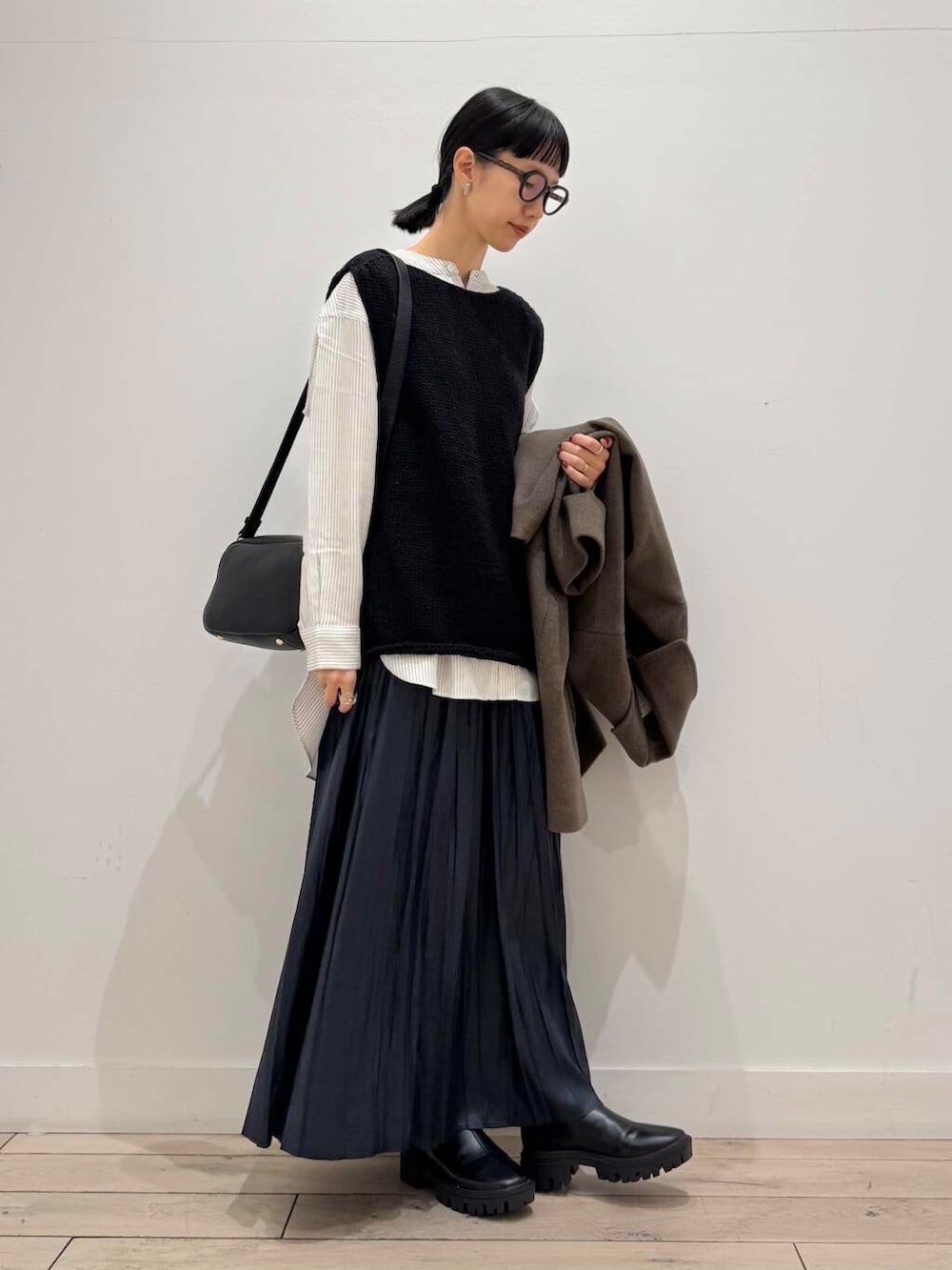 ストライプシャツにベストはオフィス感ありますが、シャツはバンドカラーで生地も柔らかいタイプなのと、ベストはペルーニットで温かみのあるアイテムなのでカジュアル感を出してくれます◎