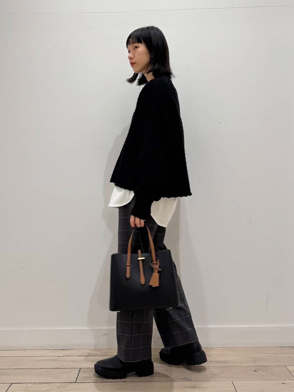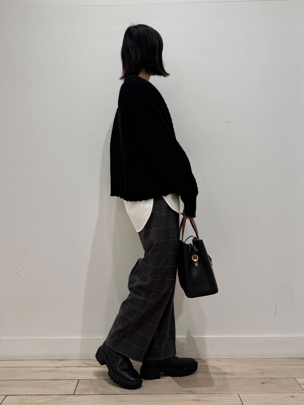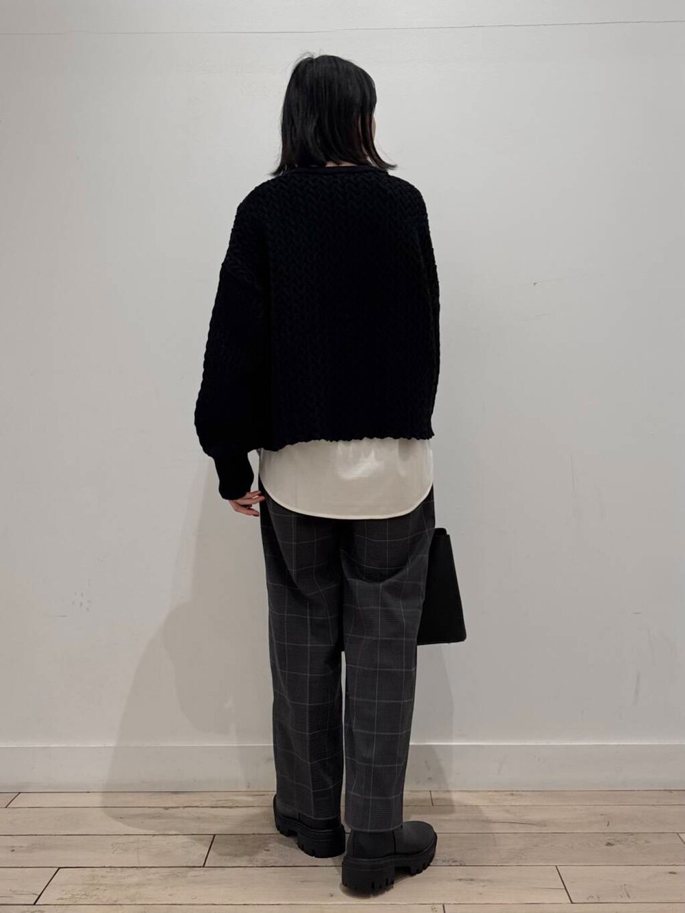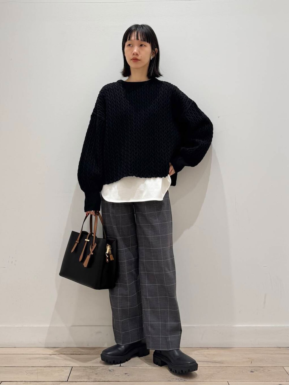 ヘリンボーン柄のニットが入荷してます。細かいケーブル編みより甘くならないので、系統問わず使いやすいです◎