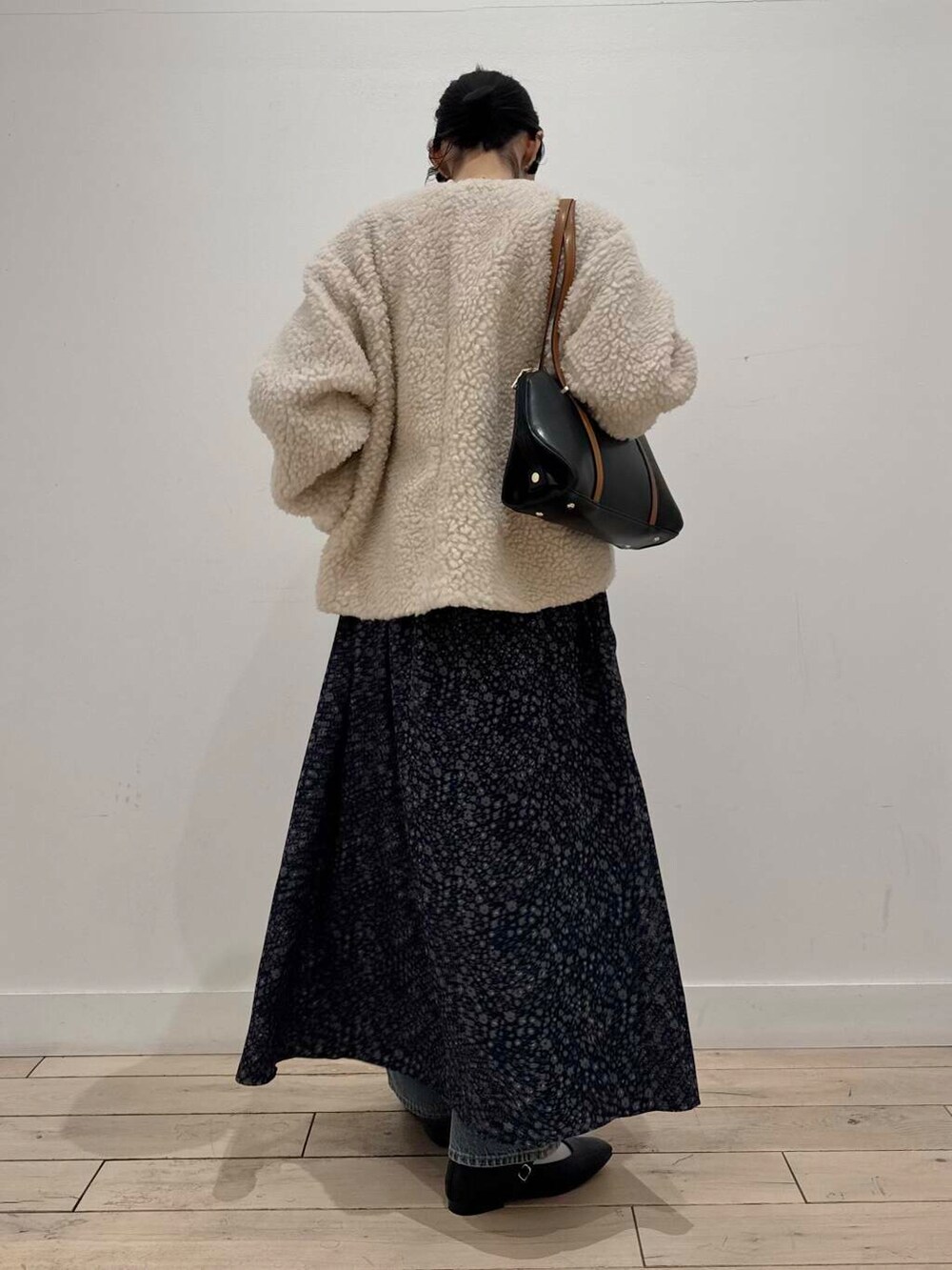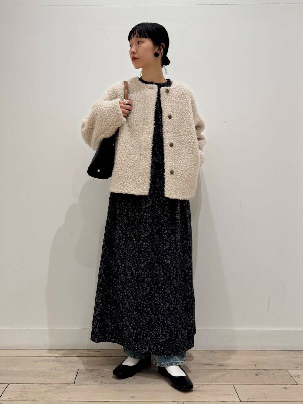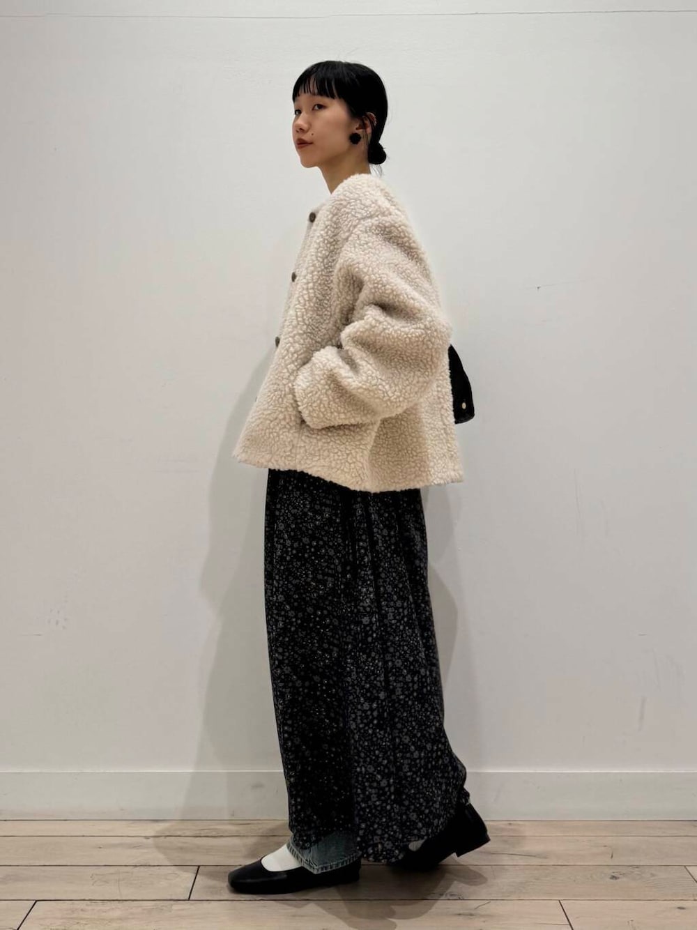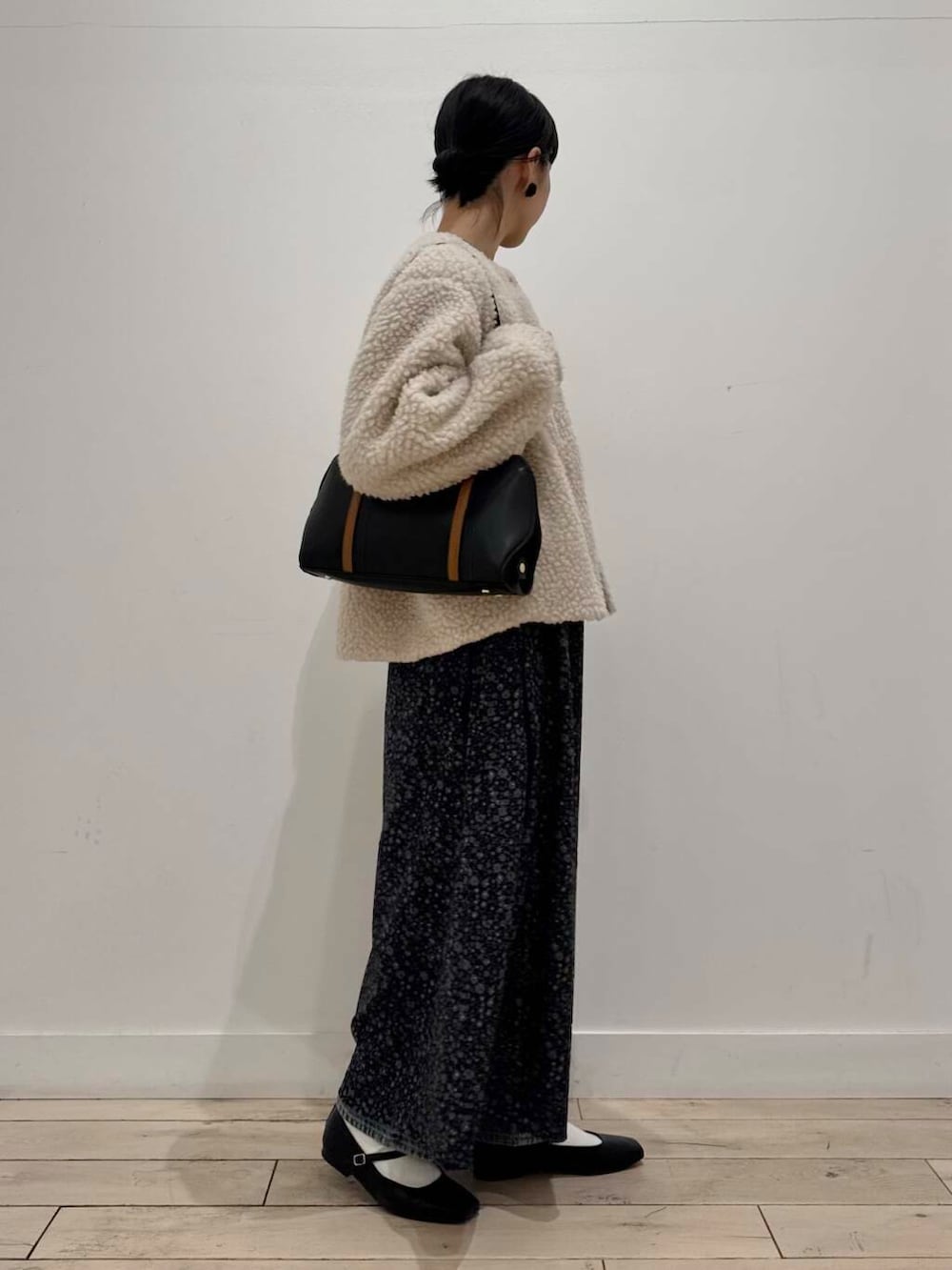 上半身にボアのアイテムだとボリュームが出るので、髪の毛はまとめて小顔効果狙いました◎