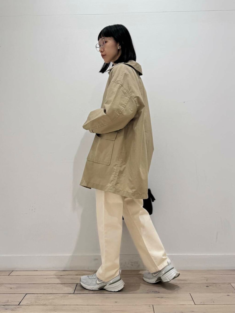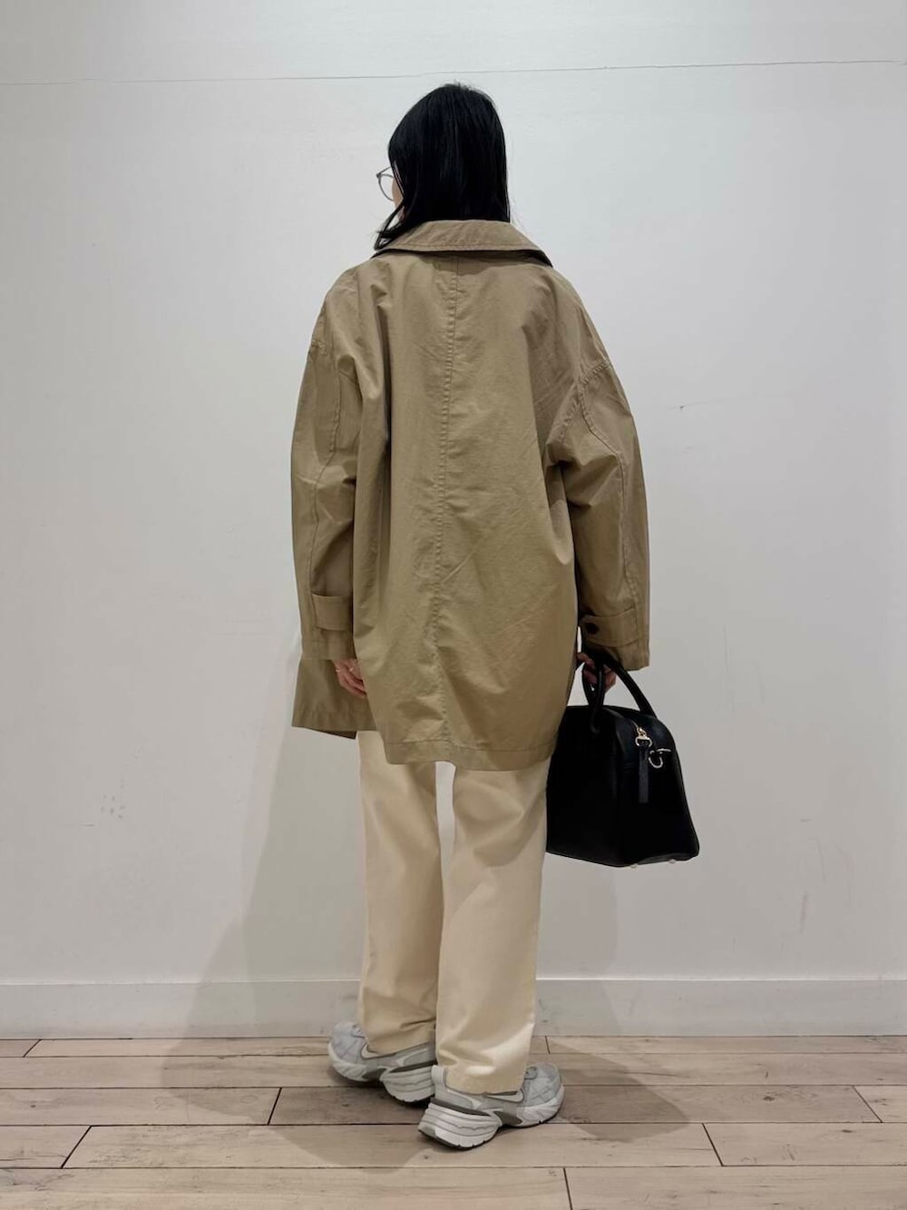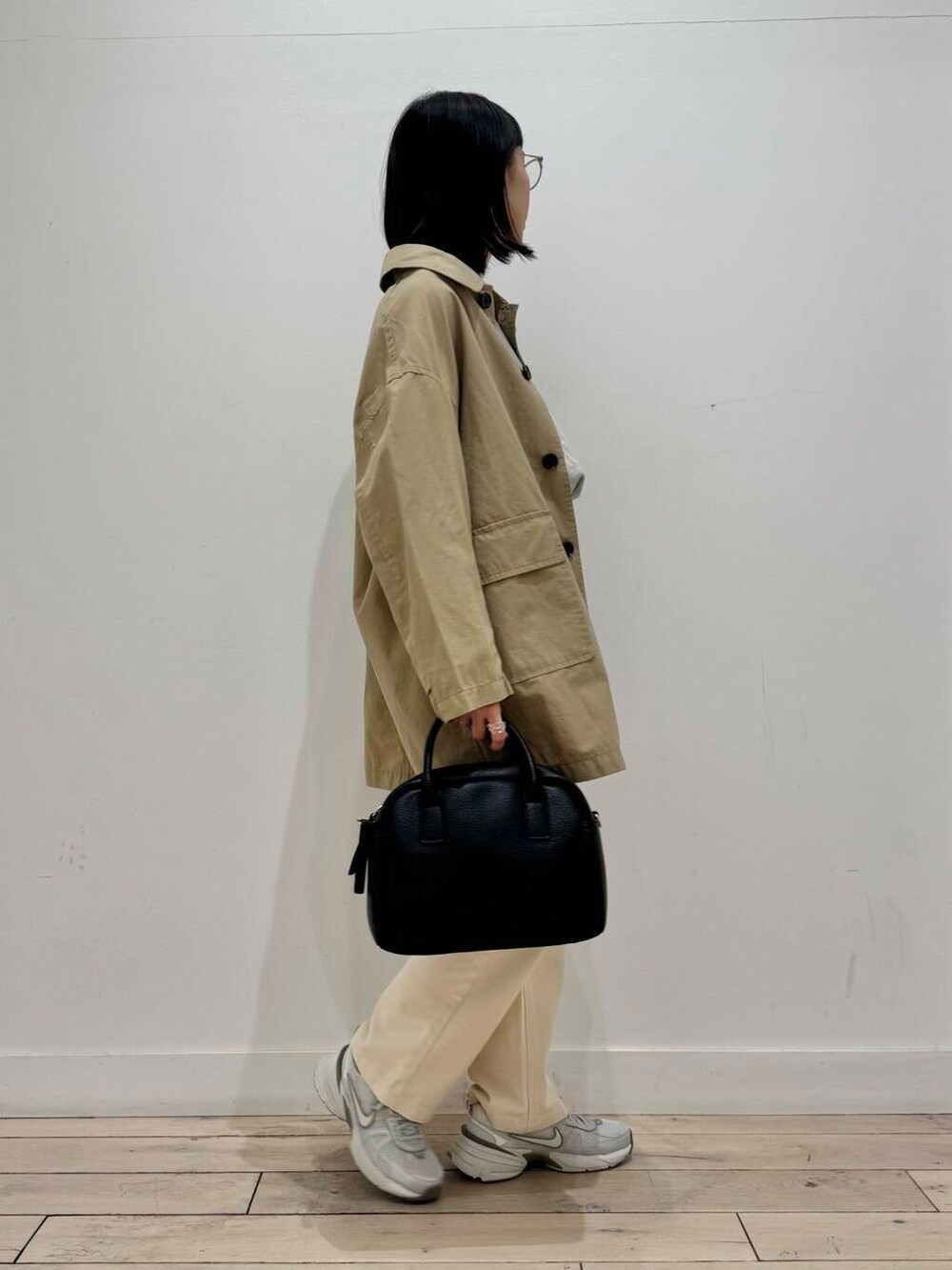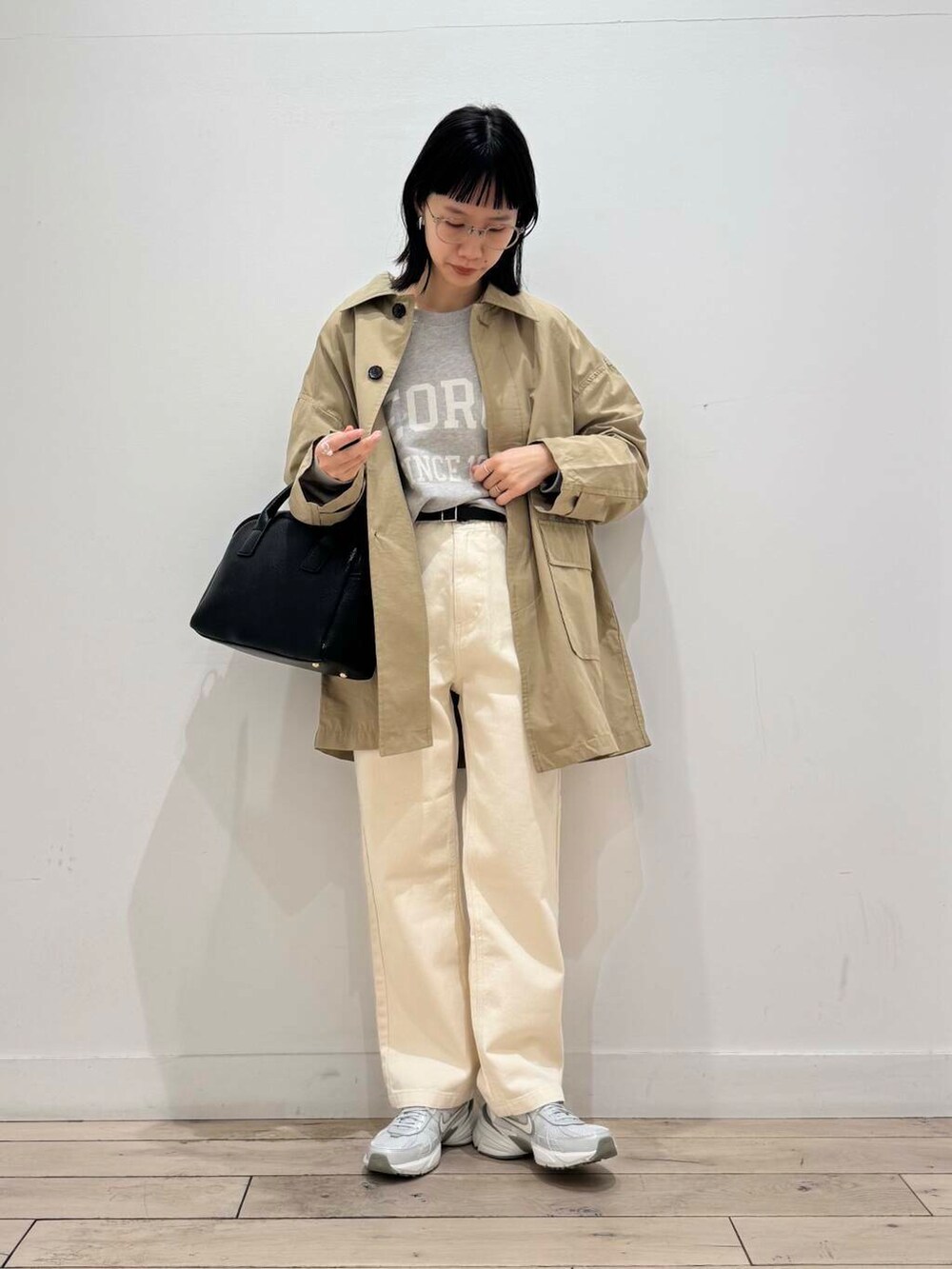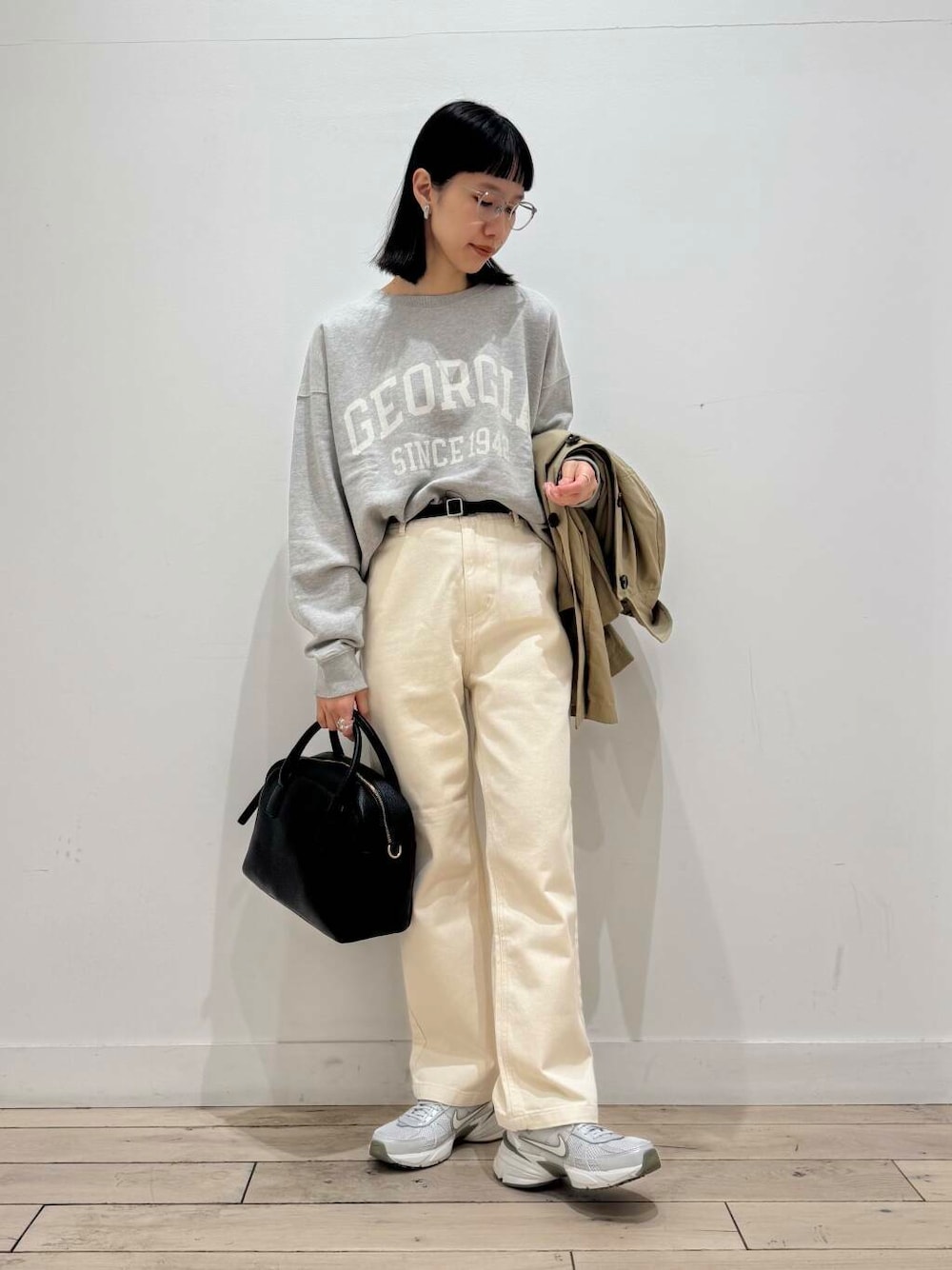 淡色だけだとぼやけやすいので、ベルトとバッグは黒で引き締めました。
