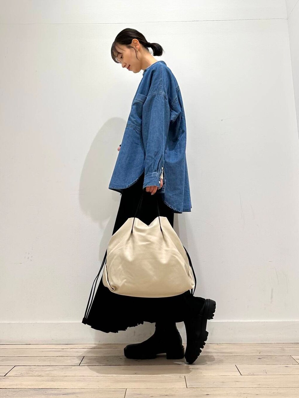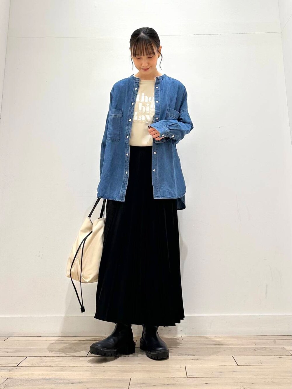 デニムシャツはバンドカラーになっており、顔周りもすっきりと見せてくれます◎