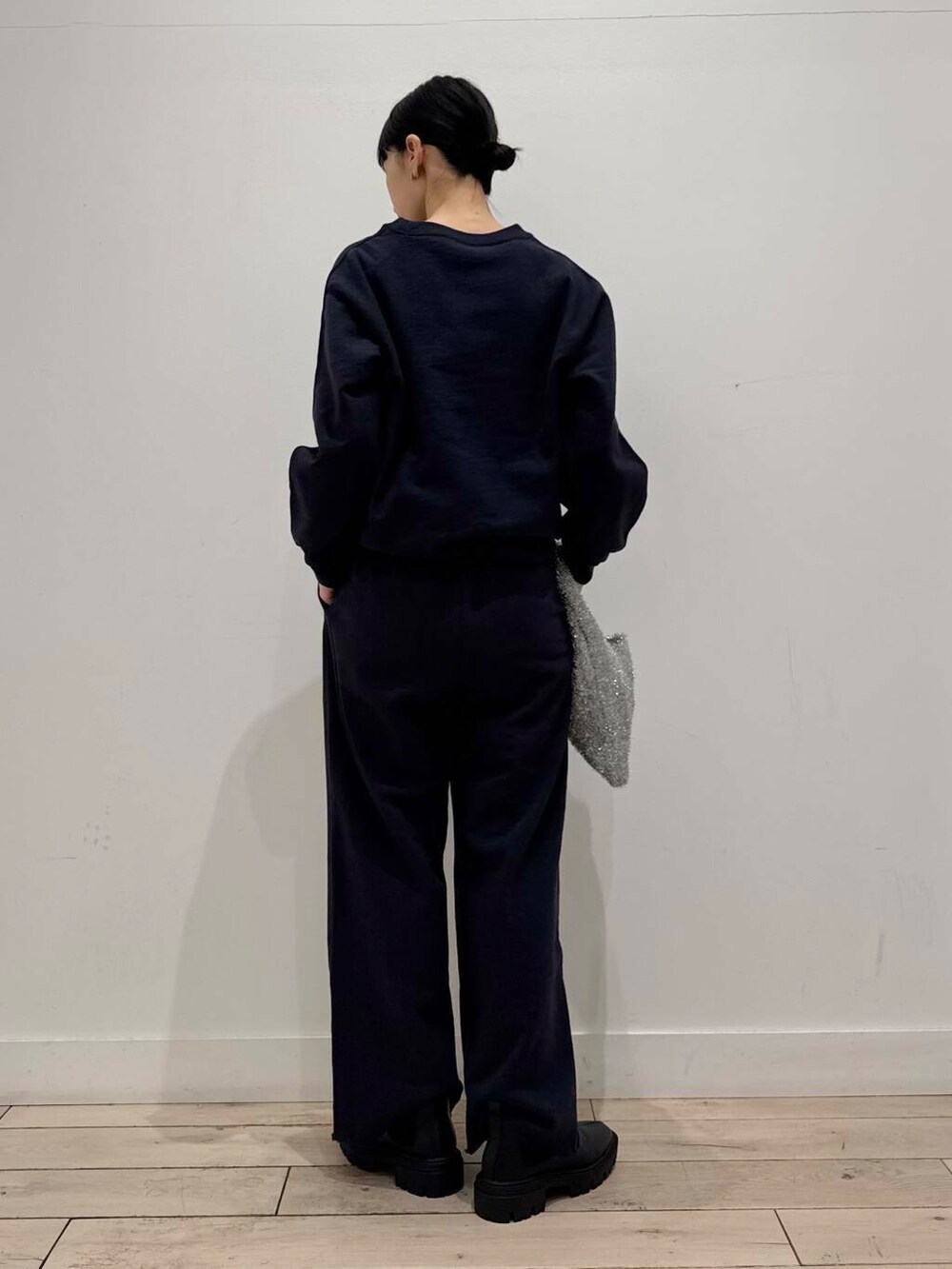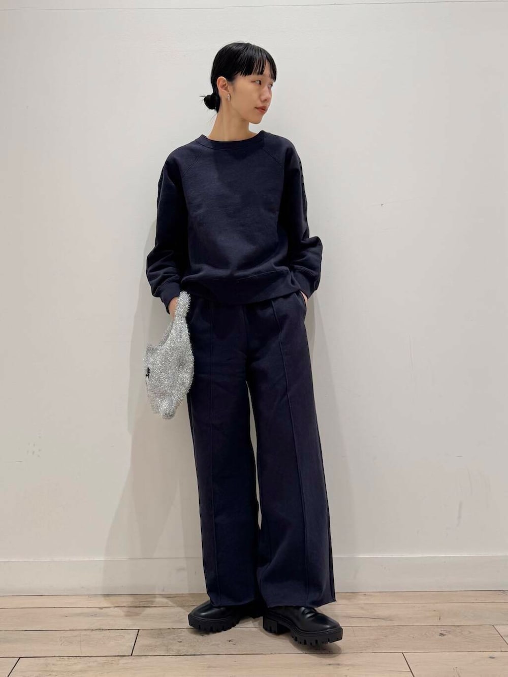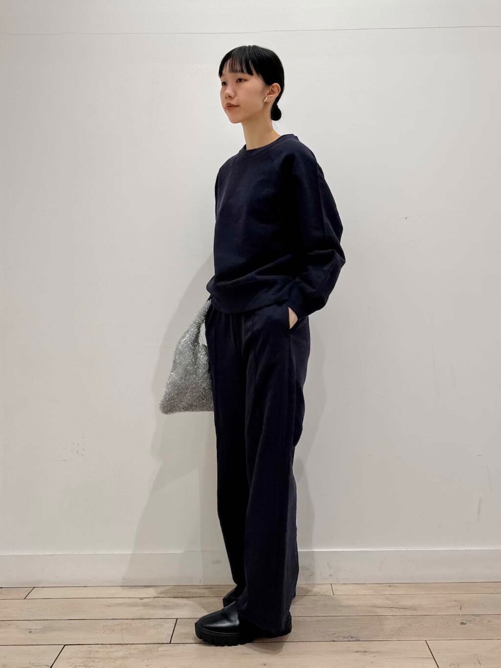 上下スウェットは明らかに部屋着感が出でしまいそうですが、パンツにセンタープレスが入っているのでだらっと見えません!