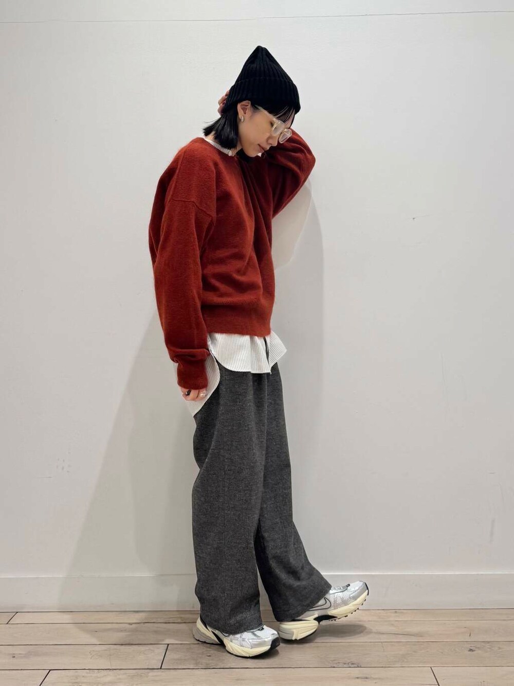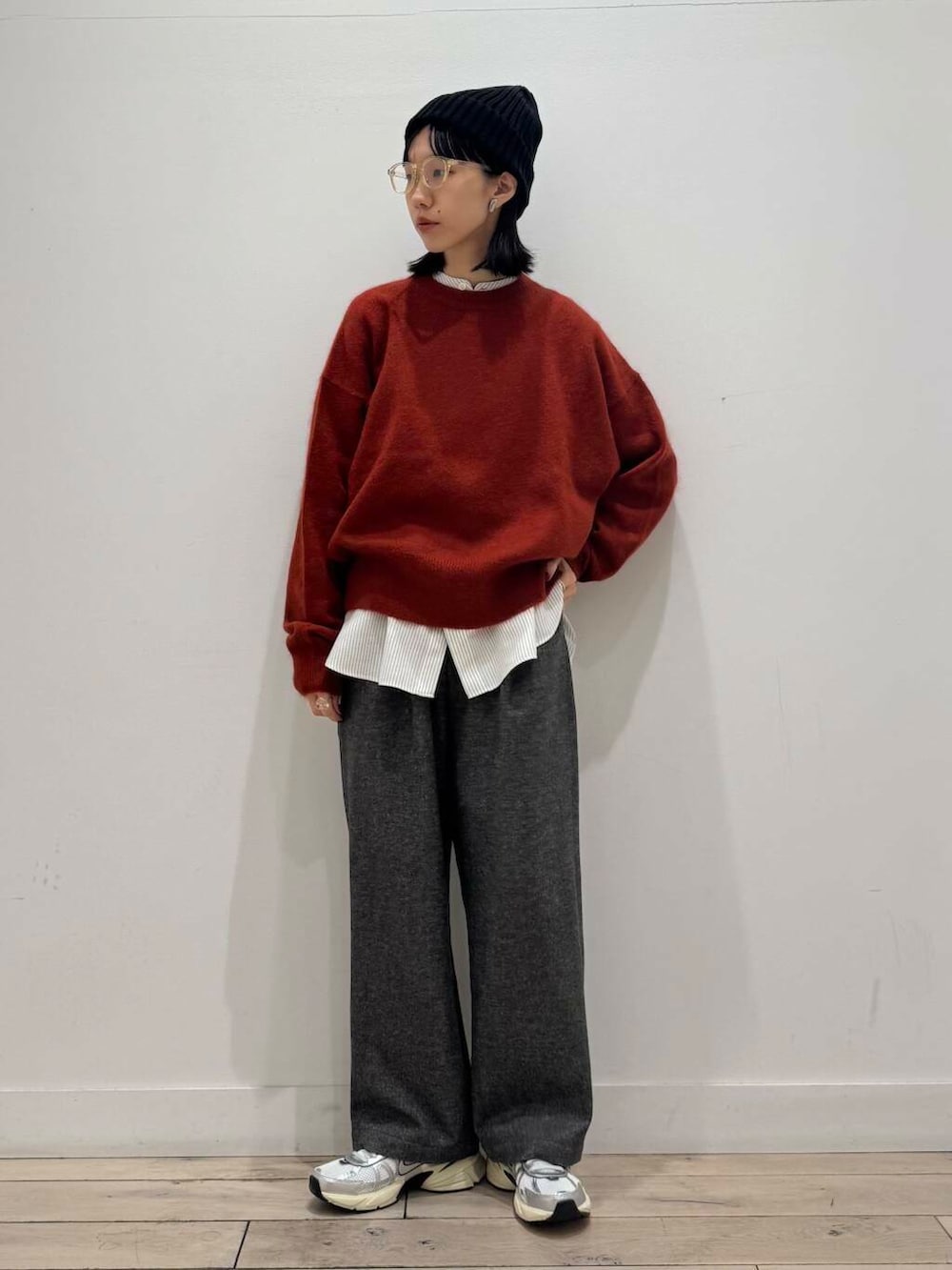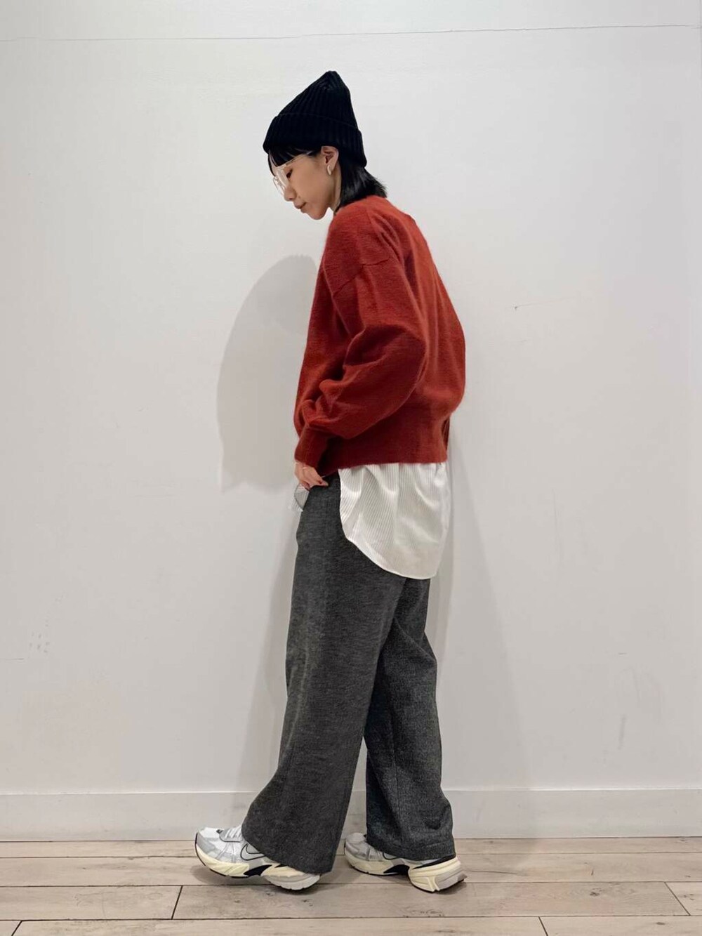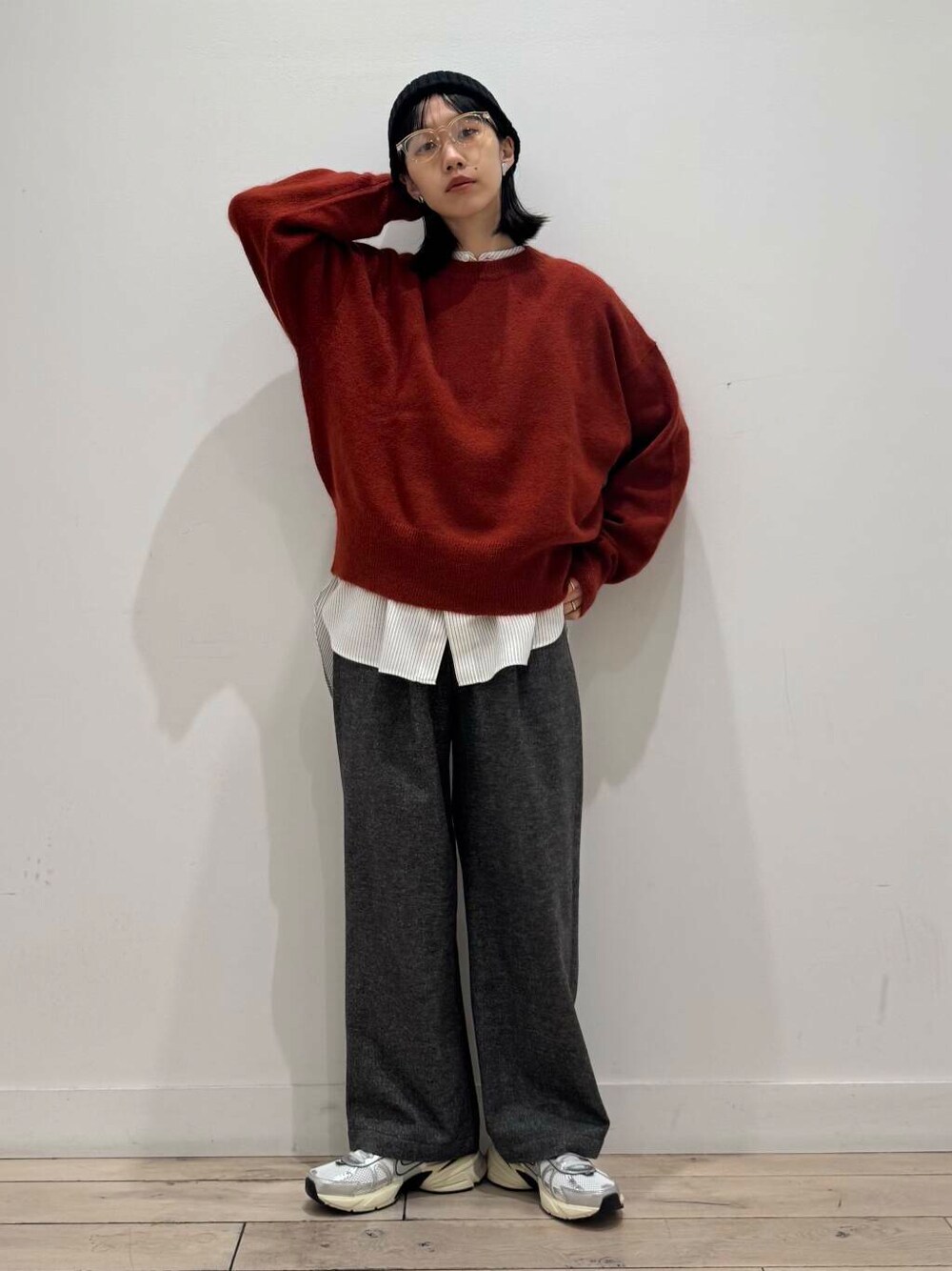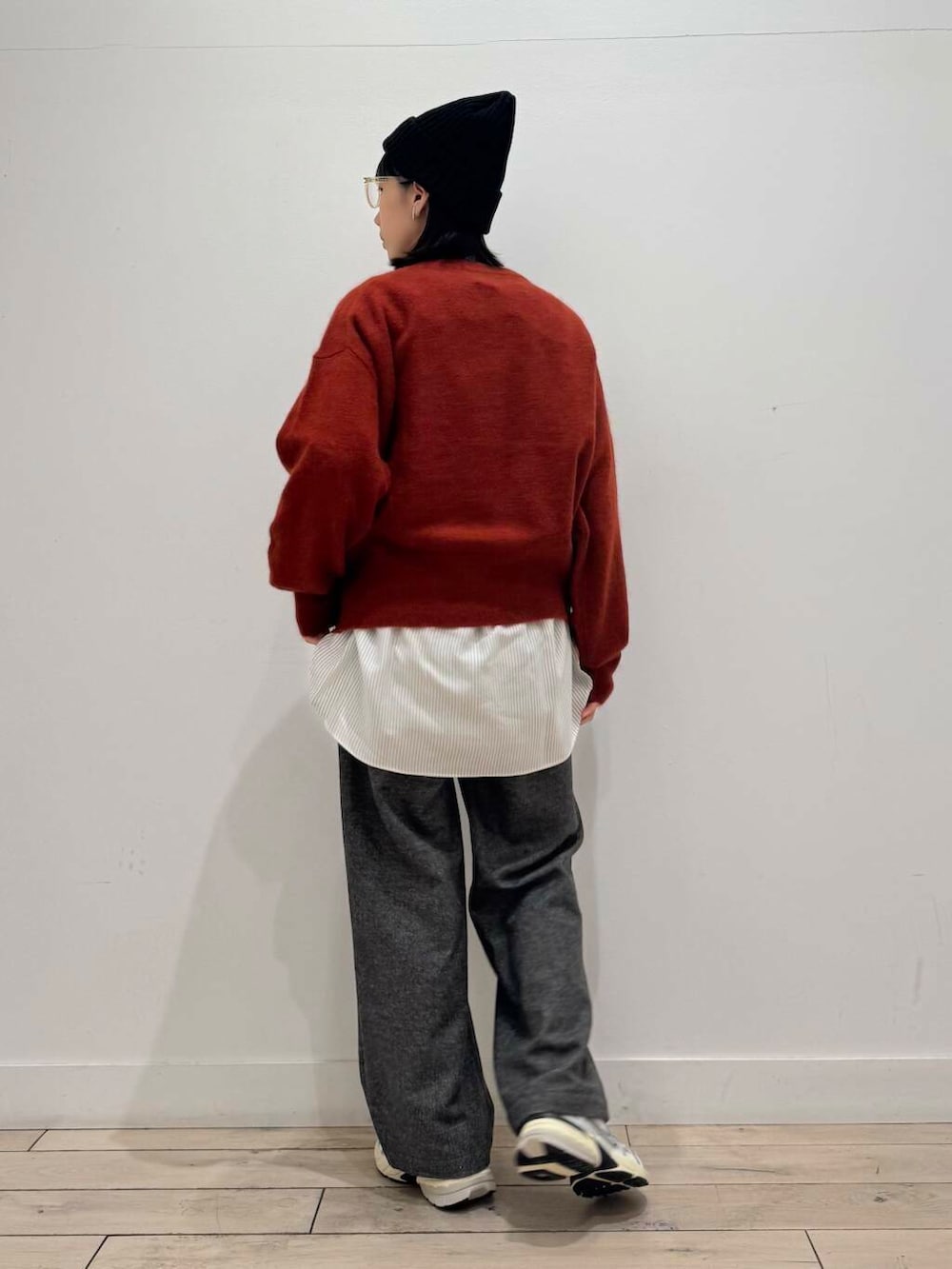 モヘアニットのカラー、REDなのですがブラウンみもあってトーン暗めの色です!派手さがなく、シンプルな雰囲気で使えます◎