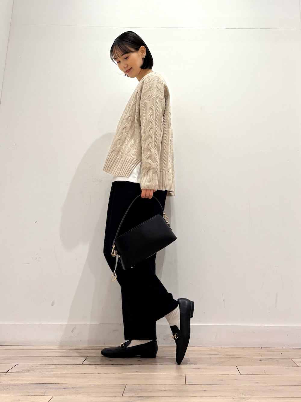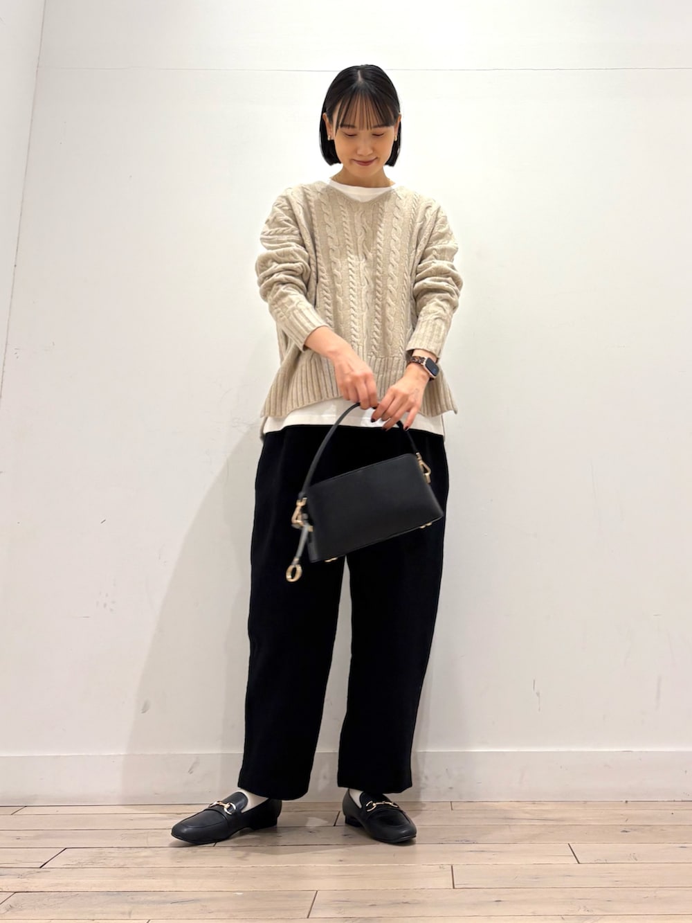 アラン柄がポイントになってくれるこちらのニットは浅めのVネックになっており、顔まわりをすっきりと見せてくれます👏