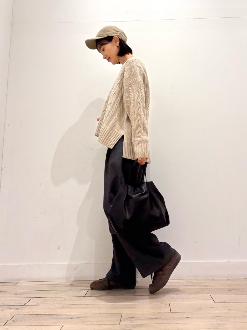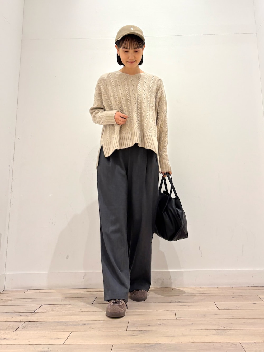 アラン柄がポイントになってくれるこちらのニットは浅めのVネックになっており、顔まわりをすっきりと見せてくれます👏