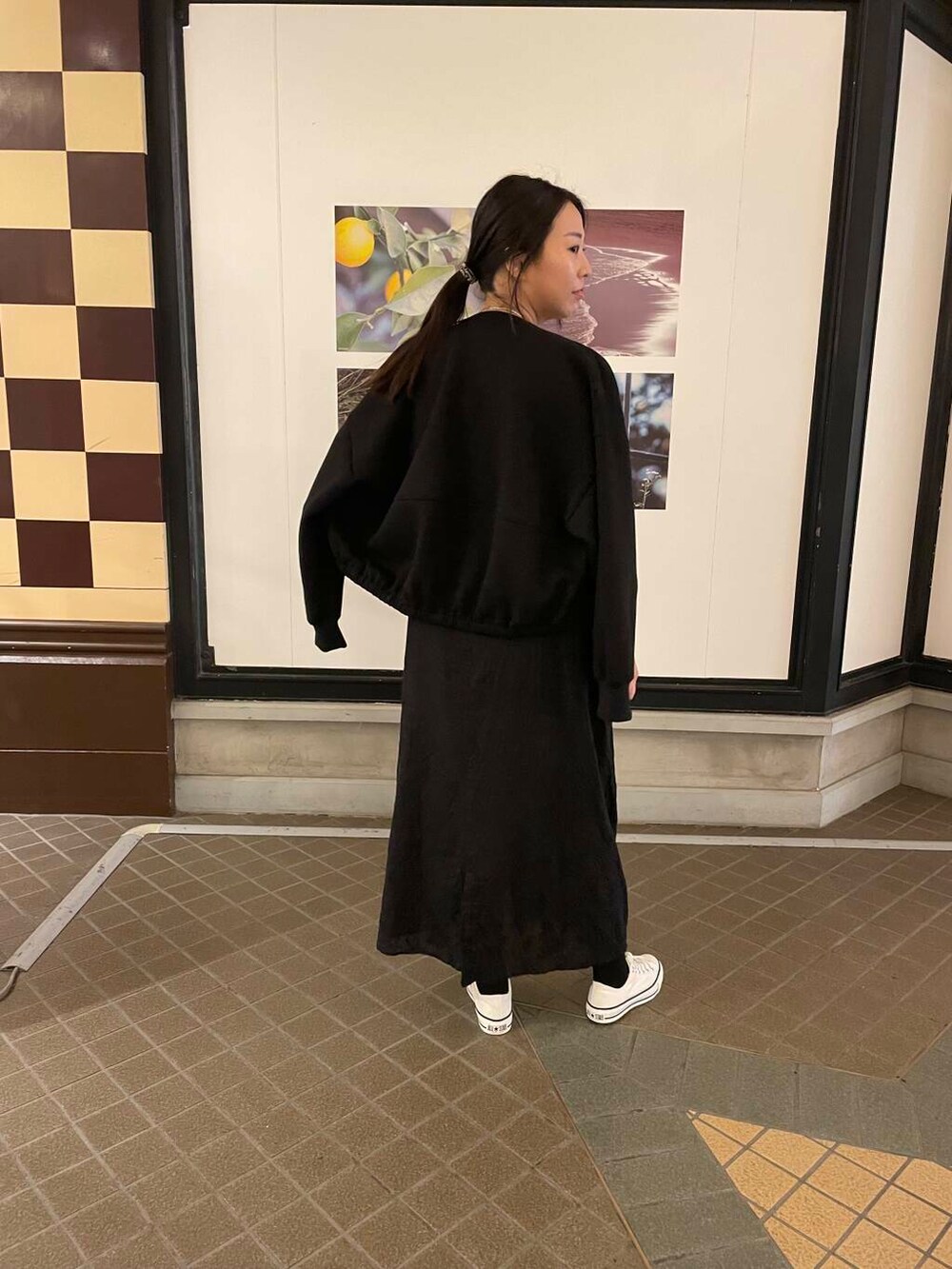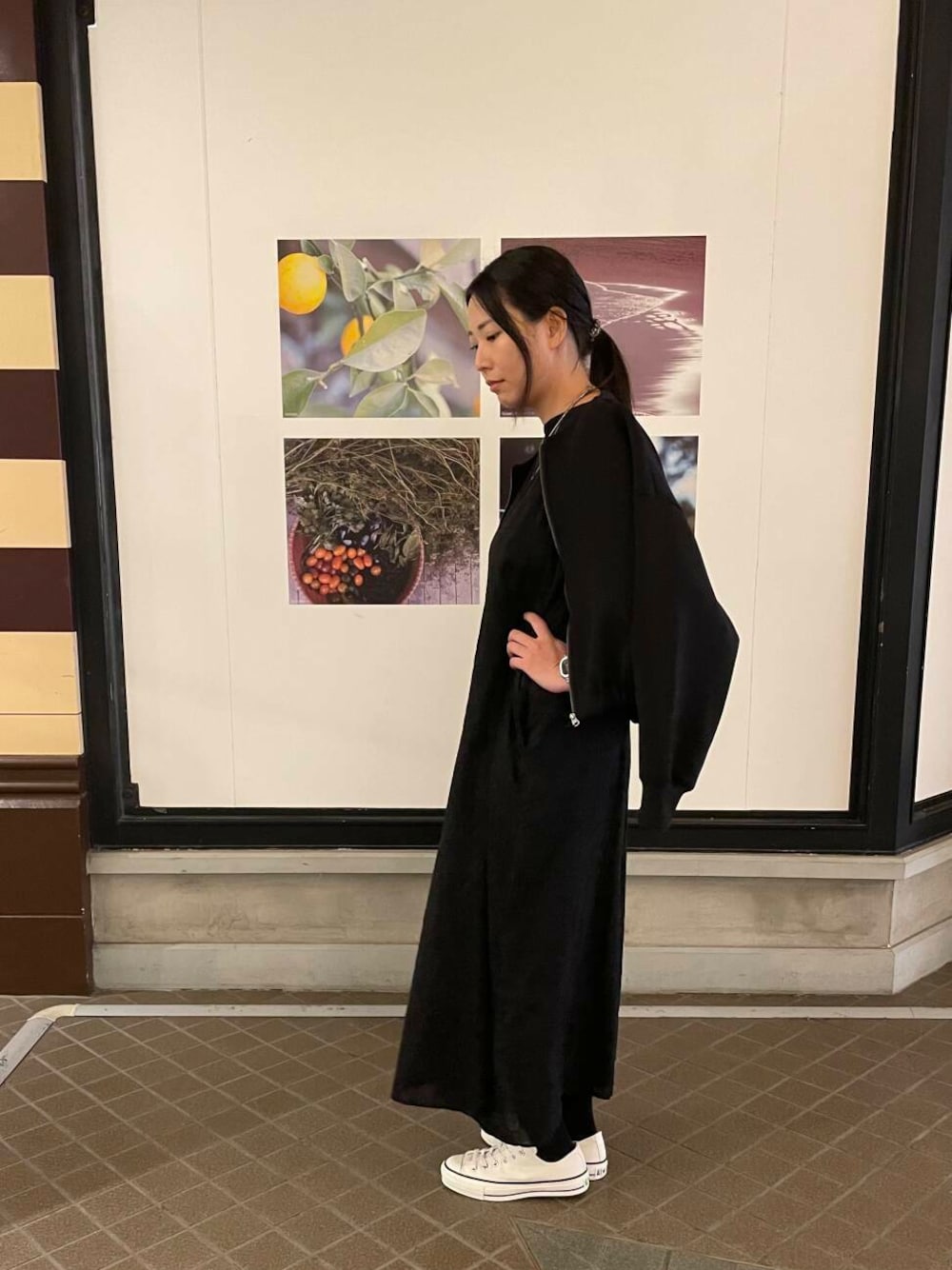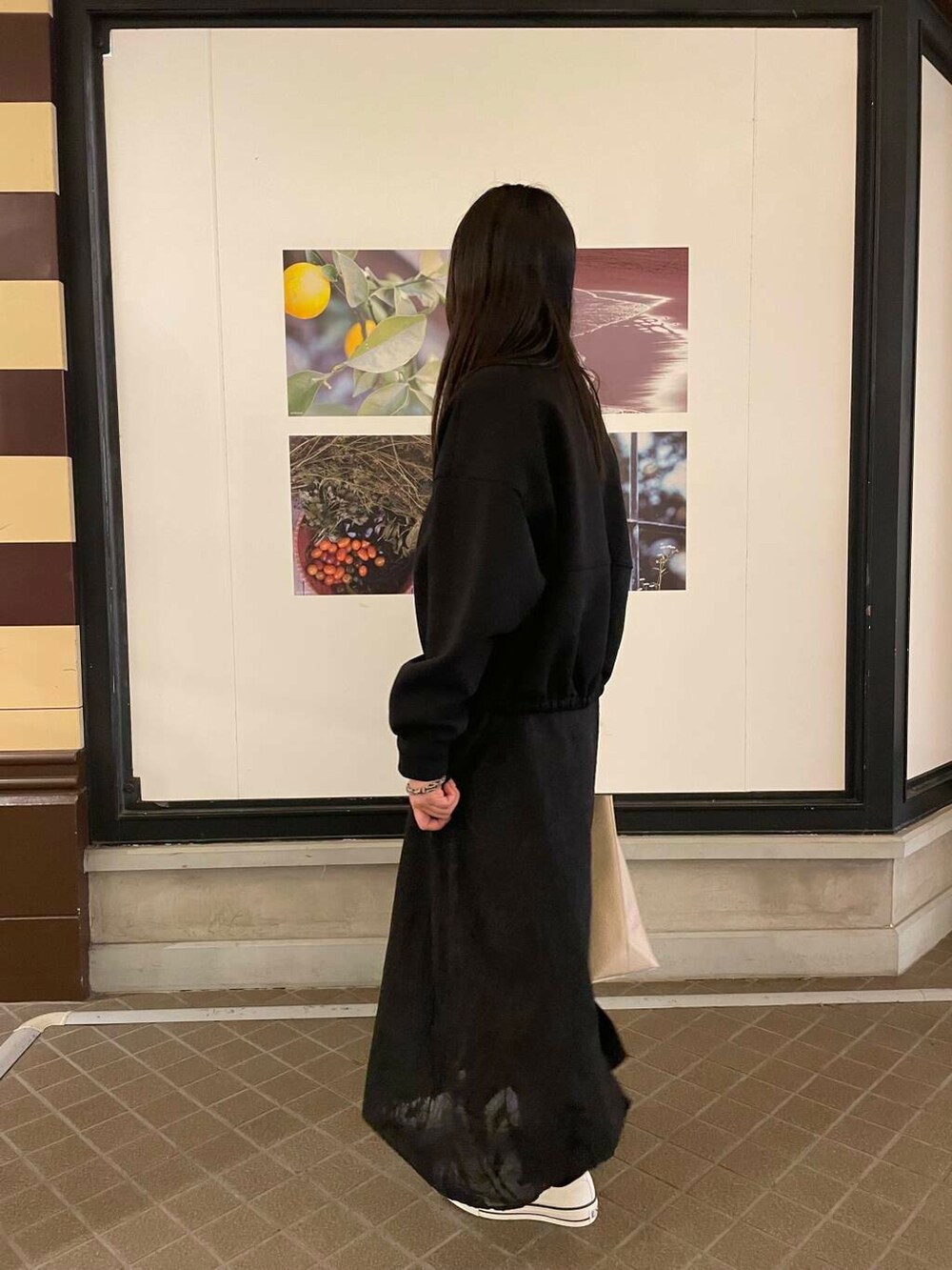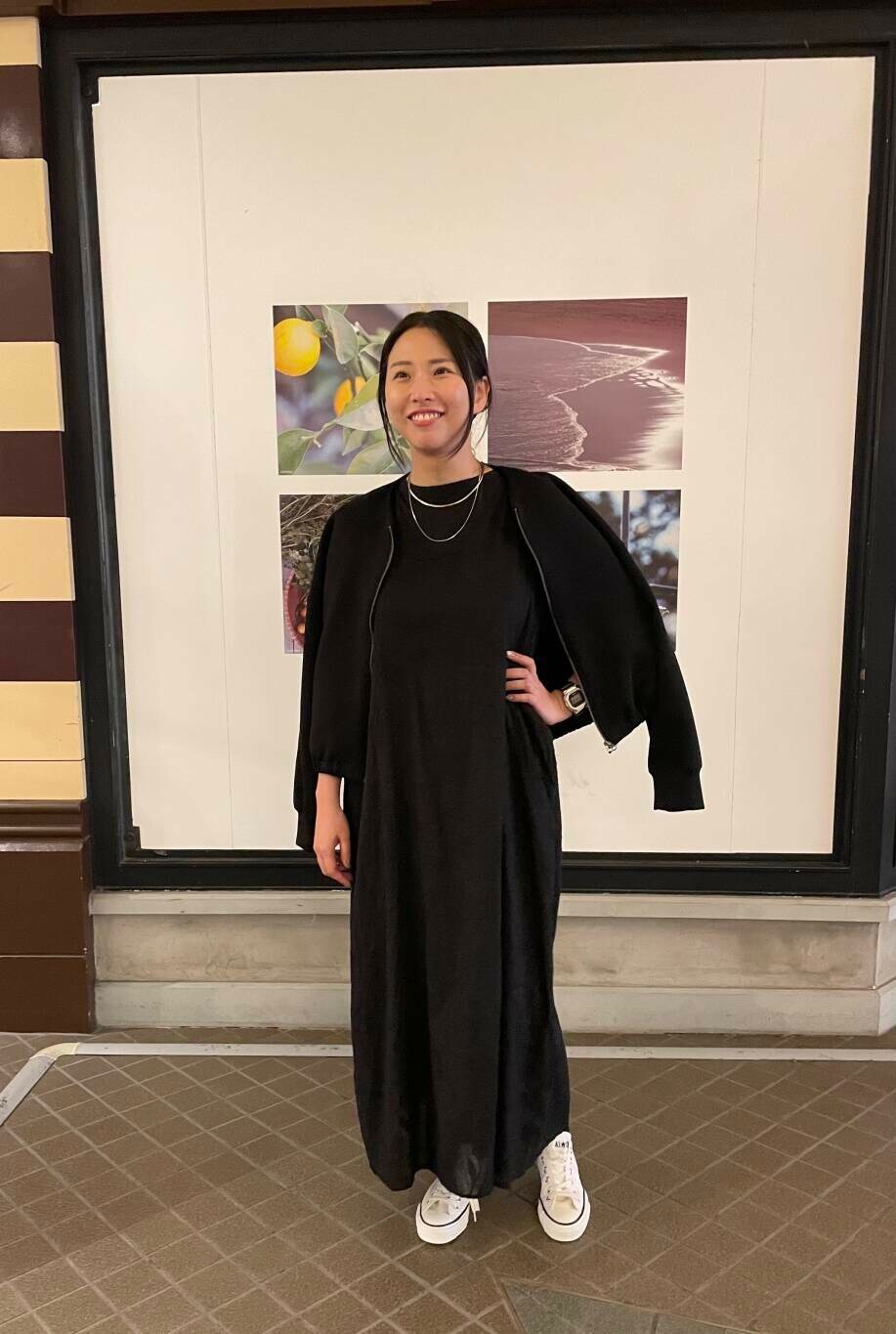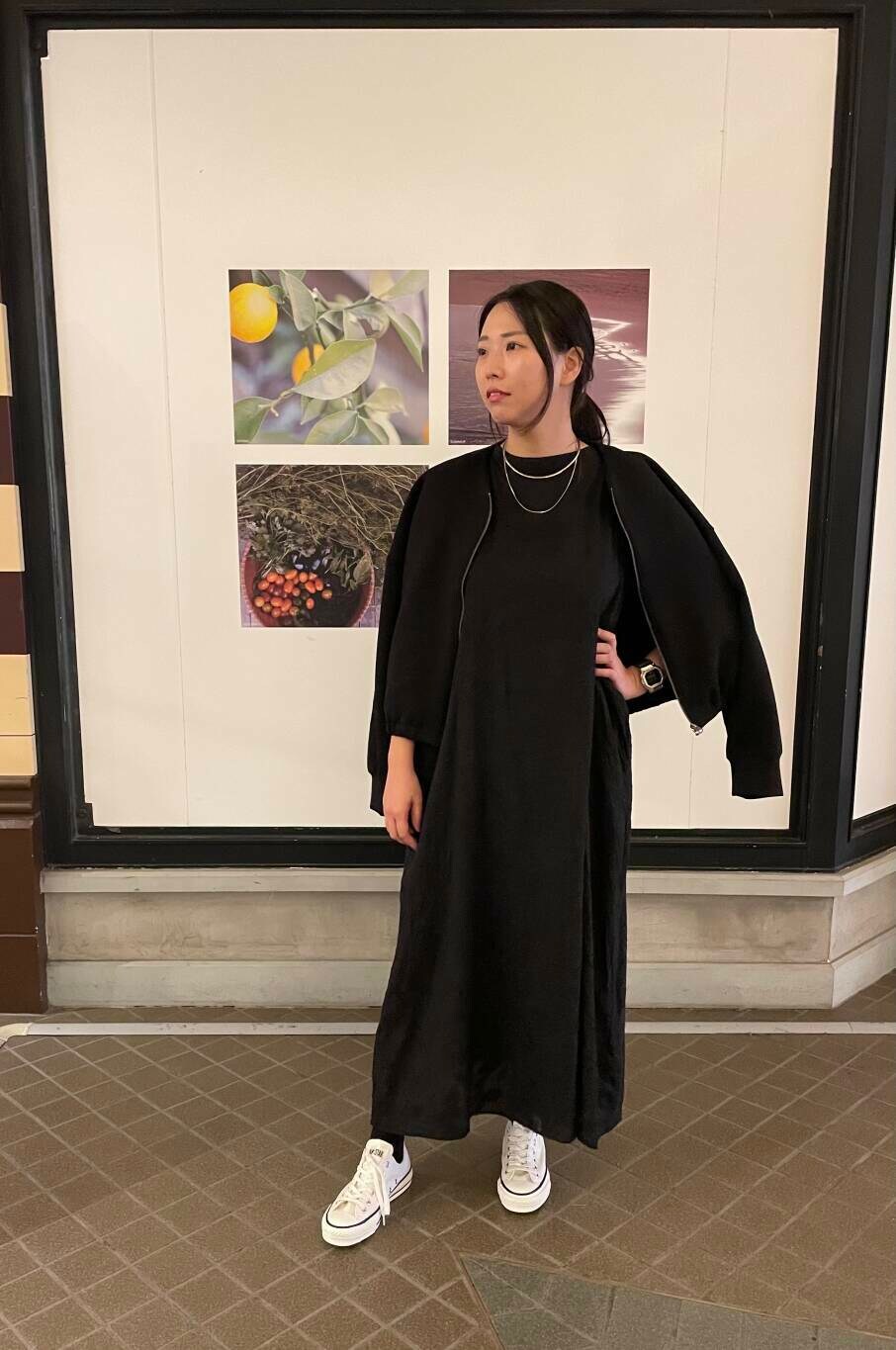 きちんと感のあるワンピースにスニーカーとパーカー風アウターを合わせてカジュアルダウン。