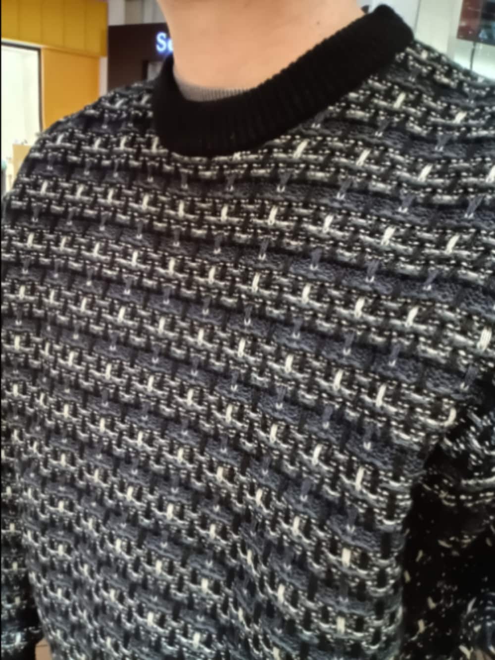 オシャレな柄のニットですが、色が控えめなモノトーンなので合わせやすさ抜群です。