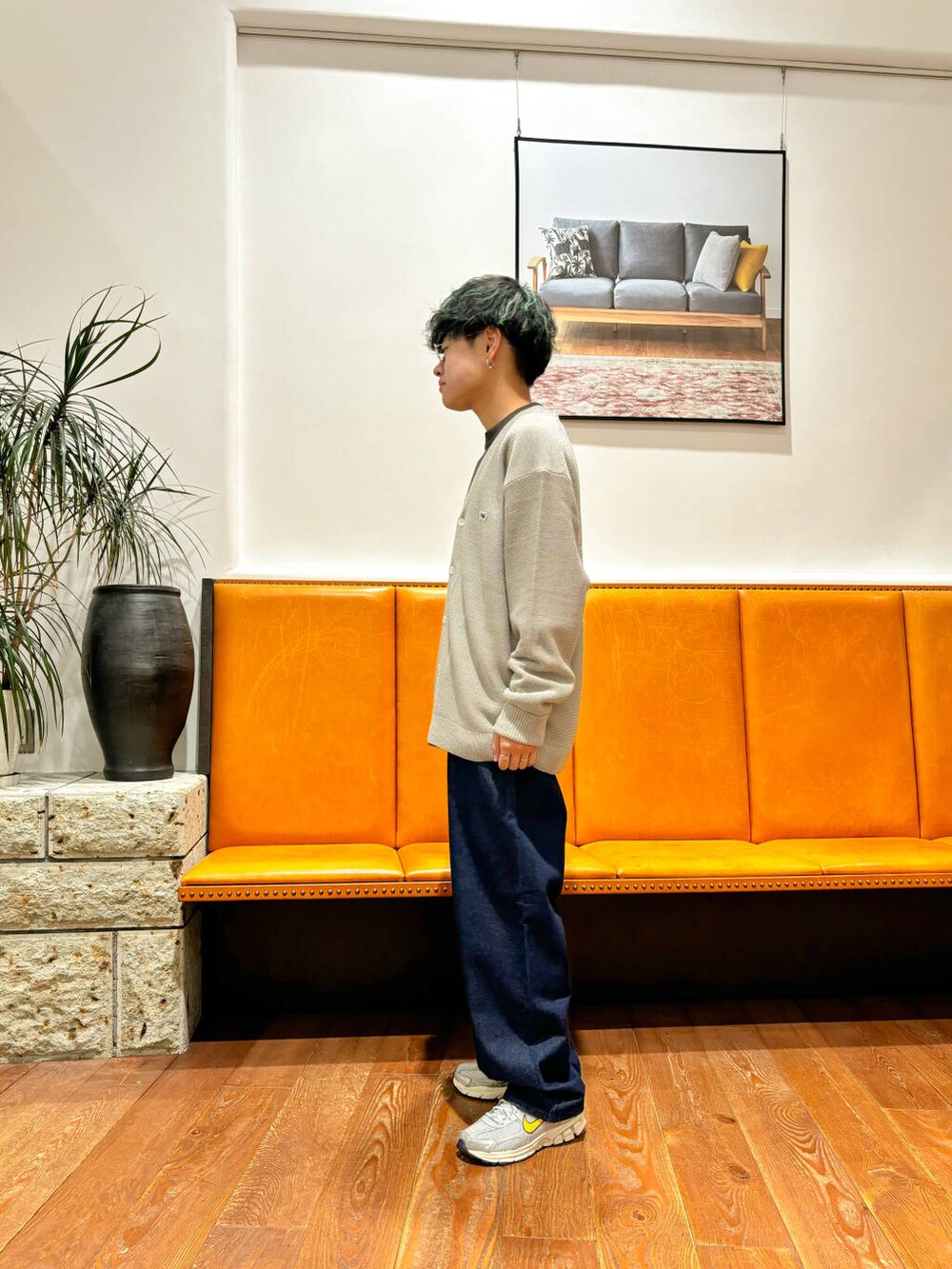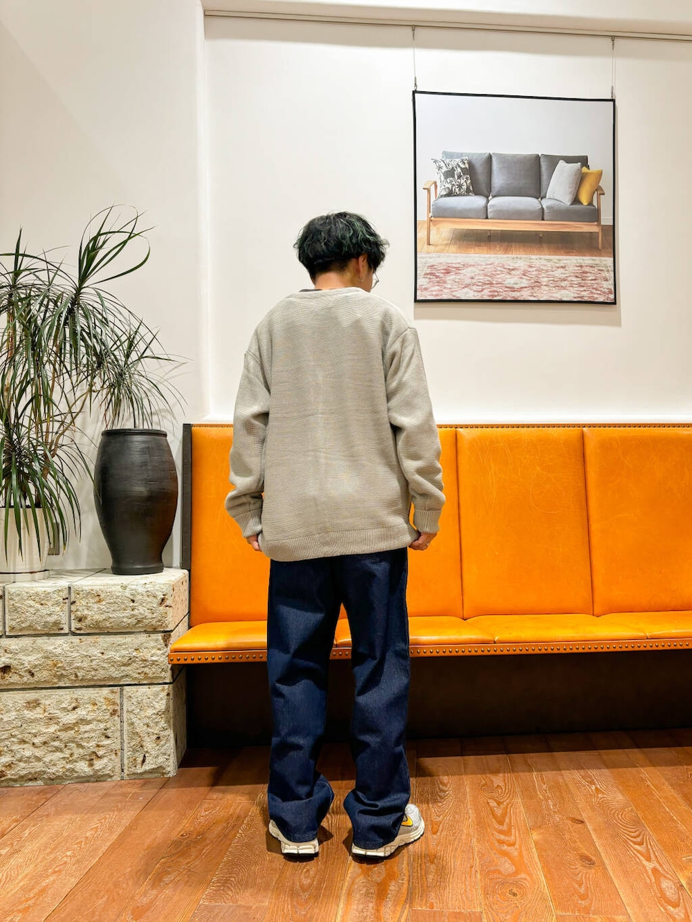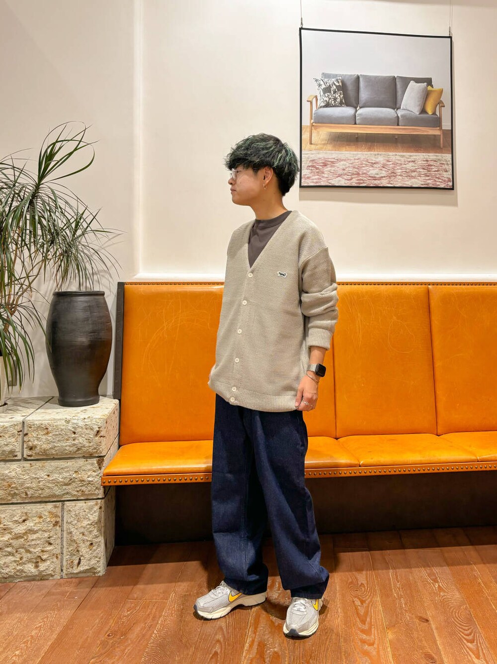 中はあえてブラウン系で合わせて統一感を、デニムはAWっぽく暗めの色にしてみました。