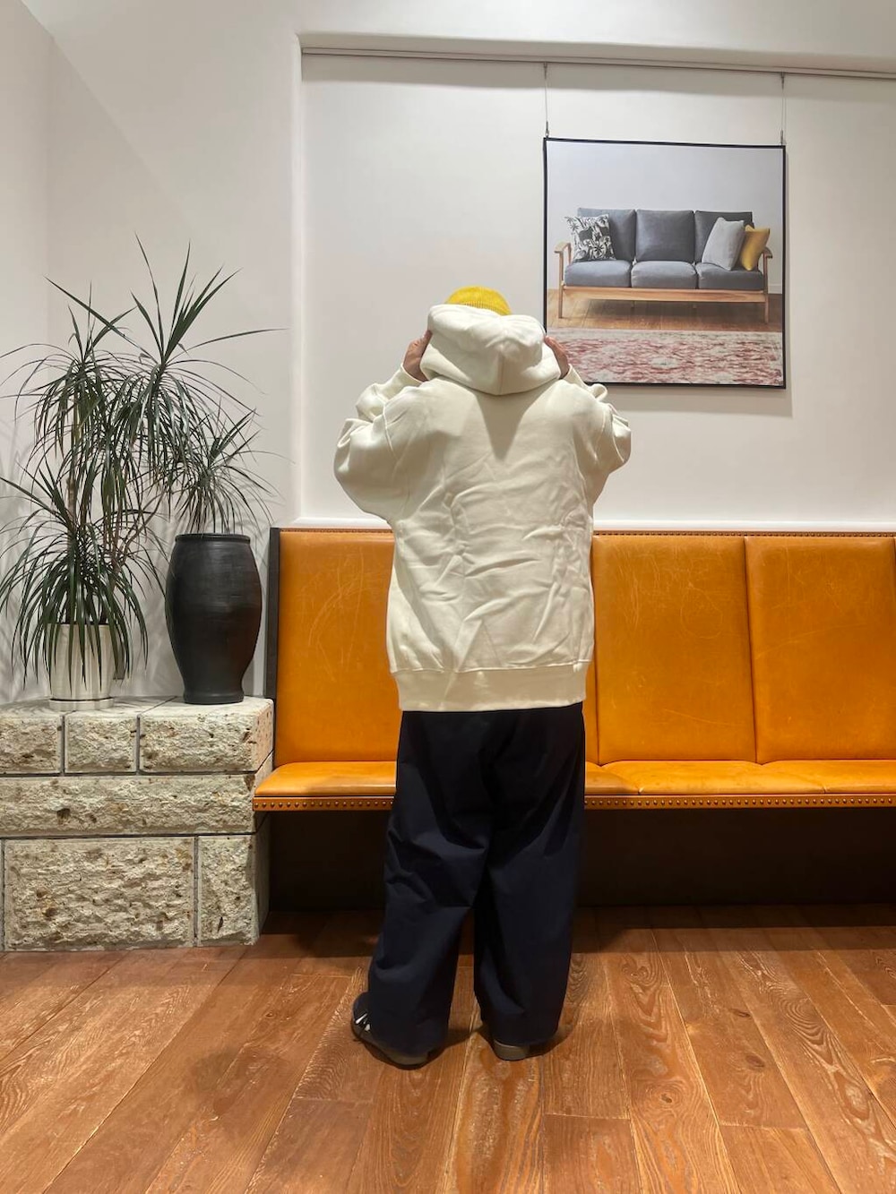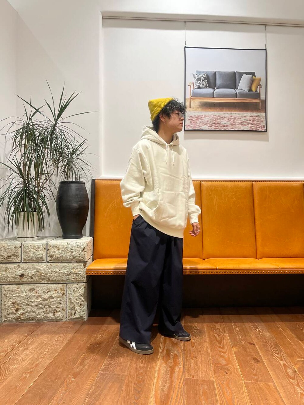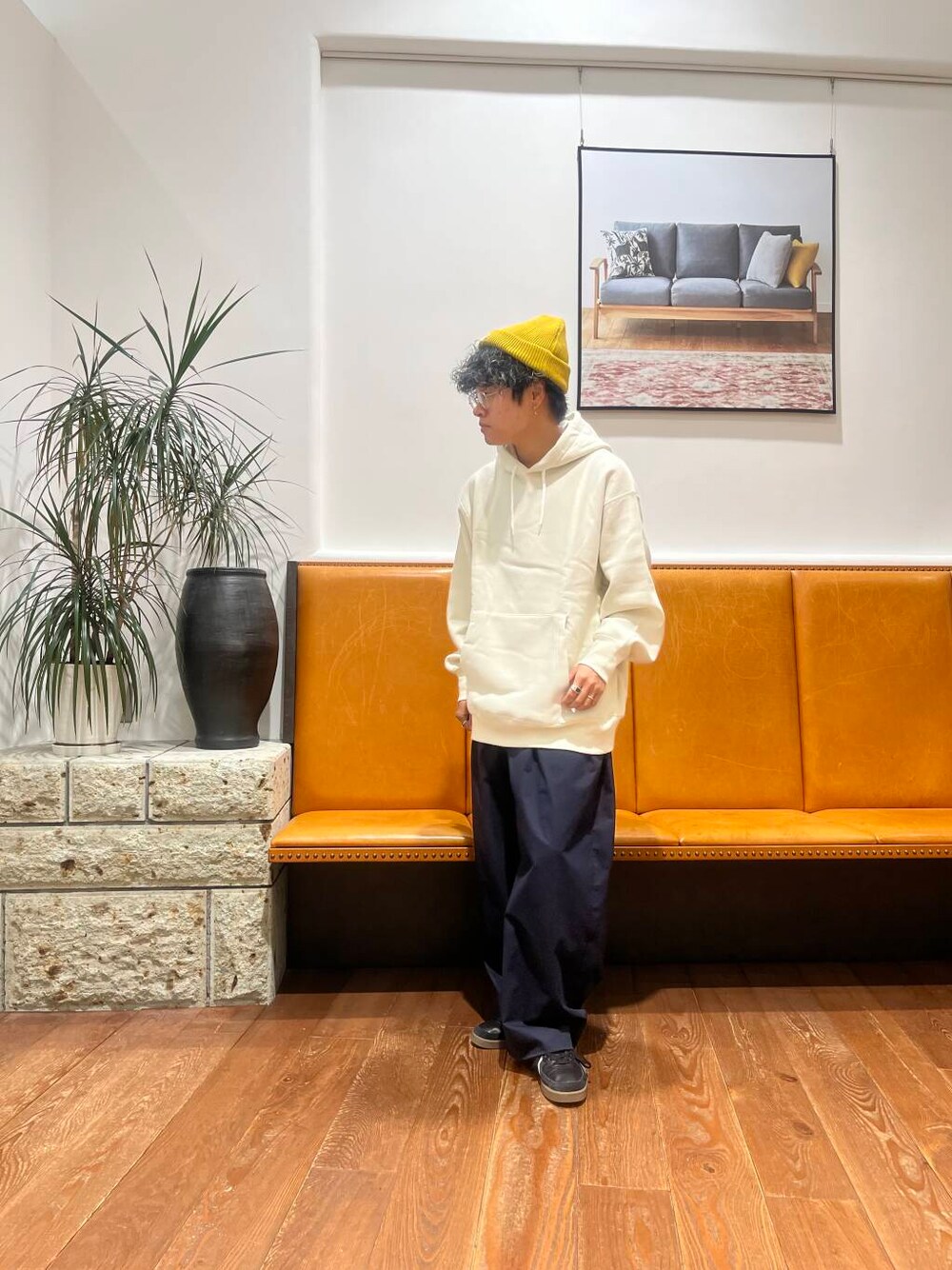 Health Knit別注のフーディです。生地がとても柔らかく、思わず触りたくなるような生地感と着心地です。ほどよくゆったりしたシルエットも良く、ワイドパンツと相性抜群です◎