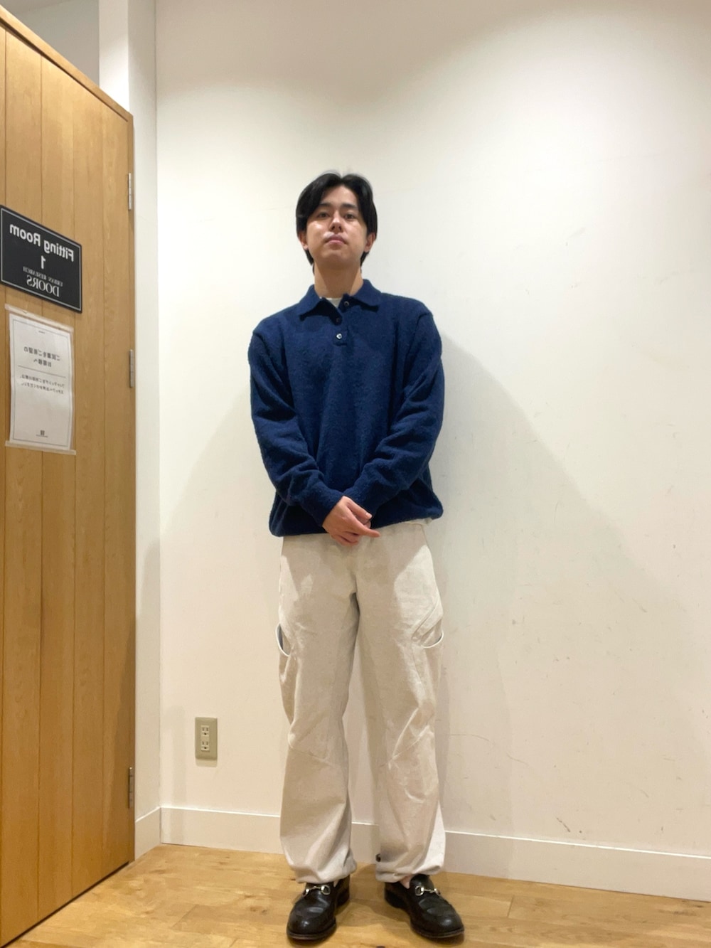 スウェットパンツのゆるさをニットポロとローファーで綺麗めに落とし込みました。