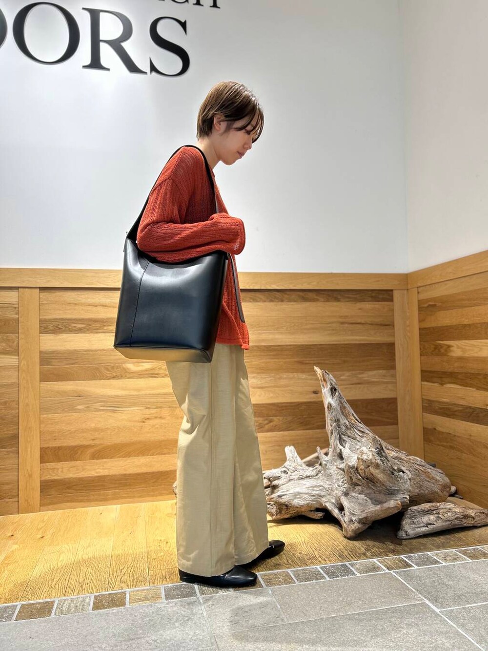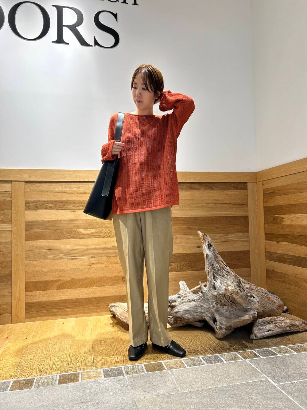 鮮やかなオレンジのニットが主役のコーディネートです。チノパンはセンタープレスでキレイめにもおすすめ。