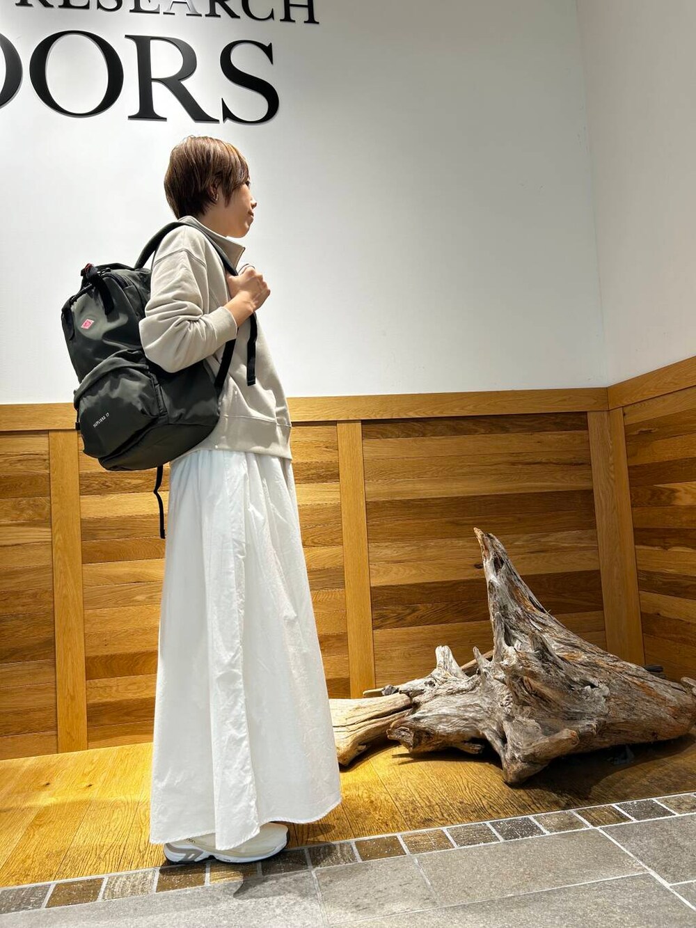 スエットに甘めスカートでミックススタイルです。リュックもポイント。
