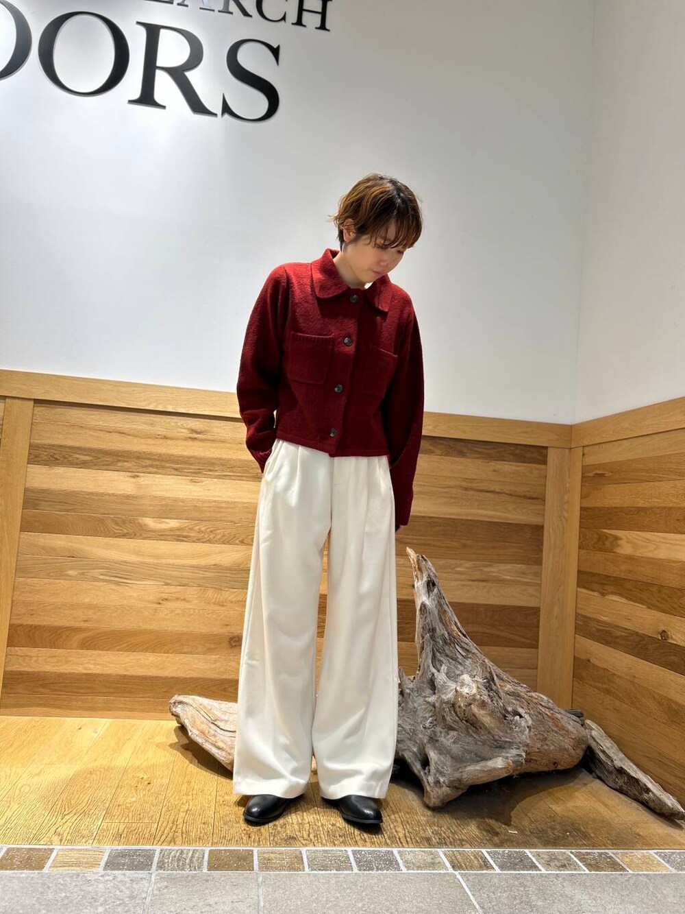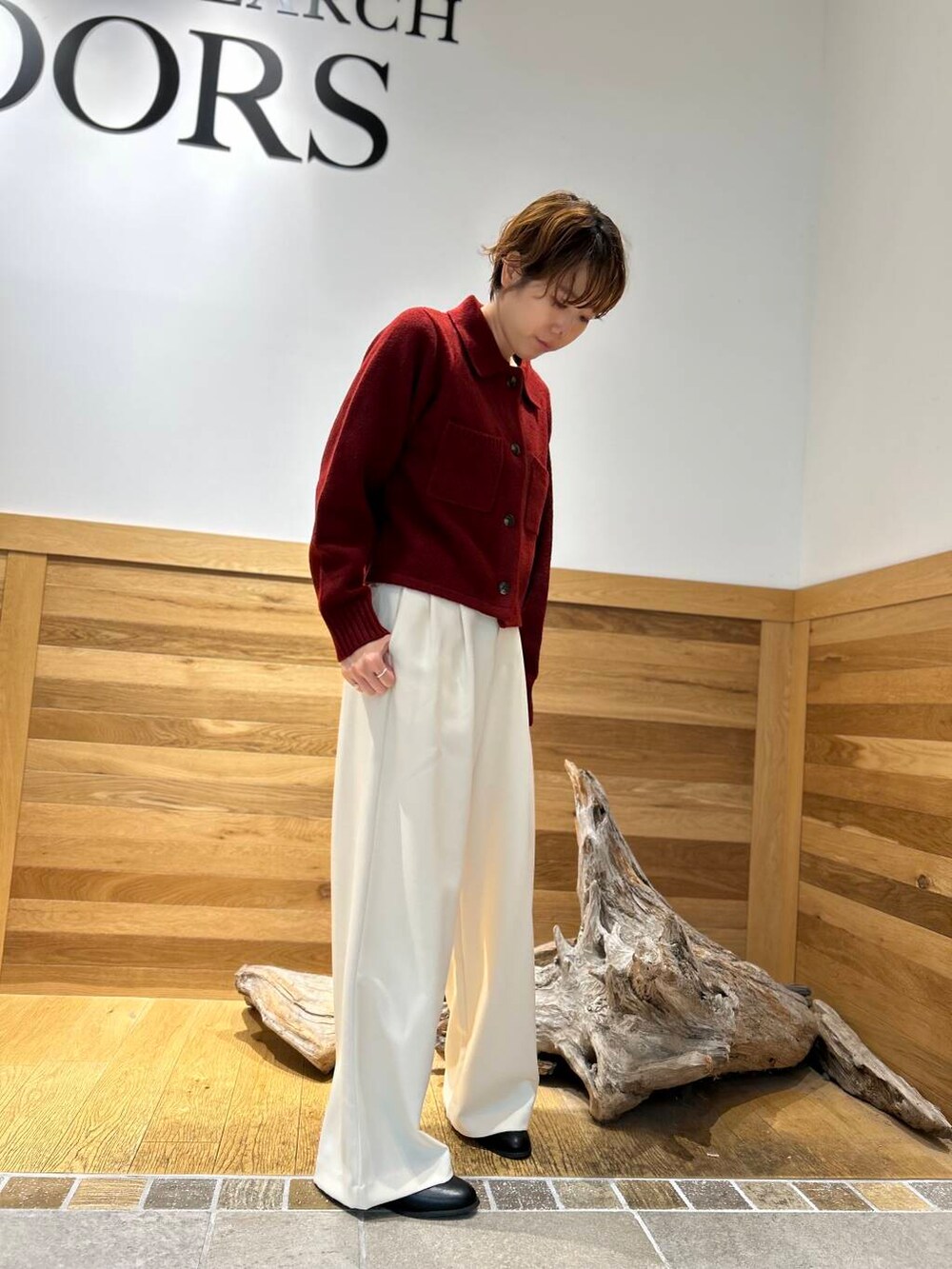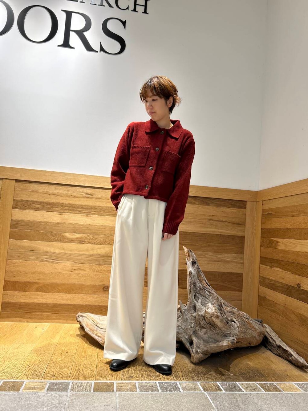 ショート丈のニットはワイドパンツと相性◎です。こっくりしたカラーで季節感を出して。