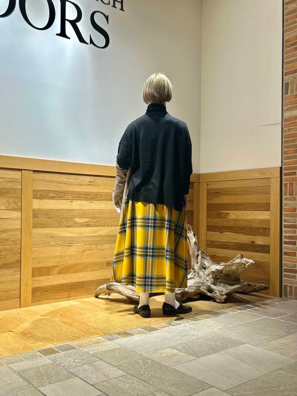オニールのチェックスカートがメインのコーデ。