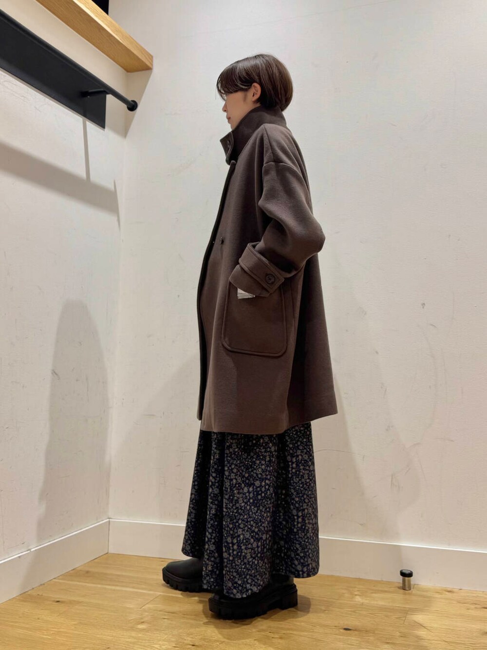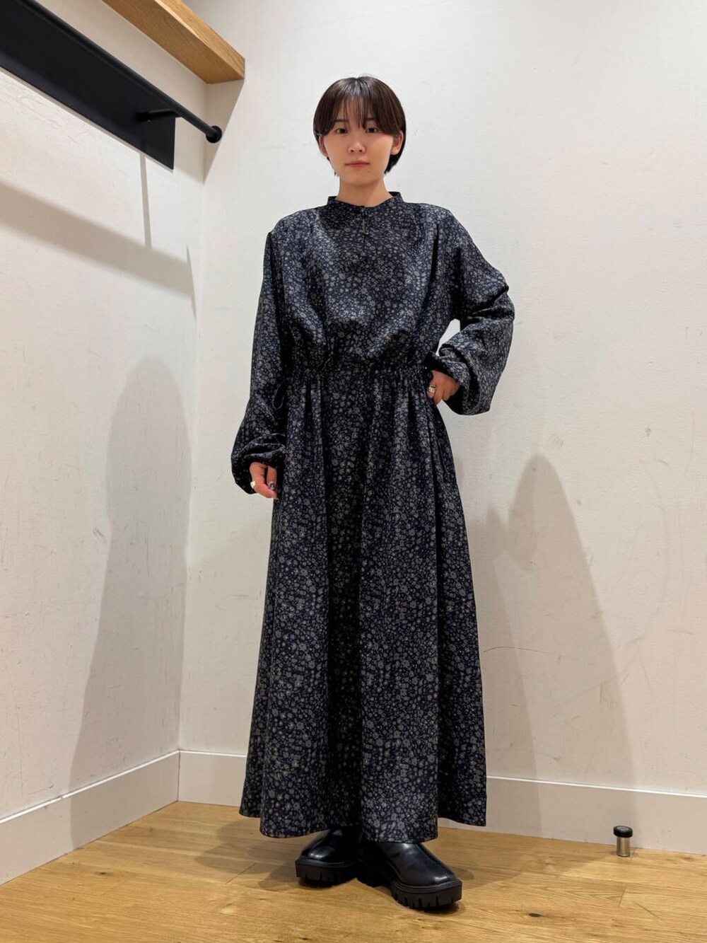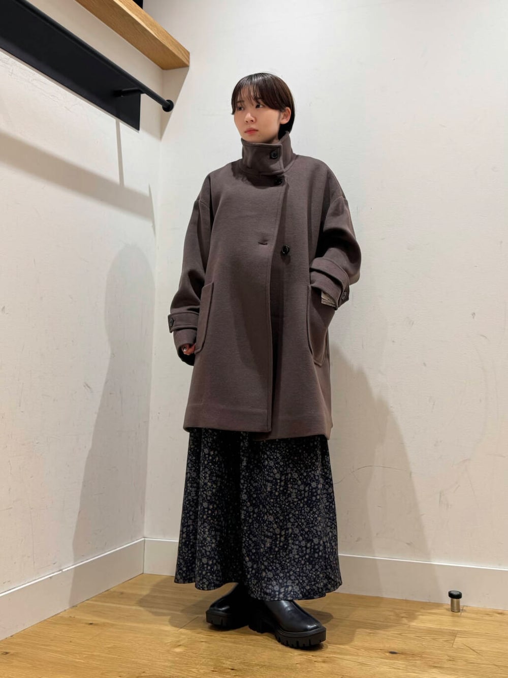 小花柄ワンピにシックなシルエットのスタンドカラーアウターを合わせて甘すぎないコーデにまとめました。