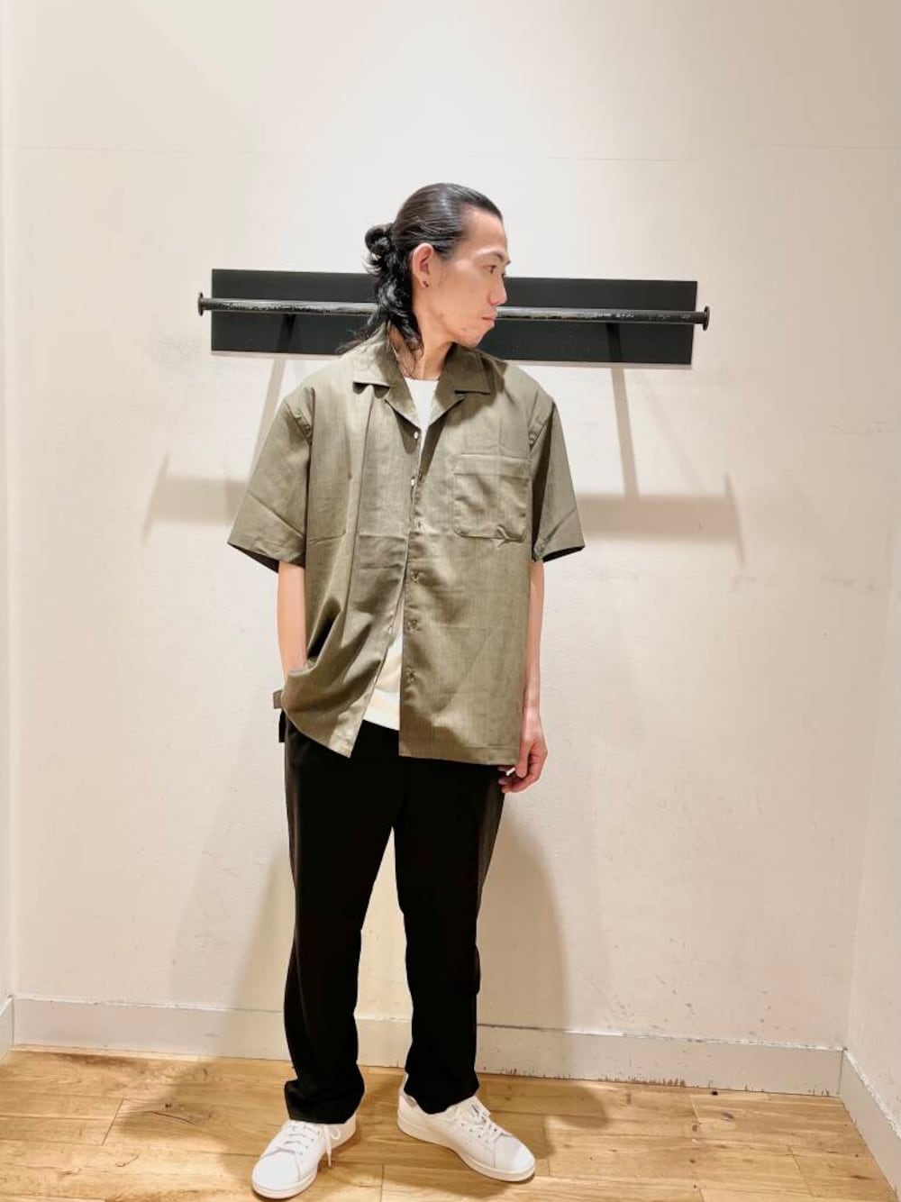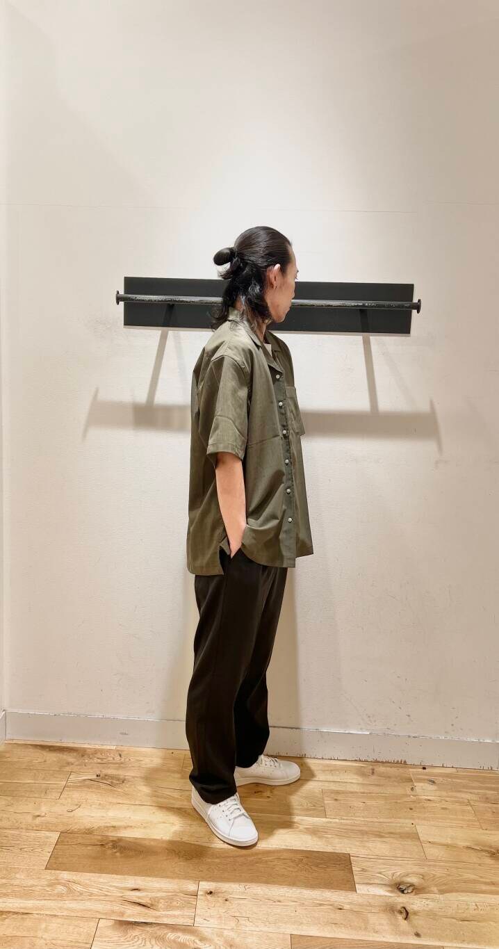 肌離れの良いドライタッチな風合いと、シルエットがキレイに出る適度なハリ感が特徴で、大きすぎずベーシックなサイズ感のオープンカラー型なのでカジュアルなパンツからキレイめなパンツまで幅広く合わせれます!