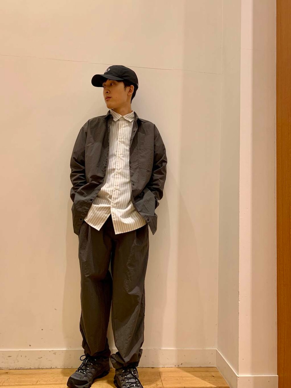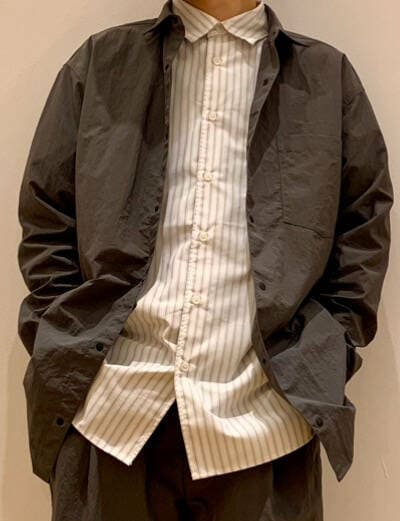 カラーはグラファイトです。全体的にオーバーなシルエットだったので引き締めるために今回はストライプのシャツを合わせてみました。