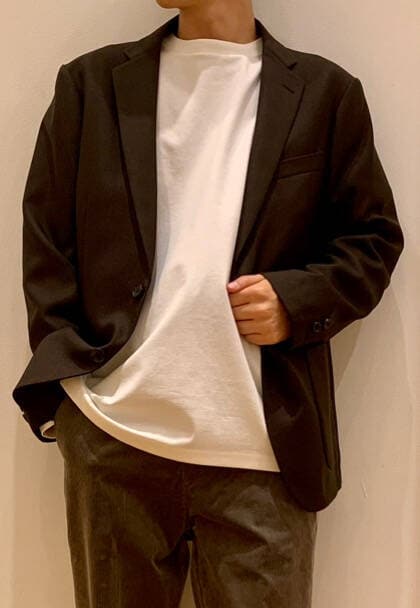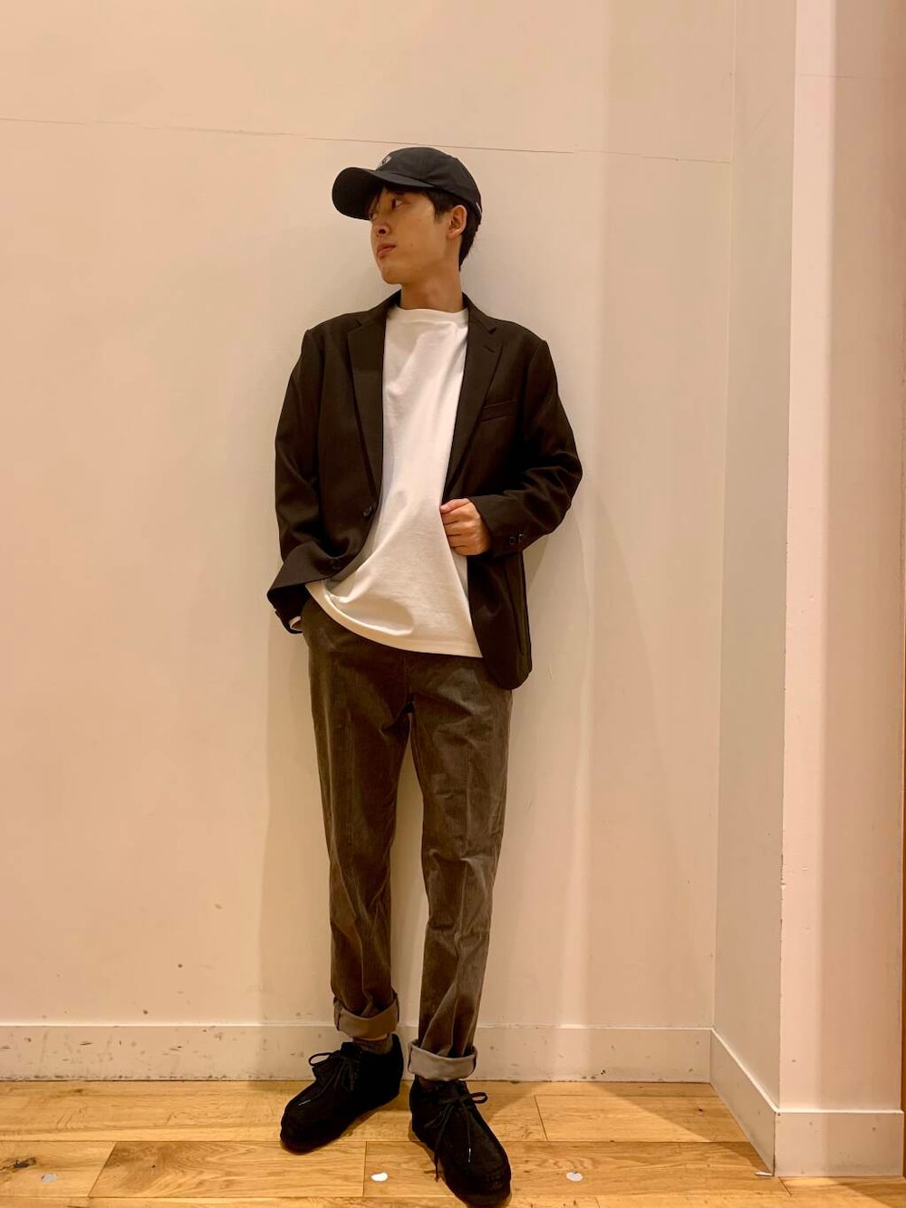 コーデュロイのパンツに少しシャリ感のあるジャケットを合わせて季節感のあるキレイ目なコーディネートになりました。