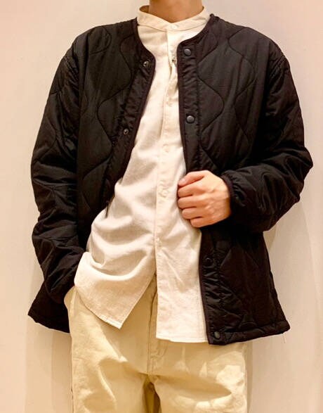 秋から冬にかけて大活躍のキルティングジャケットです。ノーカラーの為首元がすっきり見えるのでタートルネックなど合わせやすいです。