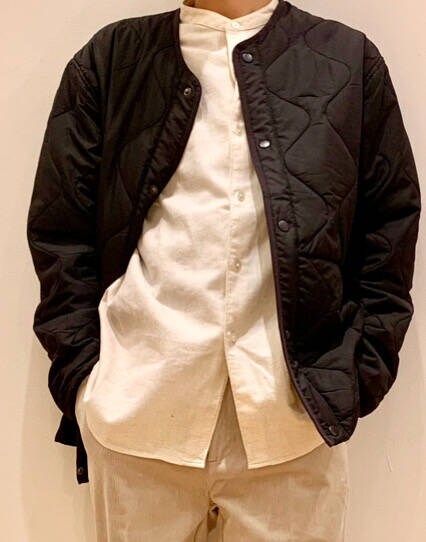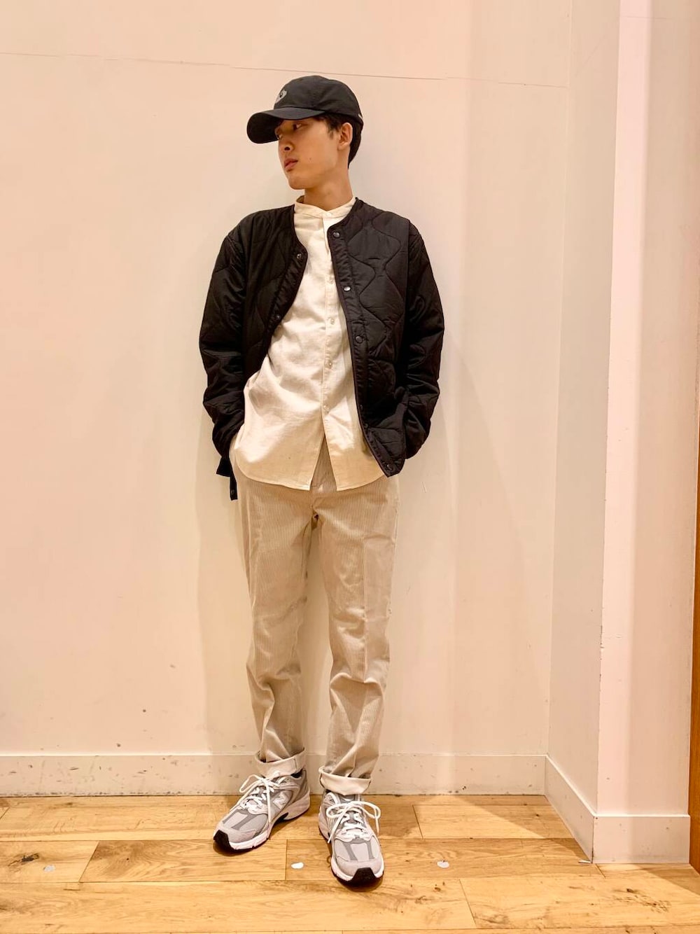 バンドカラーのシャツを合わせることですっきりとした首元になりました。コーデュロイのパンツはストレッチがかなり効いていてとても動きやすいです。